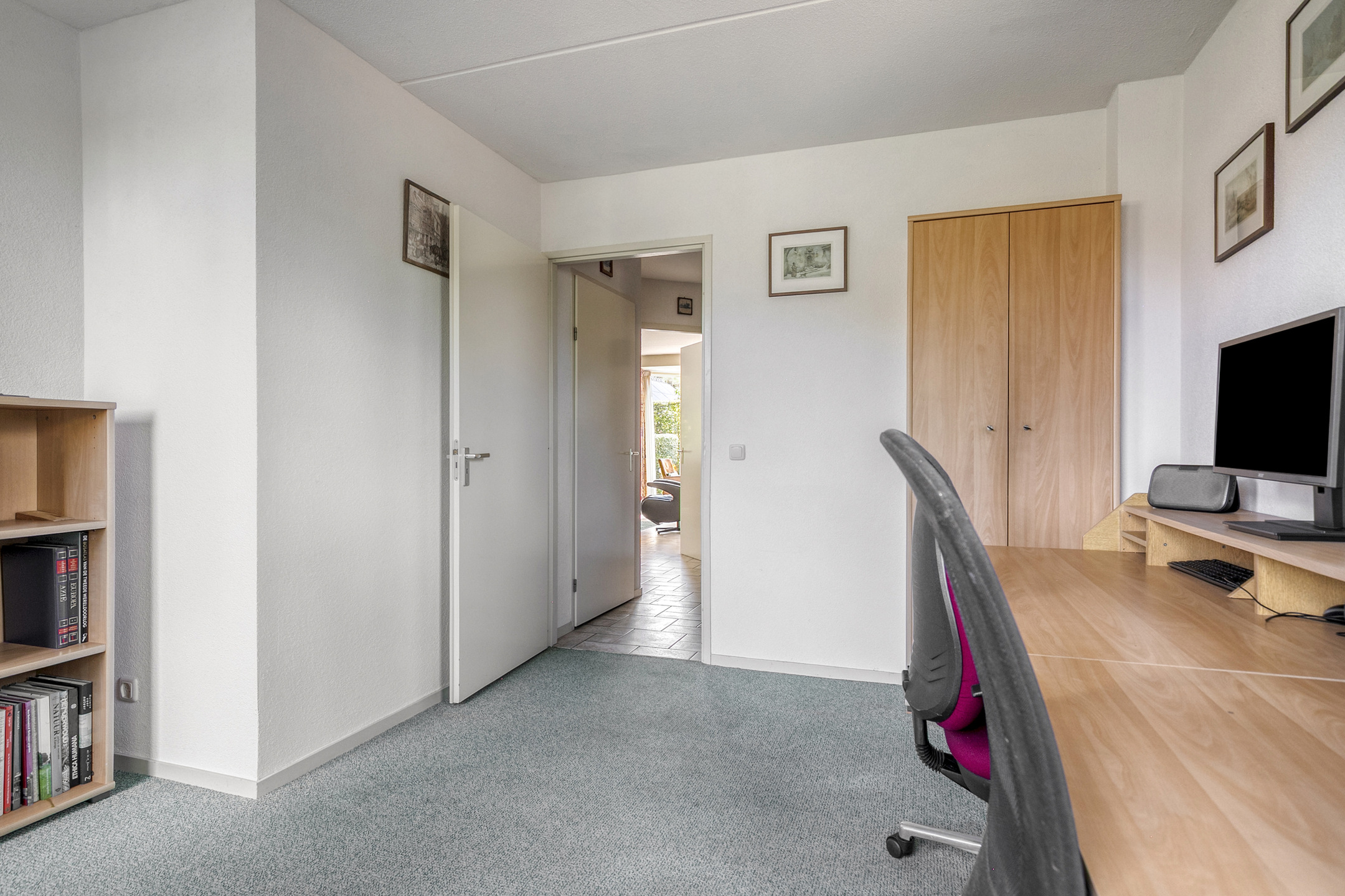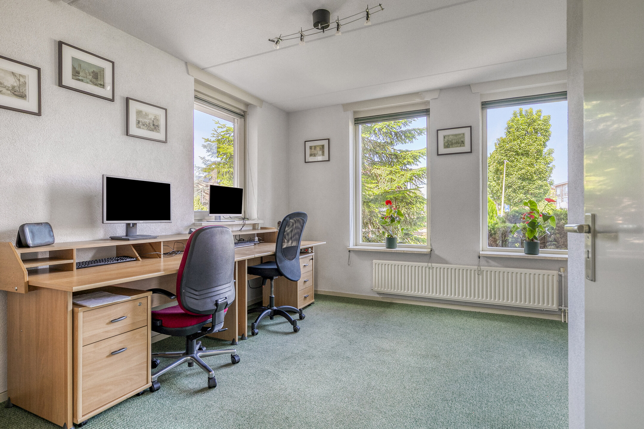 De werkkamer beschikt over vloerbedekking en een elektrisch rolluik, en biedt een rustige plek voor thuiswerken of hobby’s.