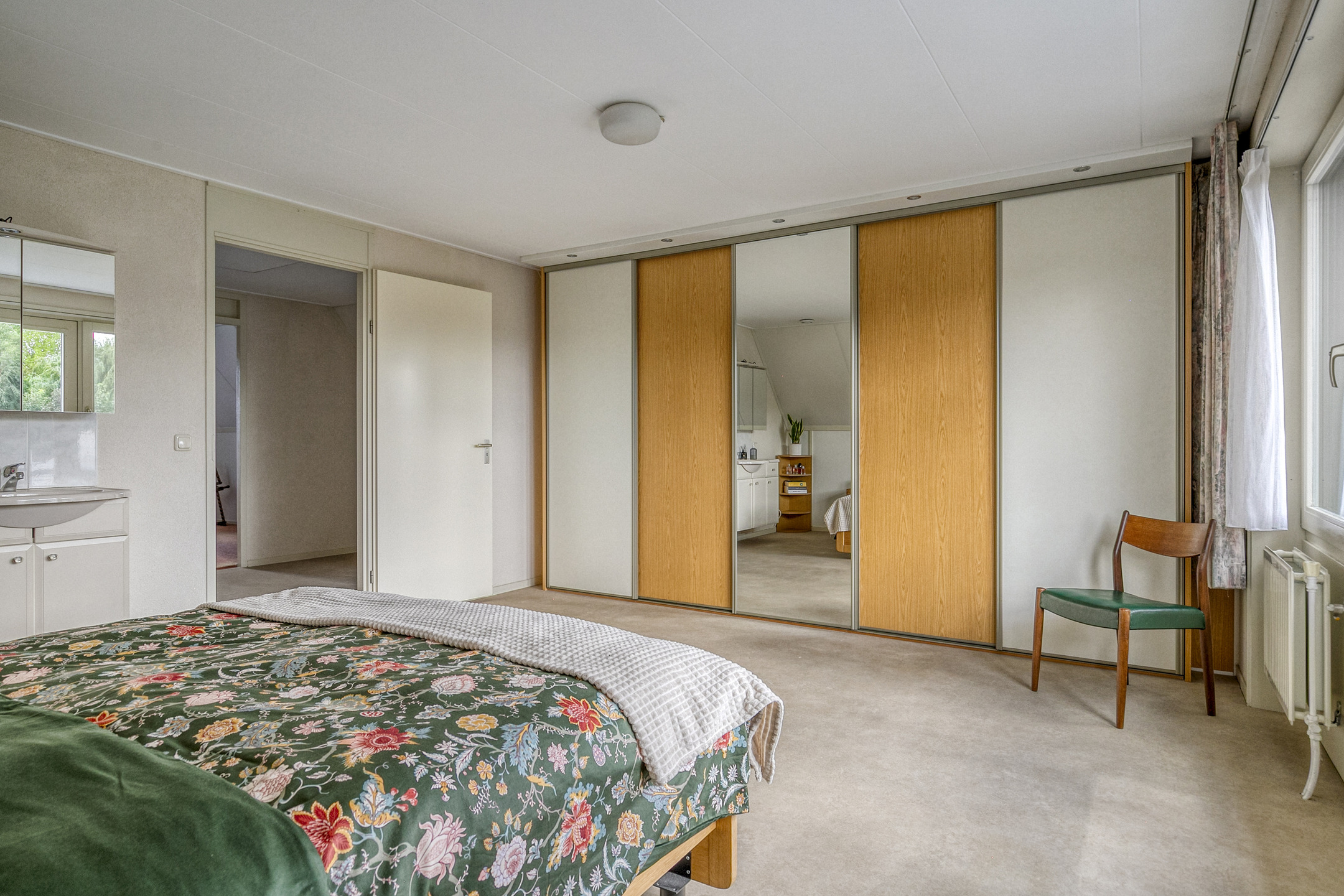 Ouderslaapkamer (achterzijde) met vaste kasten, wastafel en toegang tot het balkon met uitzicht over de tuin.