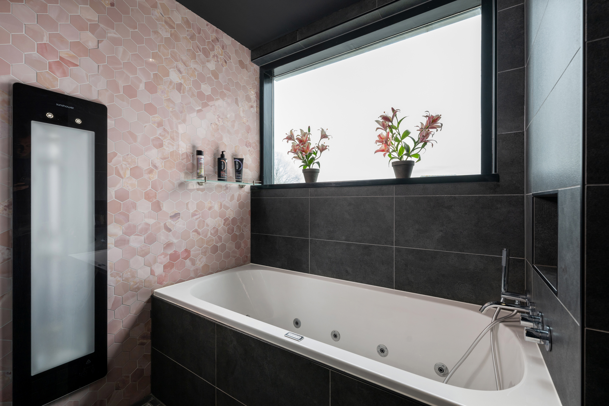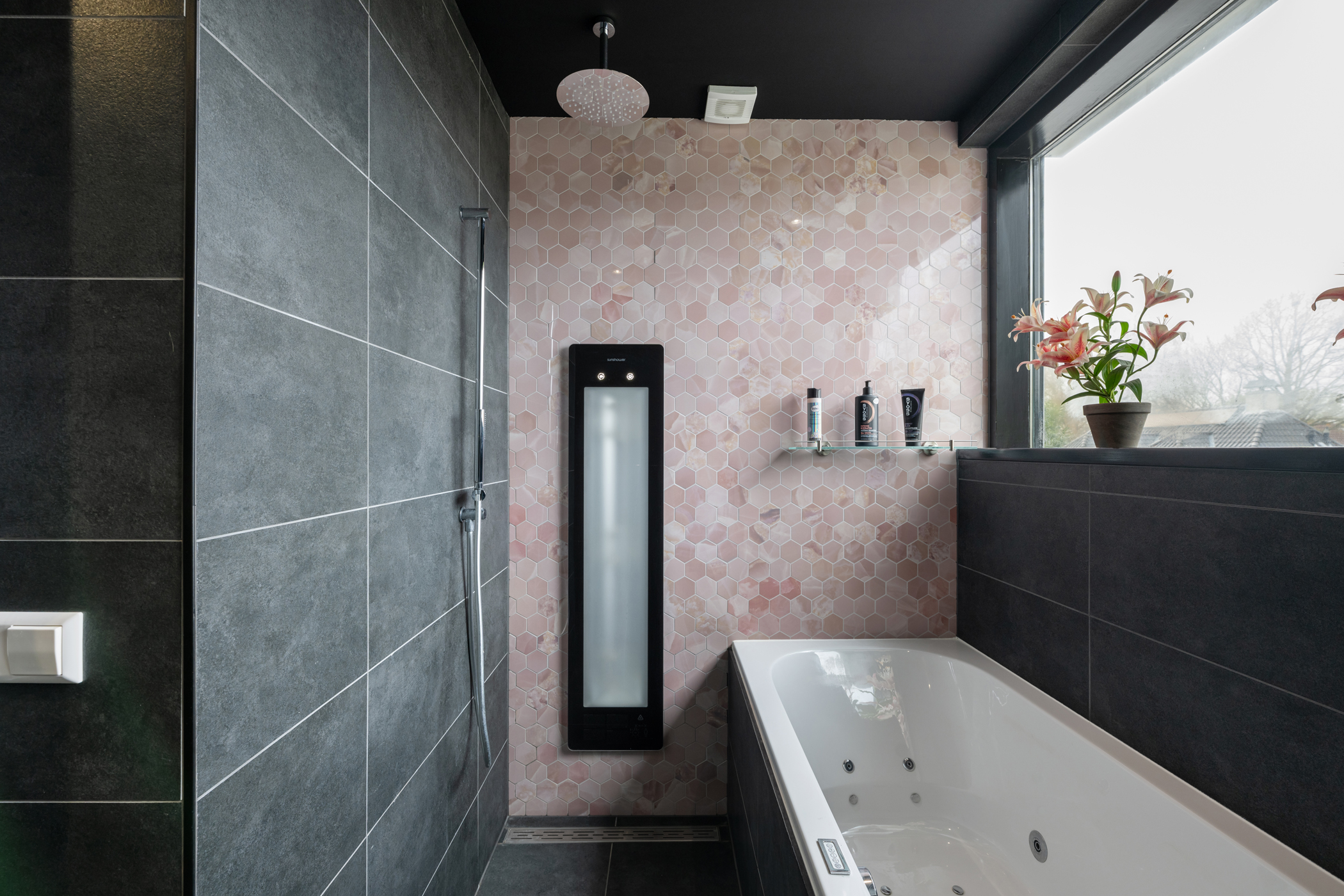 De luxe en moderne badkamer is zeer compleet uitgevoerd met een ligbad, sunshower, dubbele inloopdouche, dubbele wastafel en een verlichte spiegel.
