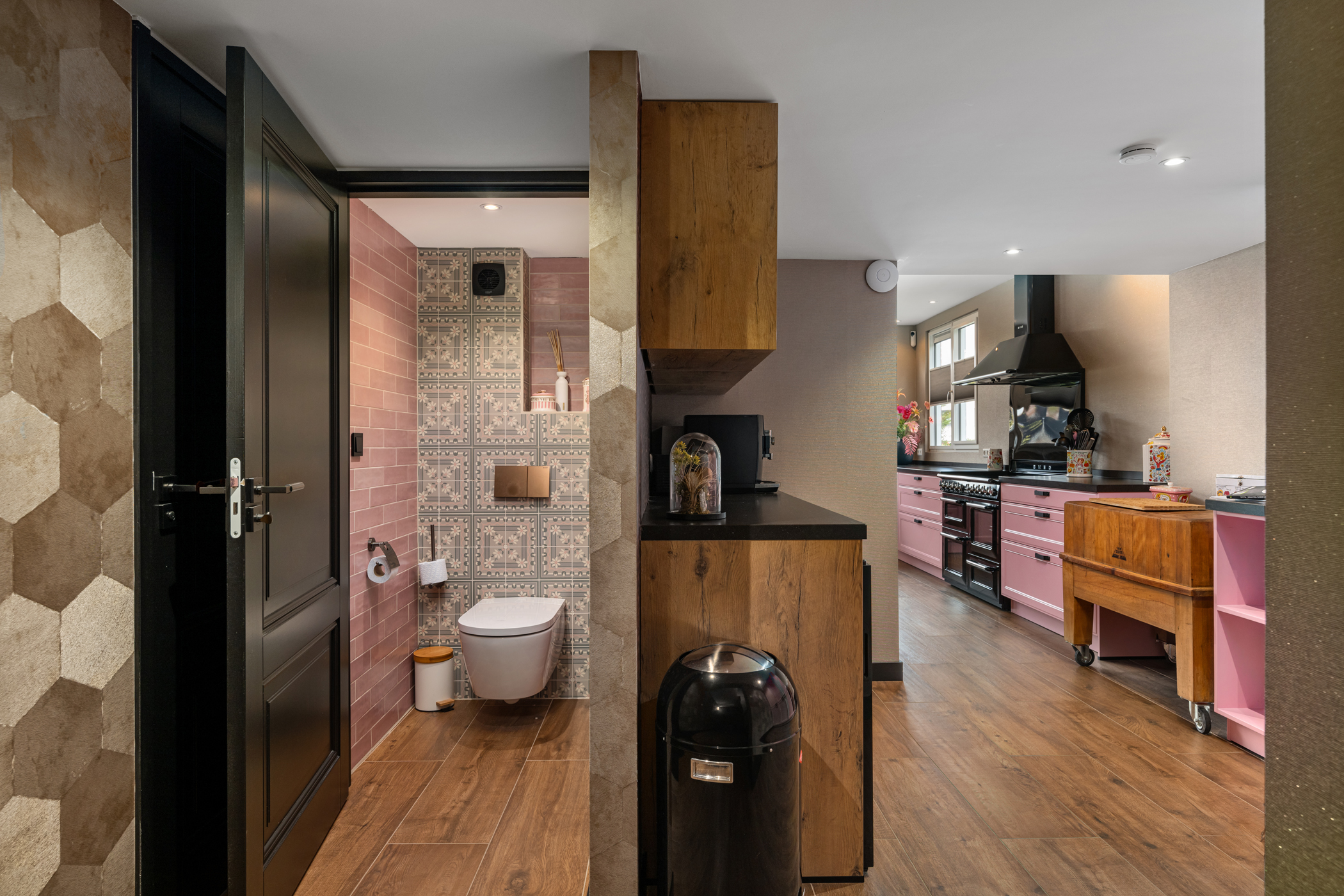 De royale woonkamer aan de voorzijde is ingedeeld in een sfeervolle zit- en eetkamer, met veel lichtinval en een warme uitstraling. Aan de achterzijde bevindt zich de zeer ruime woonkeuken, uitgevoerd met hoogwaardige inbouwapparatuur, waaronder een groot gasfornuis, twee koelkasten, twee vaatwassers, twee combi-ovens, twee stoomovens en een Quooker. Ideaal voor liefhebbers van koken en gastvrijheid.