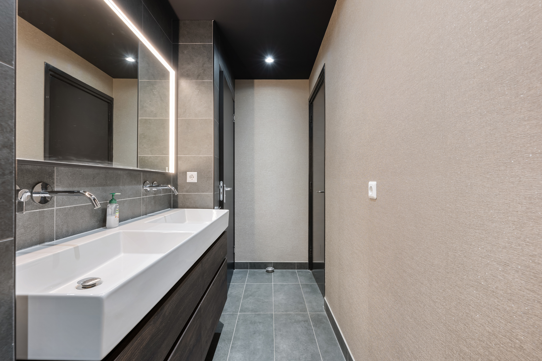 Aan de voorzijde van het souterrain bevindt zich tevens de wasruimte met dubbele aansluitingen voor wasmachines en drogers. Daarnaast is er een aparte dames en heren toilet met urinoir aanwezig.