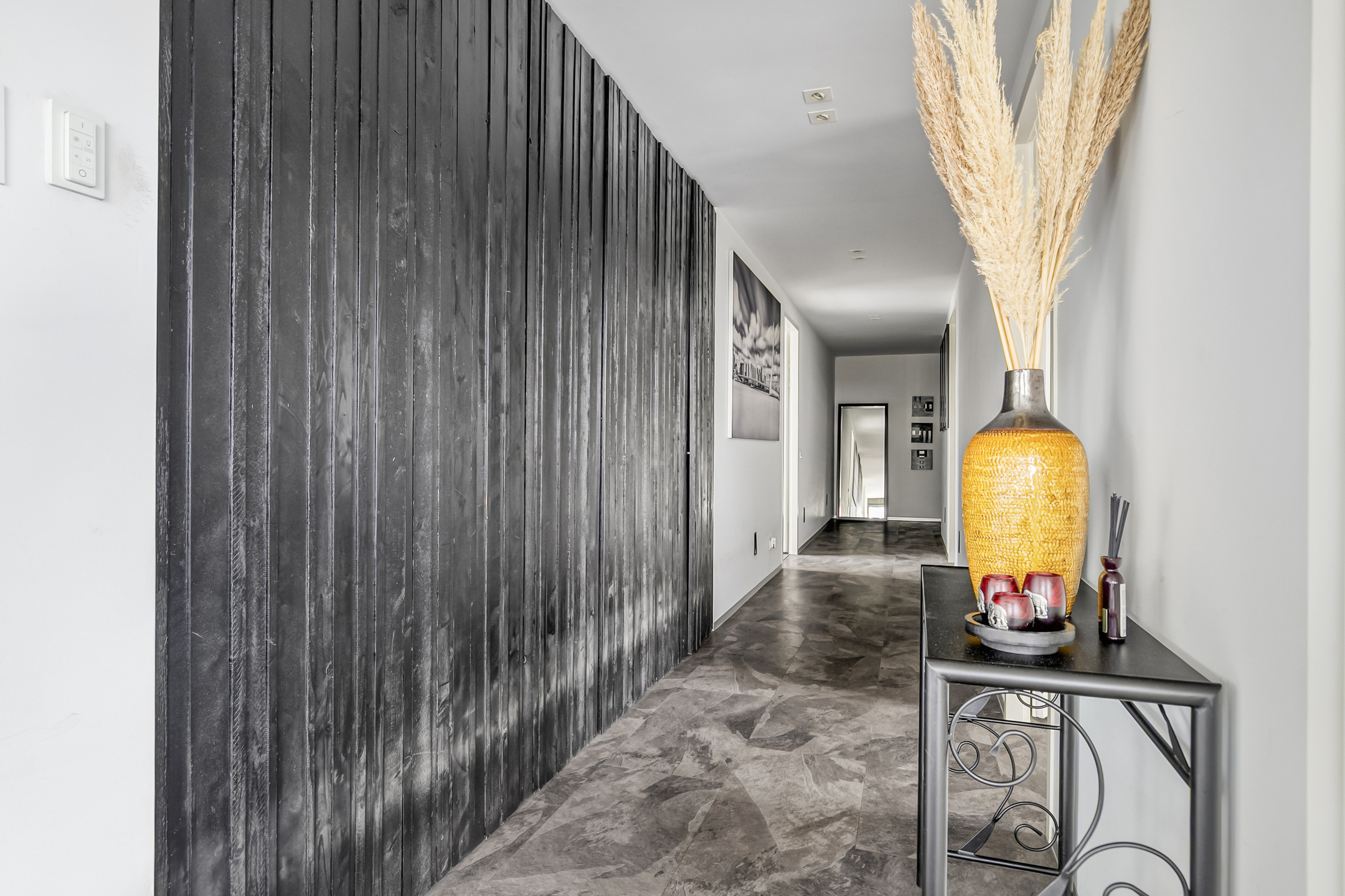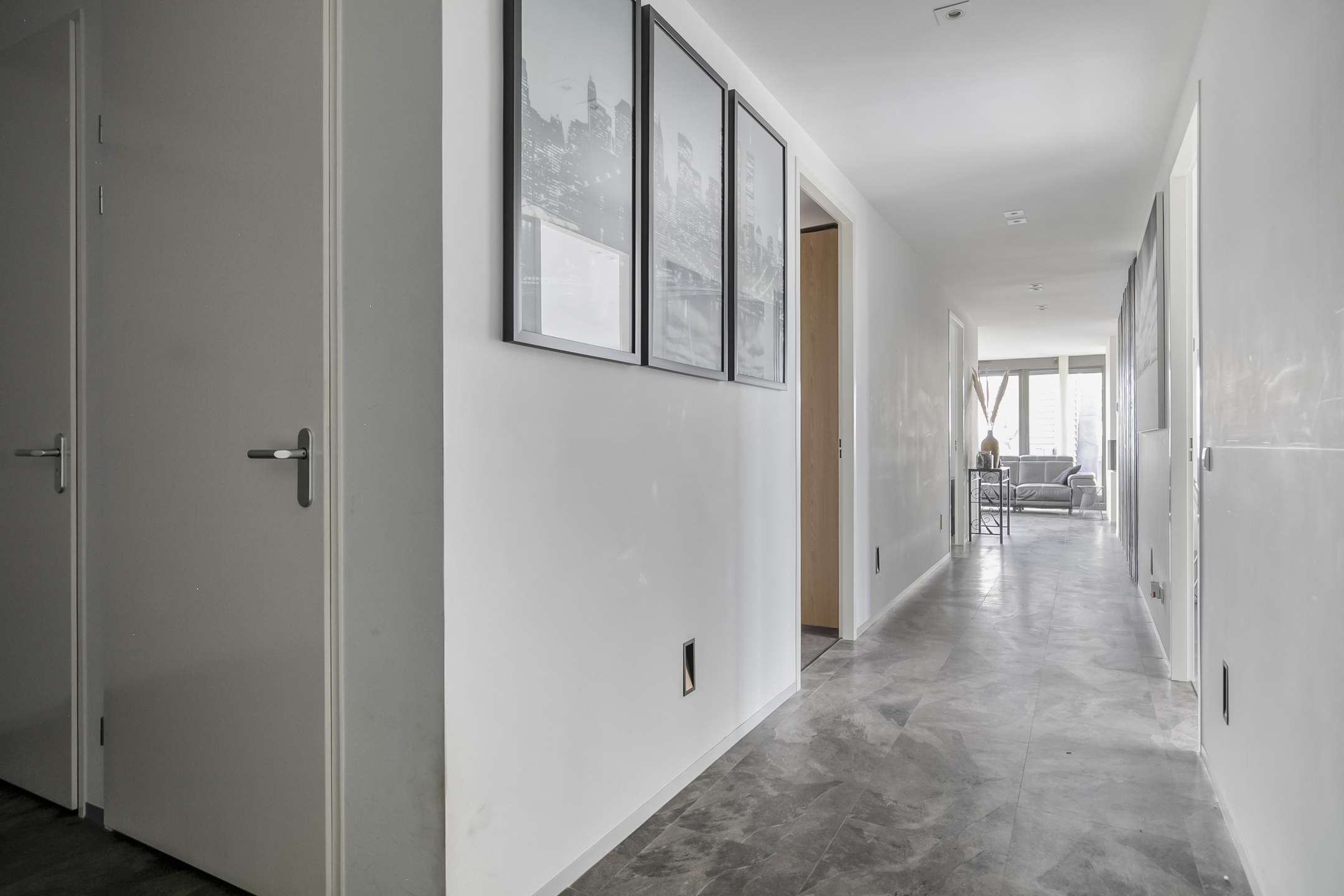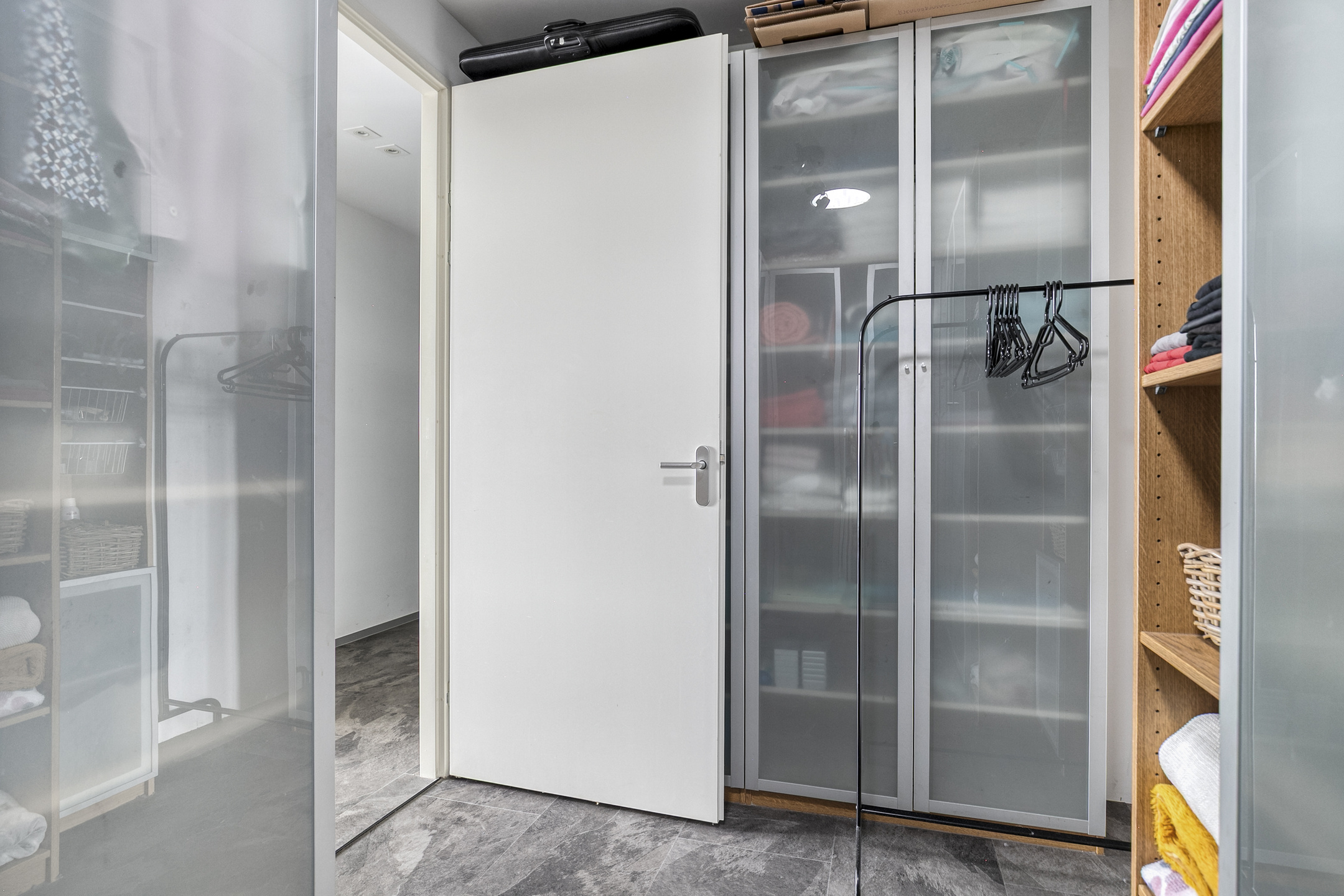 Afgesloten hoofdentree met lift naar de 4e verdieping. Inpandige toegang tot het penthouse, ruime hal met toilet, wasruimte, toegang tot alle vertrekken en een grote inbouwkast.