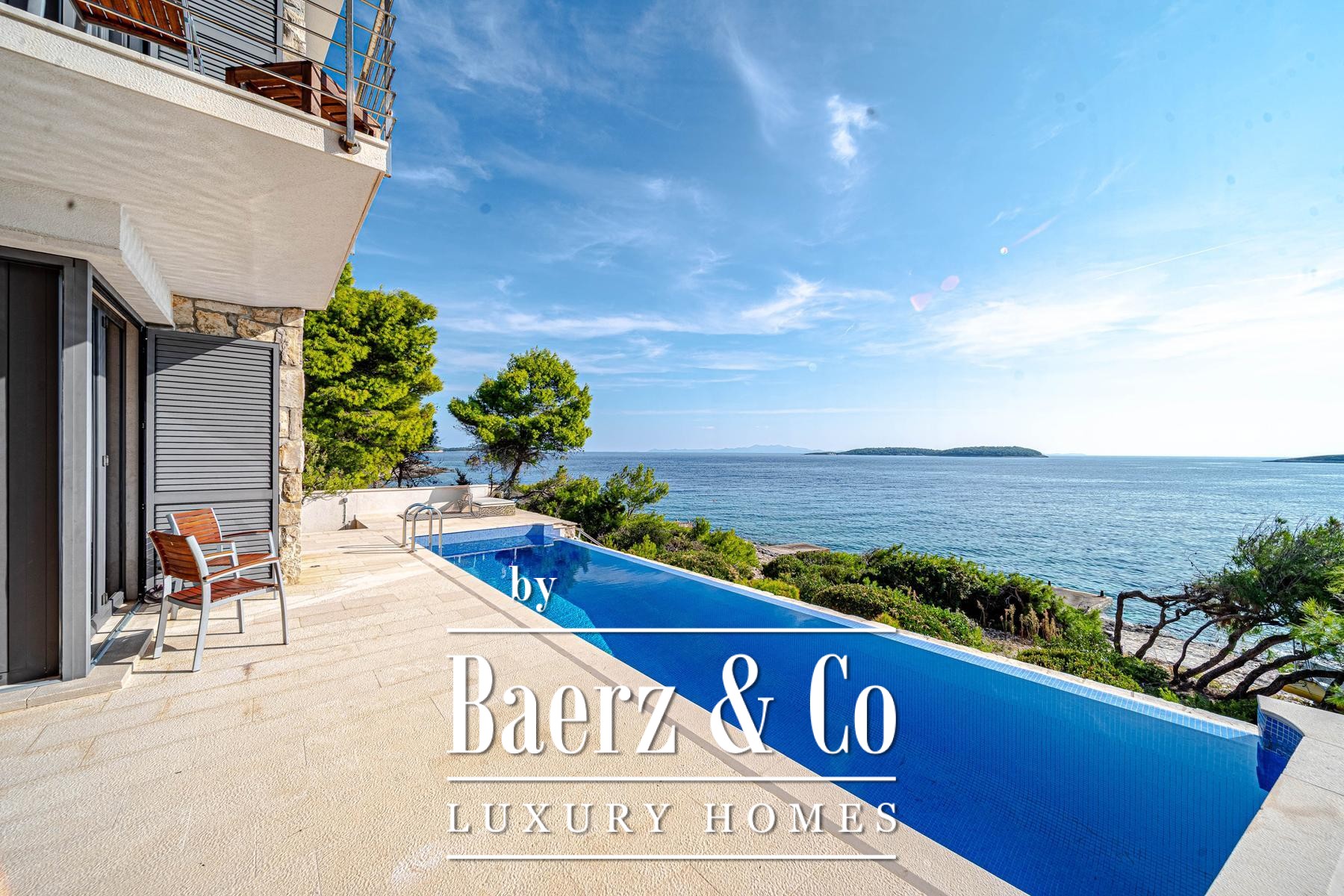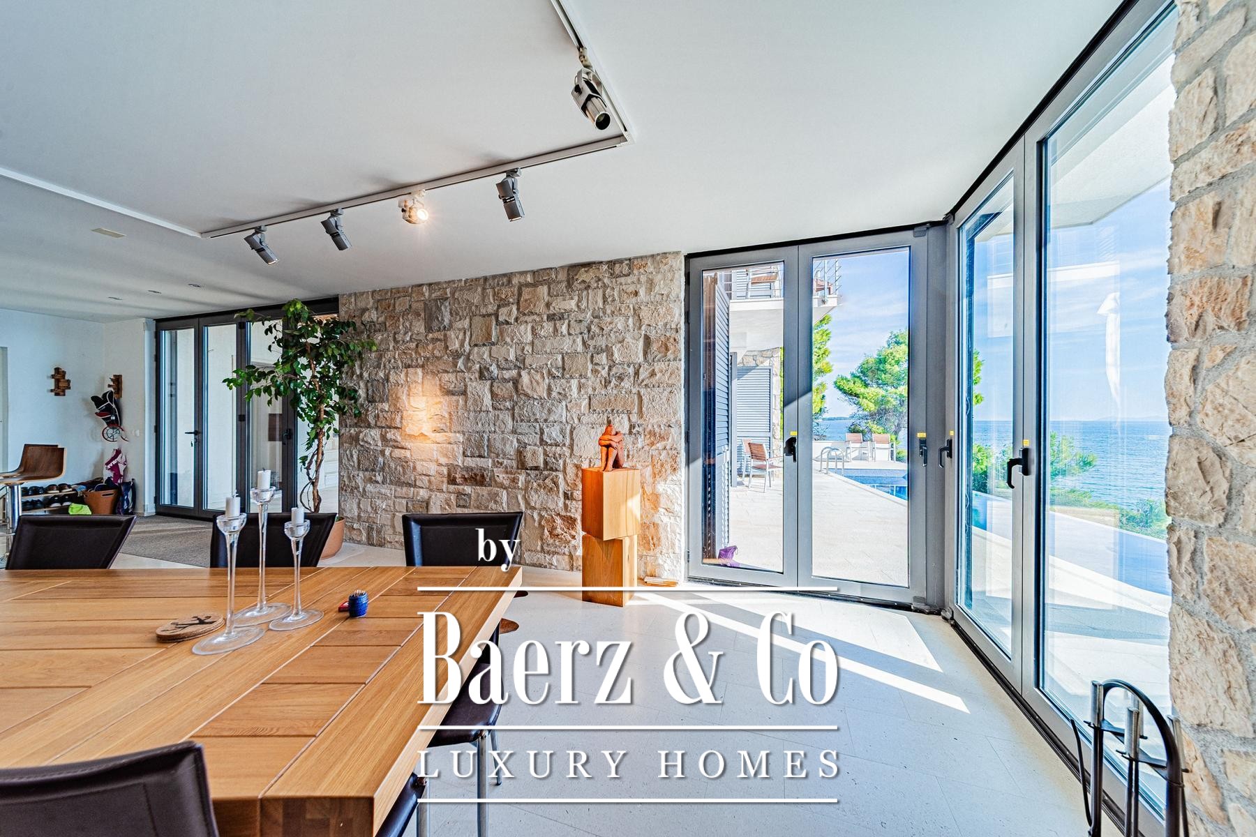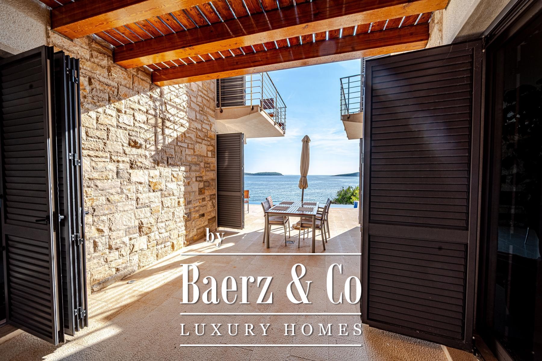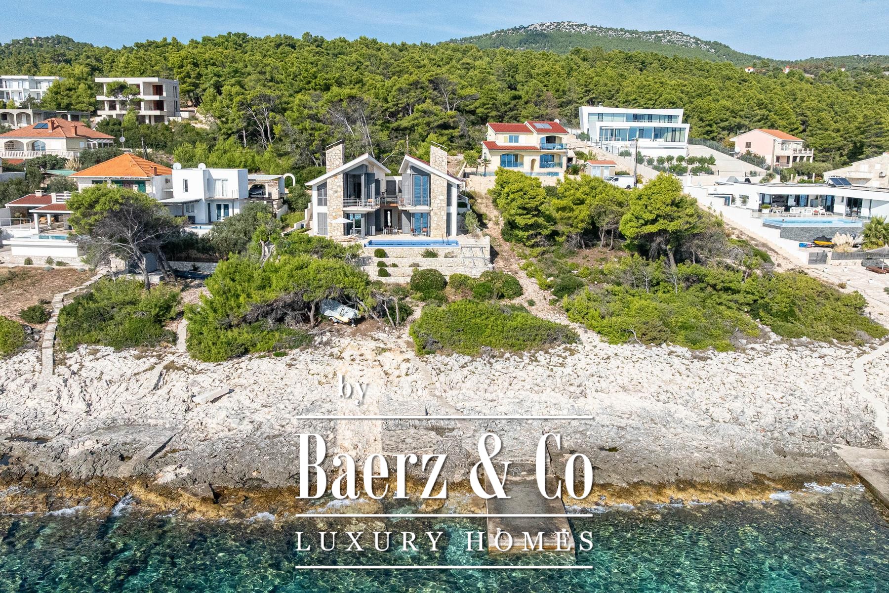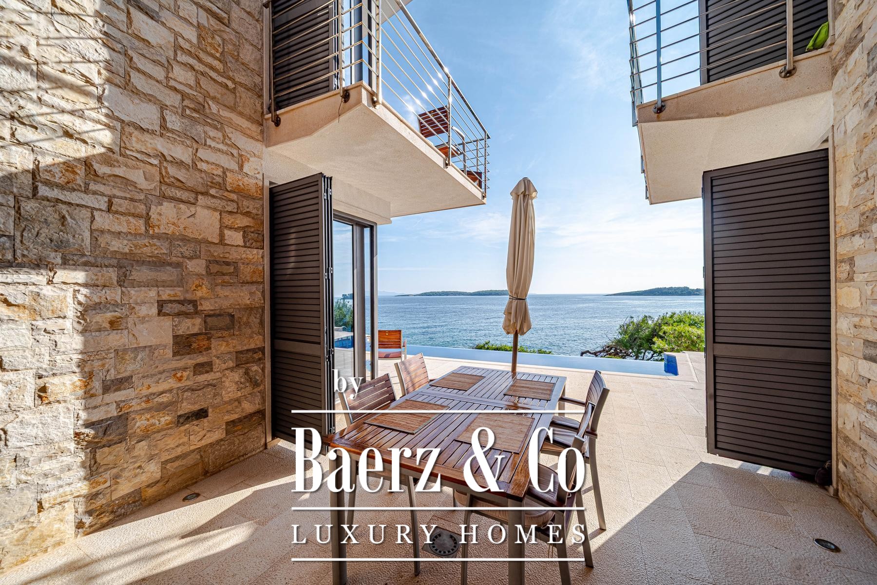 Deze villa Blato ligt direct aan de kust van Kroatië en biedt 260 m² aan binnenruimte op een perceel van 500 m². Architectonische helderheid kenmerkt de residentie, die bestaat uit twee zelfstandige units verbonden door ruime terrassen, waarbij elke unit functioneert als een volwaardig huis. Op de begane grond bevinden zich in beide units gecombineerde leef-, eet- en keukenzones; op de verdieping beschikt elke unit over twee slaapkamers, allen met en suite badkamers en een privéterras.
