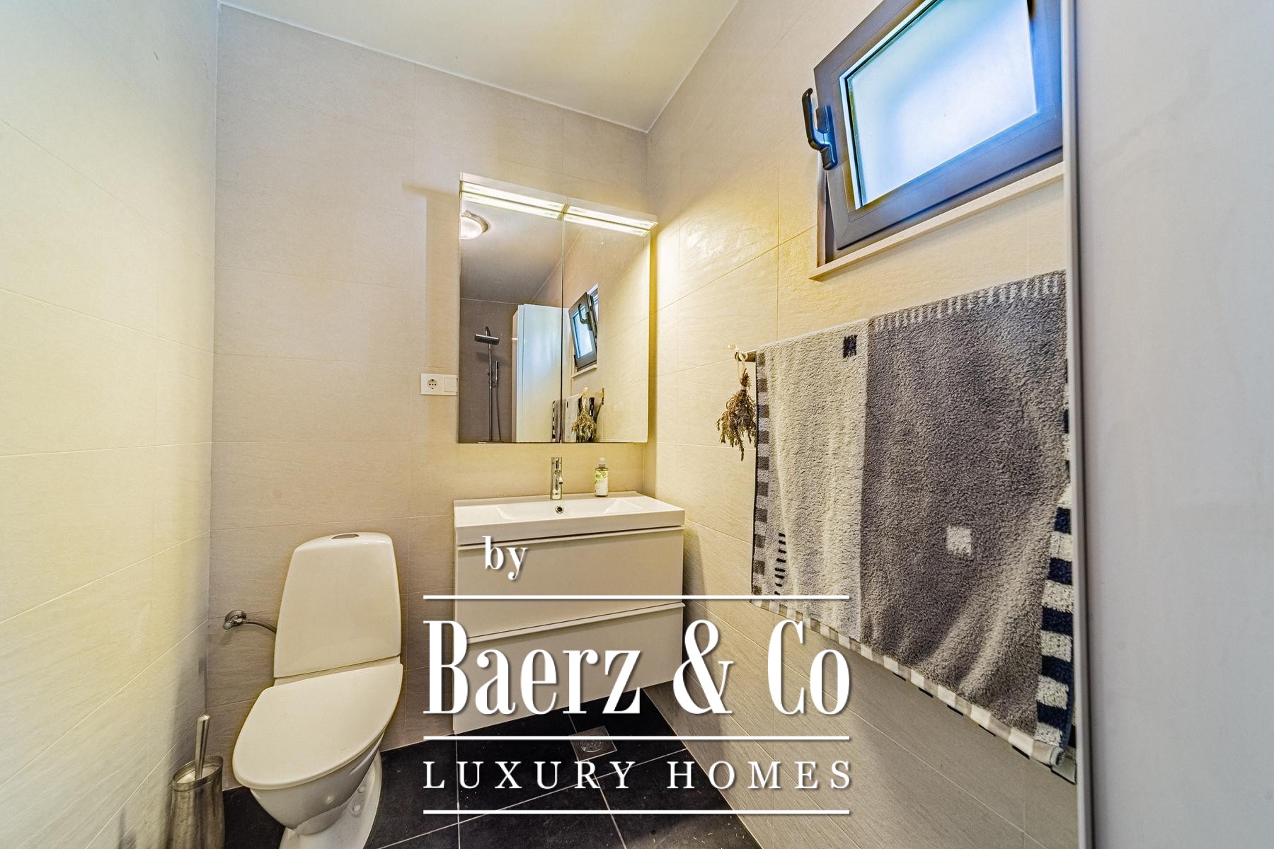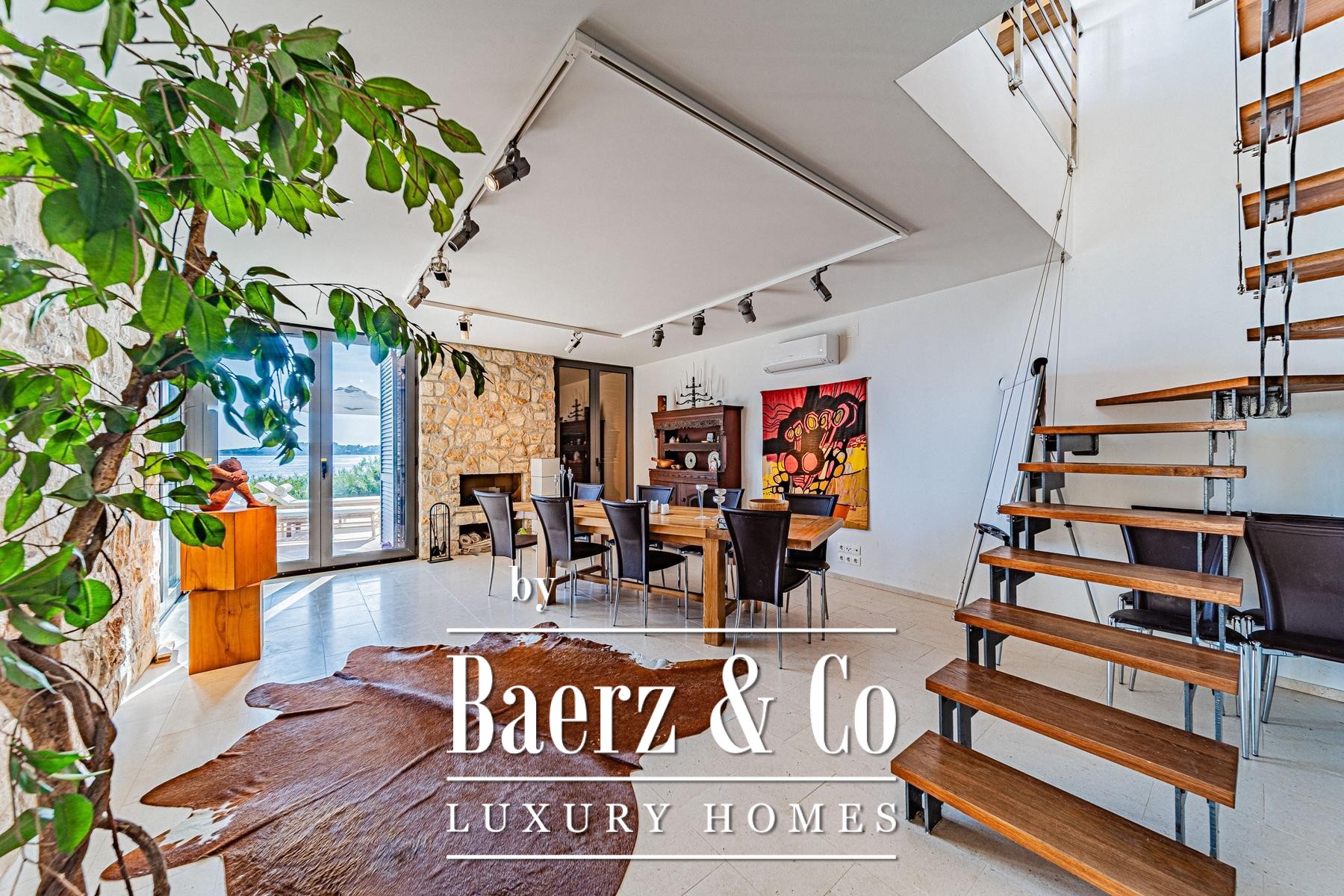 Het landschap voor de villa is vormgegeven met licht natuursteen, een zwembad en specifieke zones voor zonnebaden, alles ontworpen voor moeiteloos wonen aan zee. Via een voetpad bereikt u binnen 15 meter het water, waar een kleine aanlegsteiger ruimte biedt voor het afmeren van een boot en een eigen plek om tot rust te komen. Overal in de villa zijn hoogwaardige materialen en verfijnde afwerkingen gekozen die getuigen van een subtiele exclusiviteit.