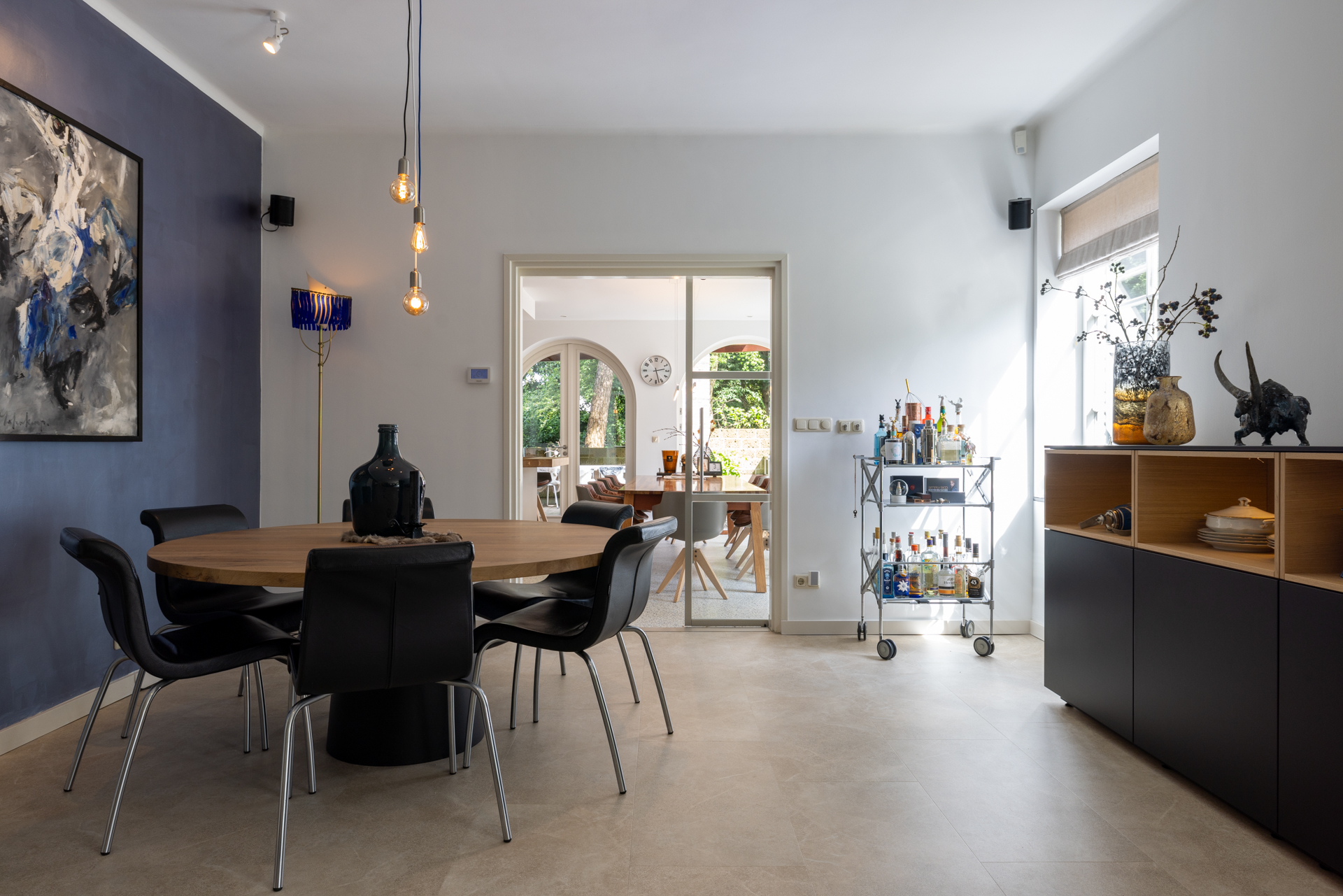 De woonkeuken heeft een gashaard, royaal eetgedeelte en dubbele openslaande deuren naar de tuin. Dit geeft een mooie connectie met de tuin en de buitenkeuken. Hier haalt u buiten naar binnen.
