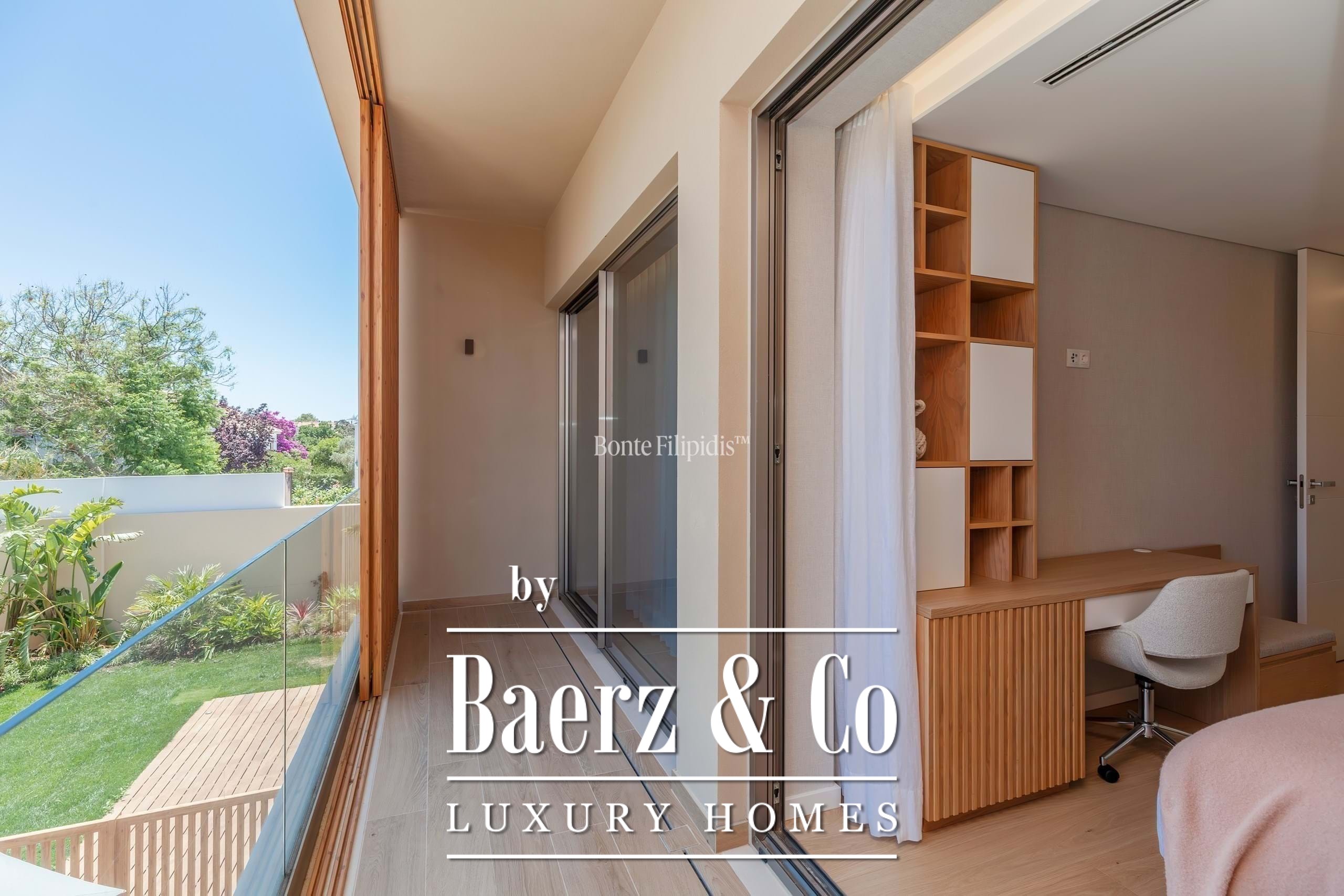 De woning beschikt over vier slaapkamers en vijf badkamers. De suite op de begane grond verwelkomt gasten of leent zich uitstekend als werkruimte. De hoofdsuite op de eerste verdieping is voorzien van een inloopkast; verder zijn er twee extra slaapkamers en een badkamer. Licht valt rijkelijk binnen in de royale, open leefruimte waar wonen, dineren en koken naadloos in elkaar overlopen. Miele apparatuur, een BORA kookplaat, een wijnkoelkast en een vrijstaande wasruimte zorgen voor verfijning in het dagelijks ritme.