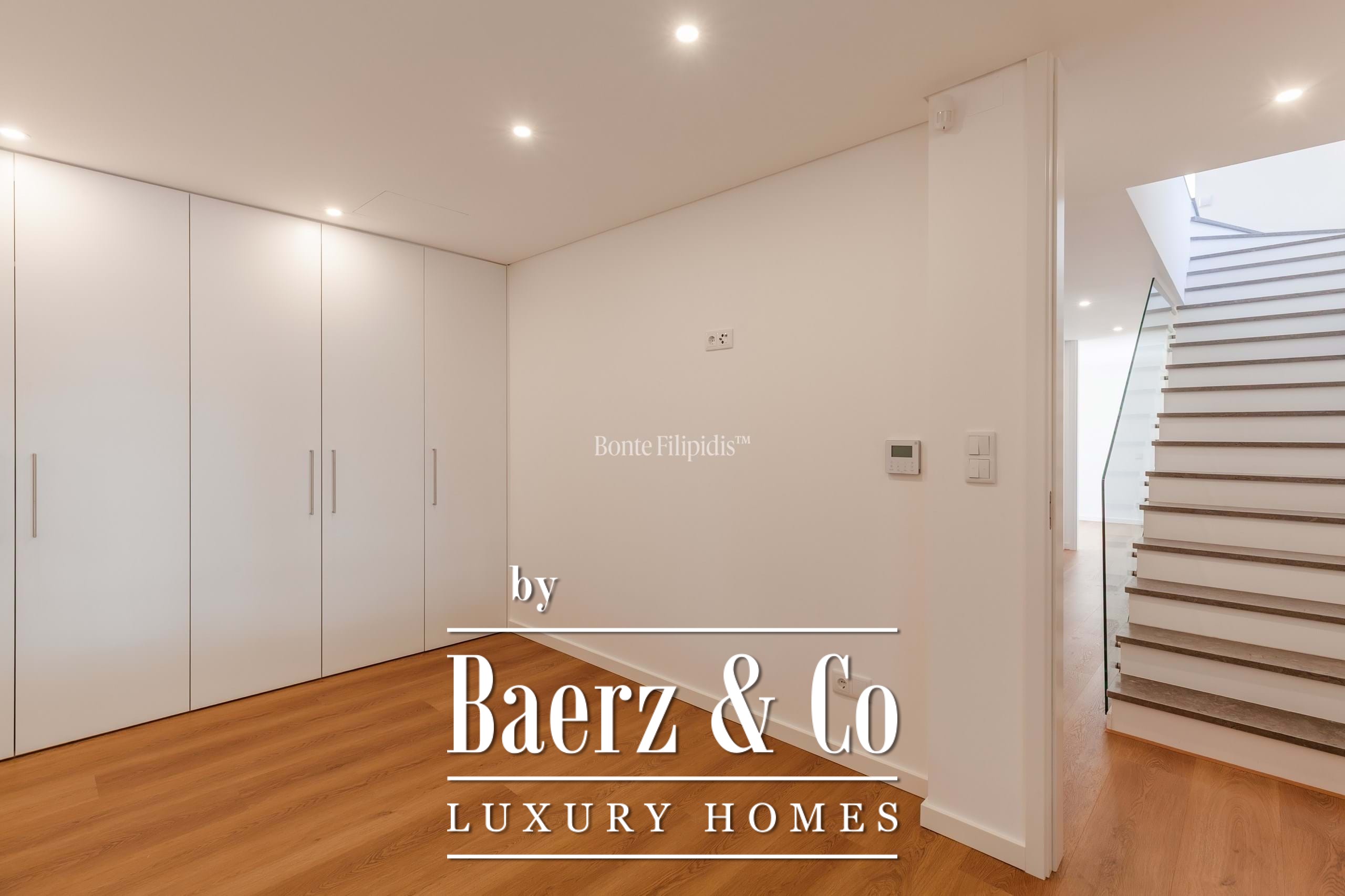 De bovenste verdieping beschikt over een multifunctionele ruimte met complete badkamer, die leidt naar een privéterras; een discreet toevluchtsoord boven de omgeving. De woning is uitgerust met zonnepanelen en elektrische vloerverwarming in de badkamers. Voorbereidingen voor het opladen van elektrische voertuigen, evenals een garage voor drie auto's sluiten aan bij hedendaagse wensen.