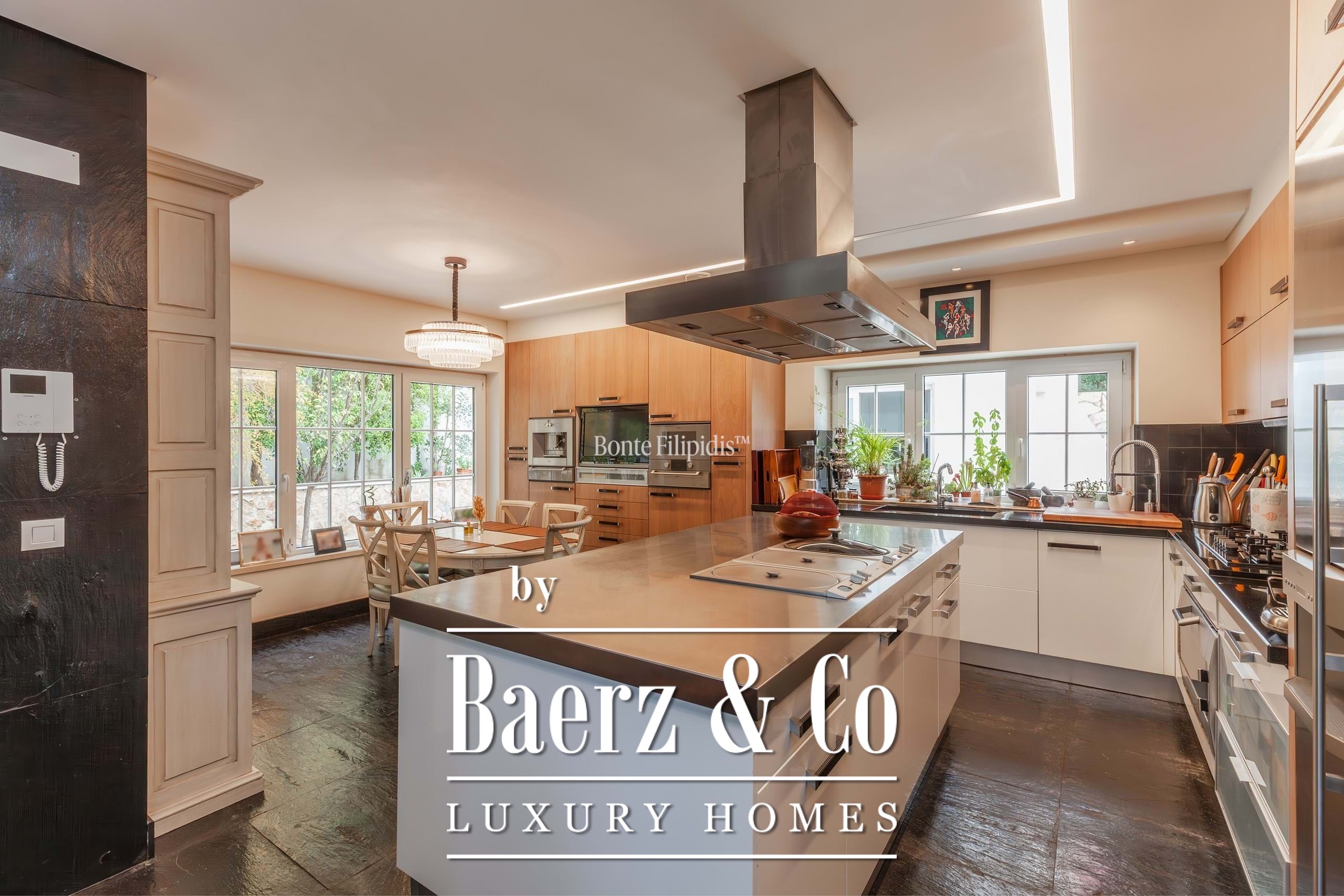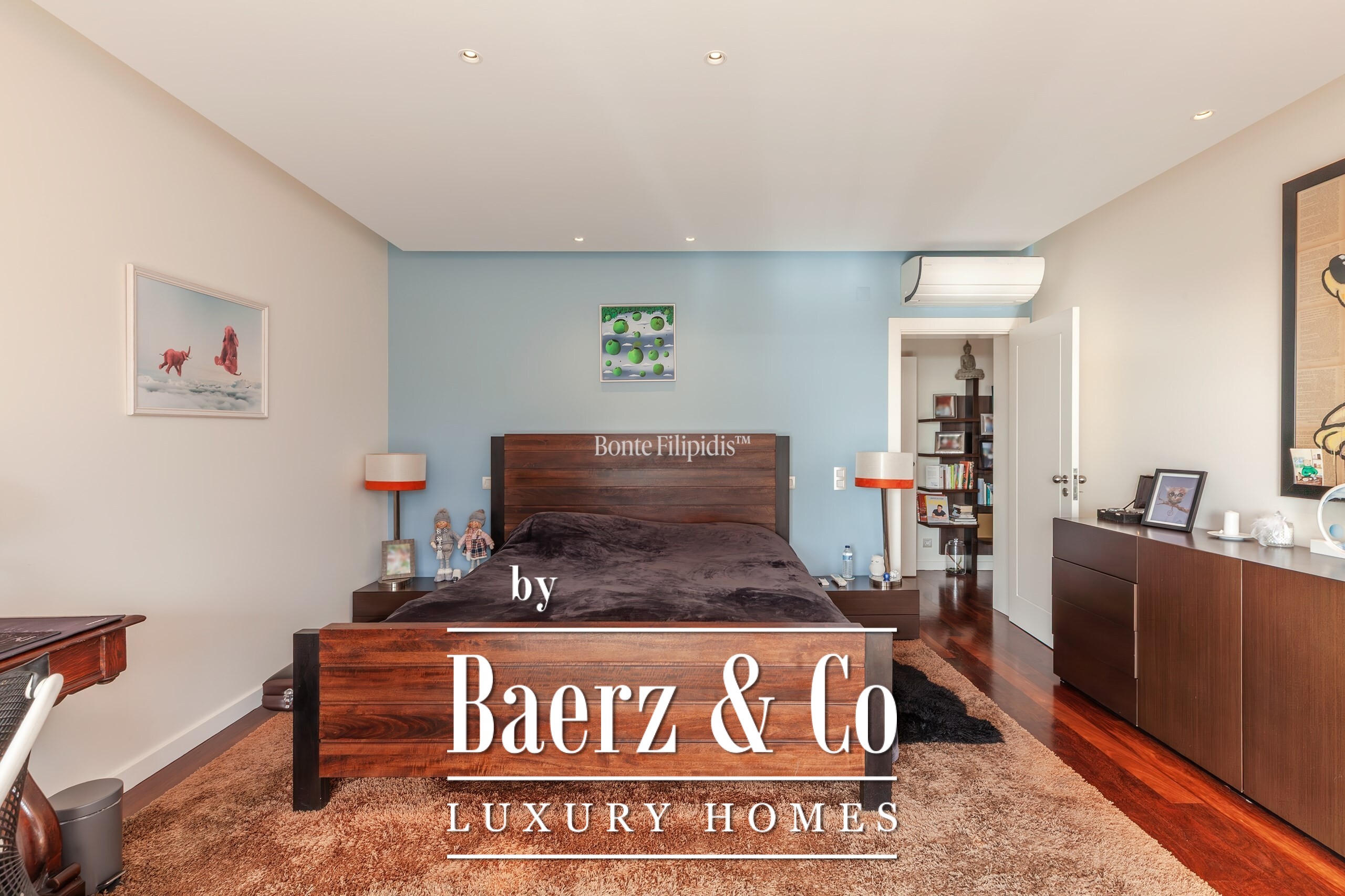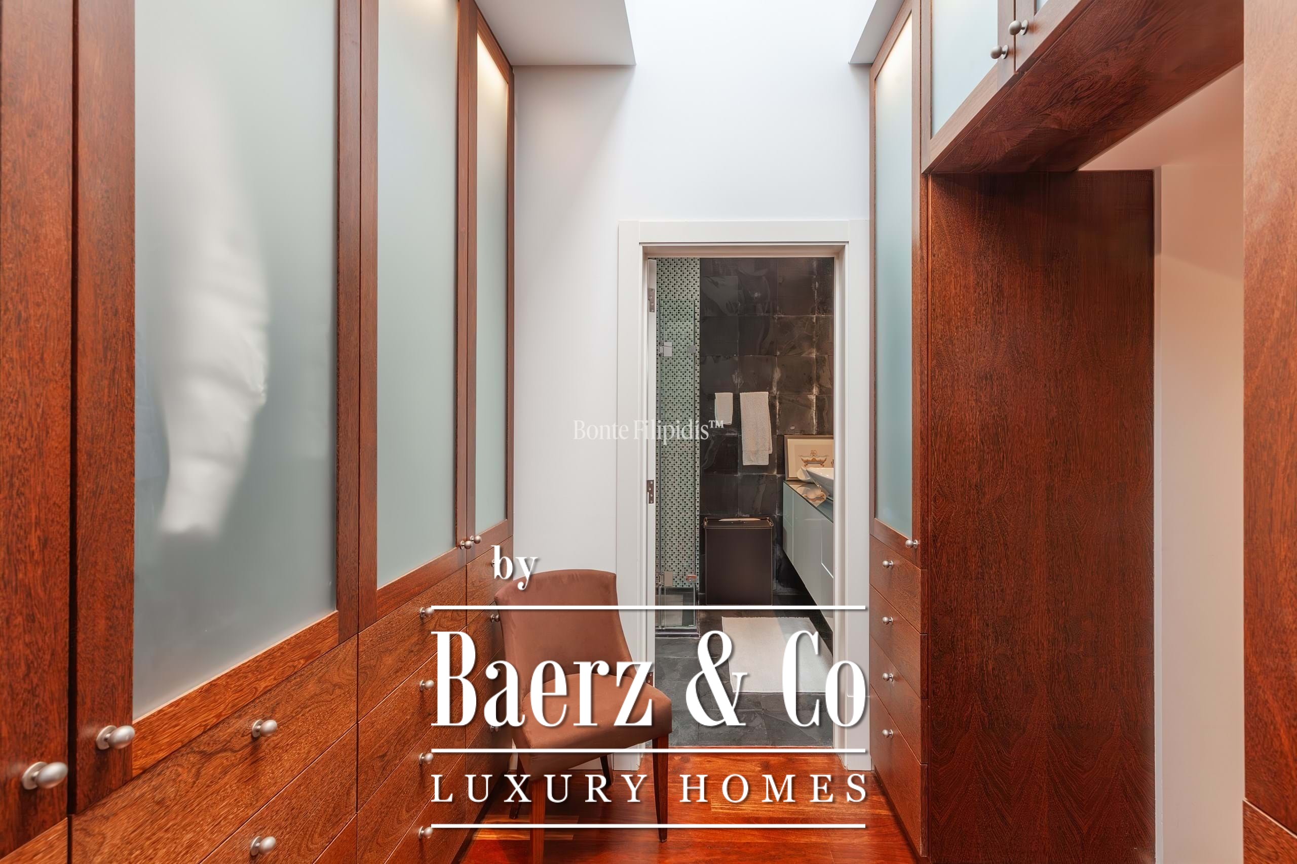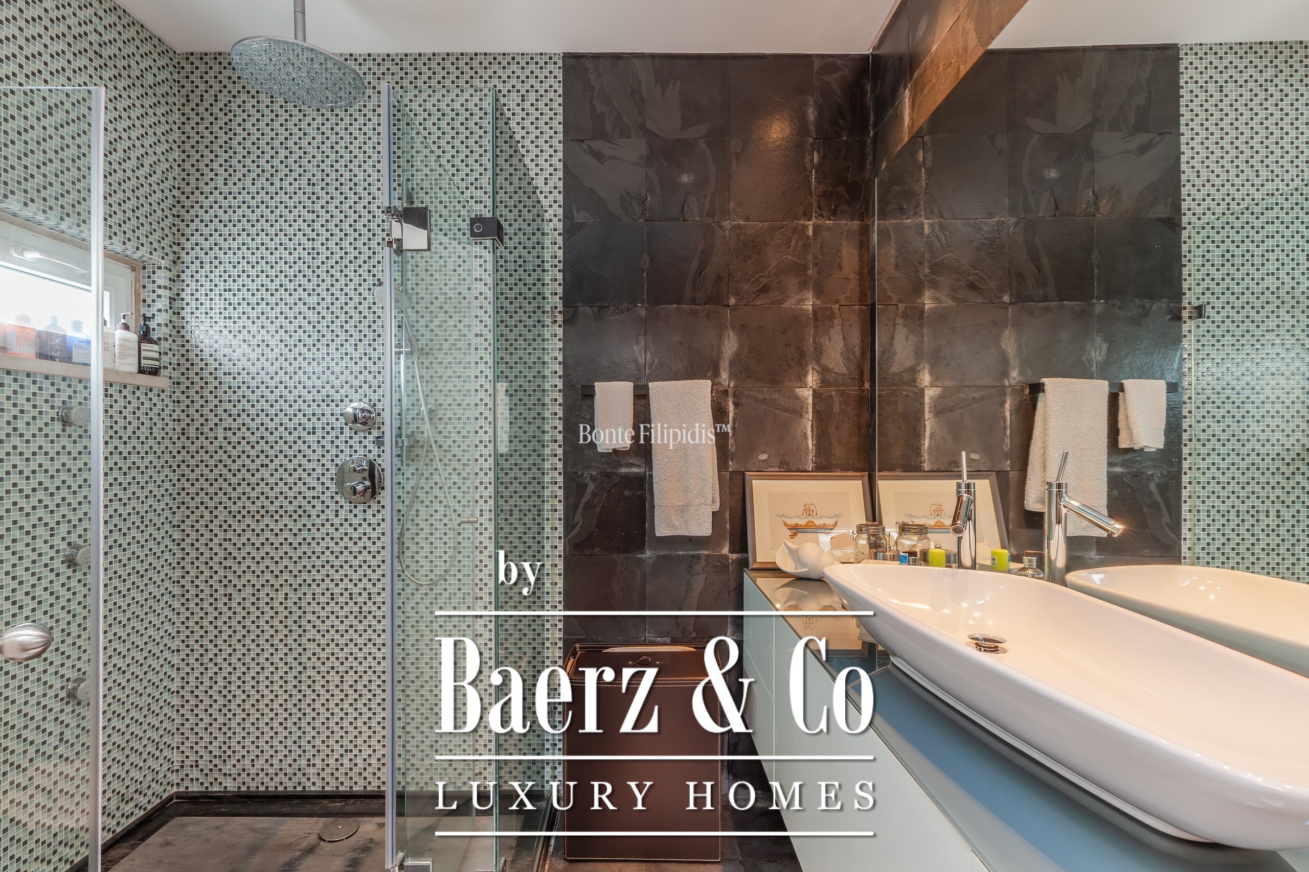 Het interieur van 448 m² is verdeeld over vier niveaus, telkens bereikbaar met de lift. Vijf slaapkamers, waaronder een master suite, en zes badkamers bieden een royaal verblijf. De lichte leefzones staan direct in verbinding met de terrassen onder een bioklimatische pergola die zich aanpast aan licht en luchtstroming. De keuken, uitgerust met geavanceerde technologie, ondersteunt stille routines en gastvrijheid.