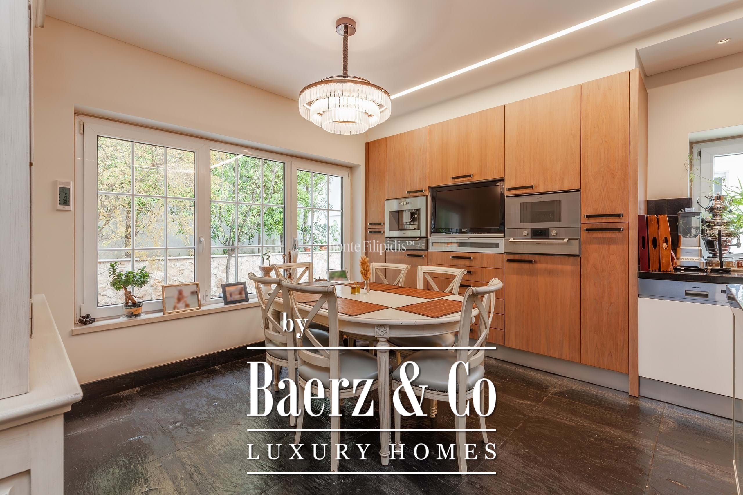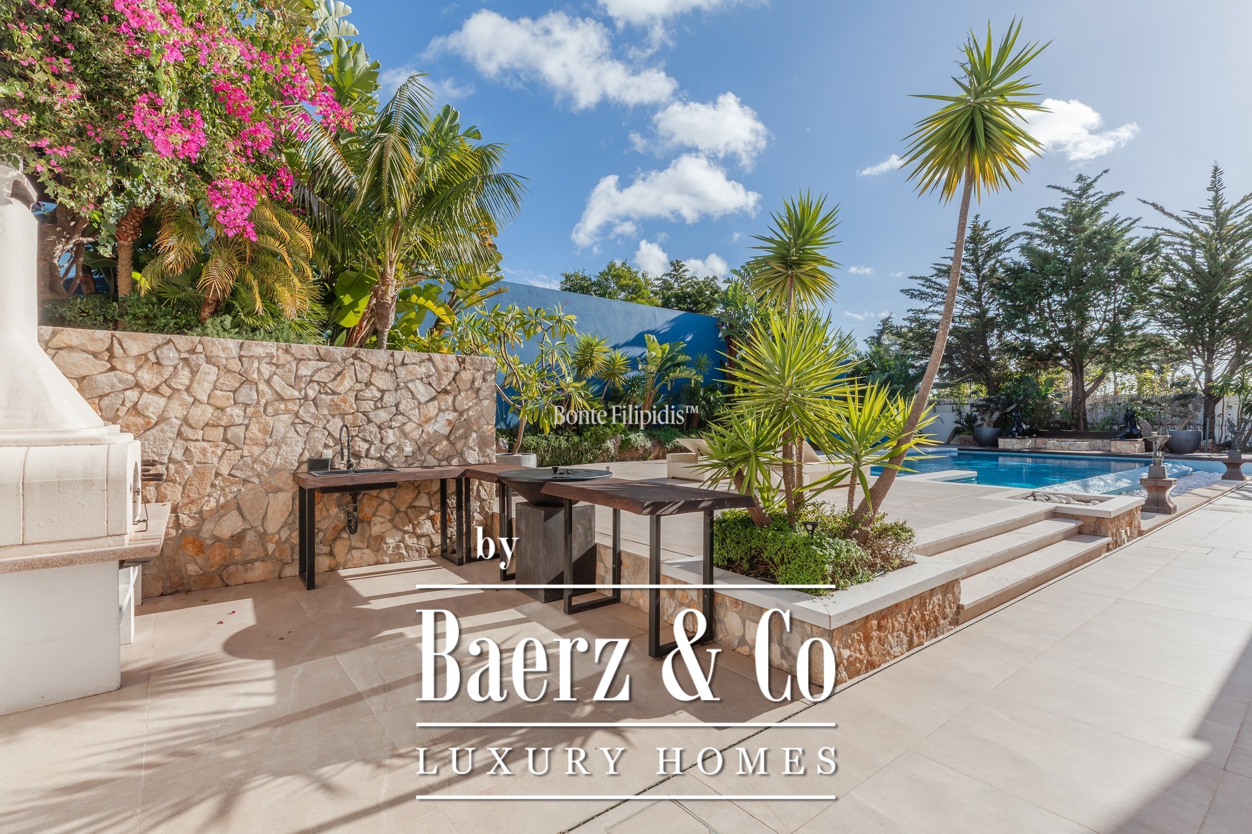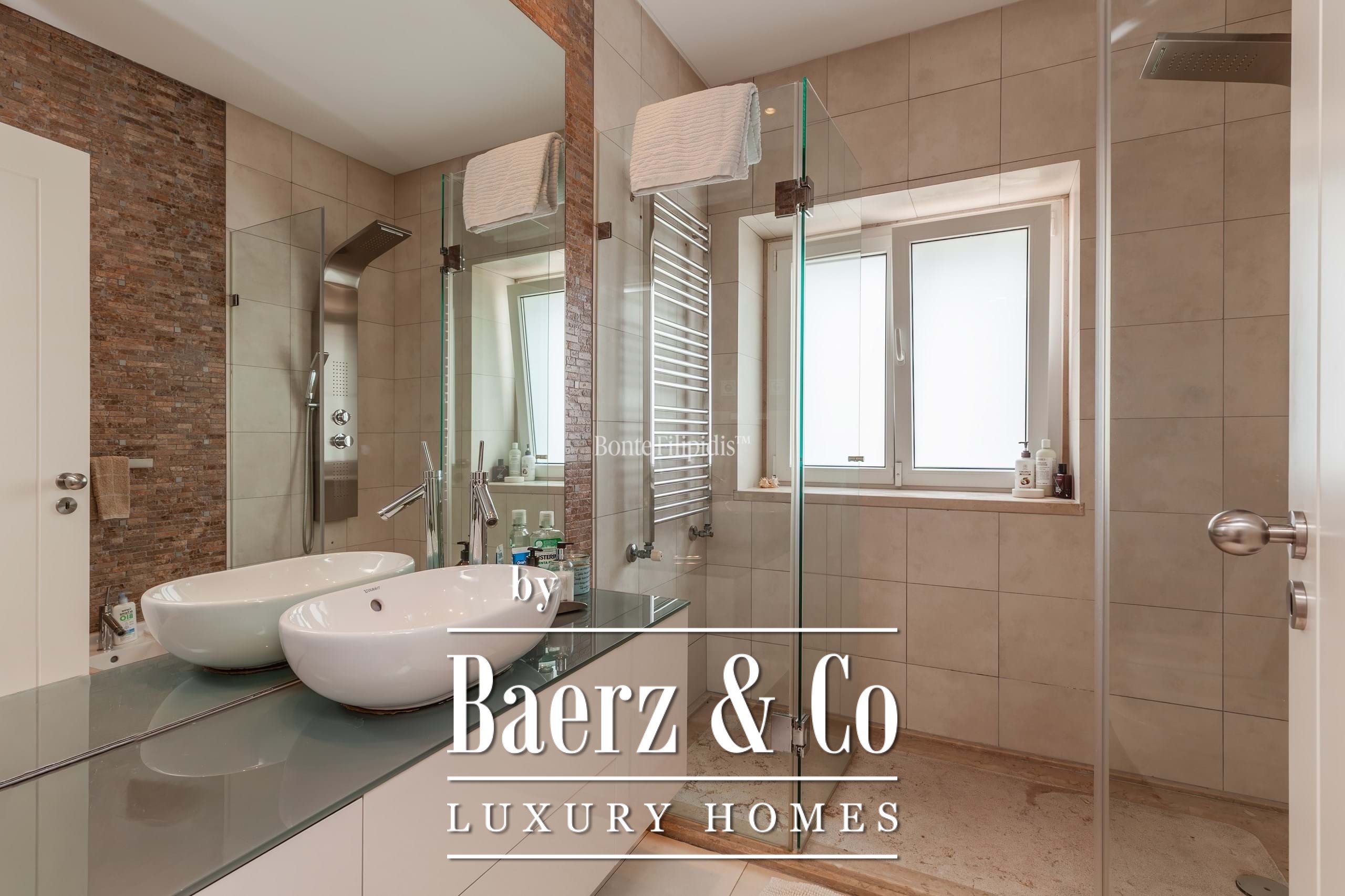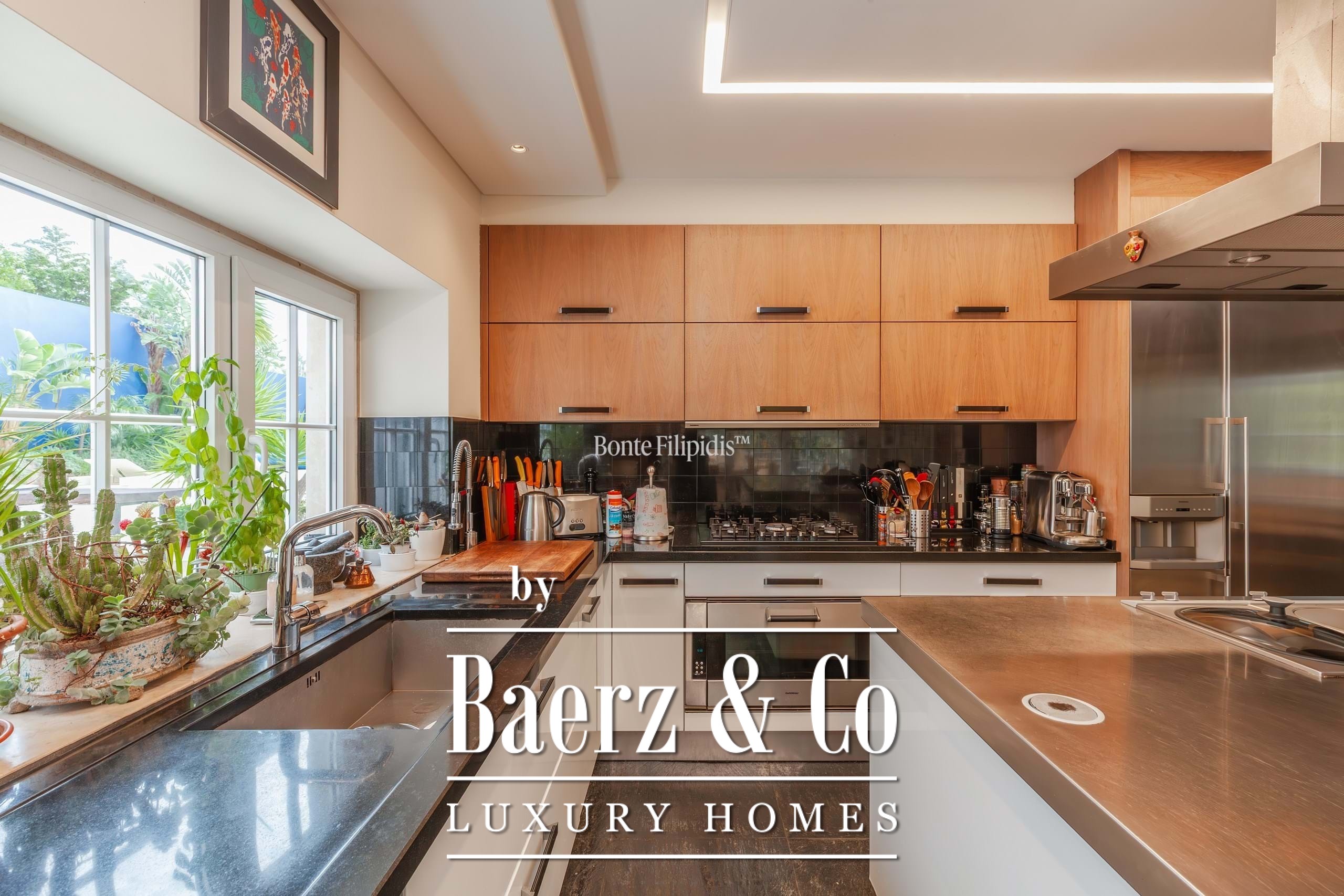 Het interieur van 448 m² is verdeeld over vier niveaus, telkens bereikbaar met de lift. Vijf slaapkamers, waaronder een master suite, en zes badkamers bieden een royaal verblijf. De lichte leefzones staan direct in verbinding met de terrassen onder een bioklimatische pergola die zich aanpast aan licht en luchtstroming. De keuken, uitgerust met geavanceerde technologie, ondersteunt stille routines en gastvrijheid.