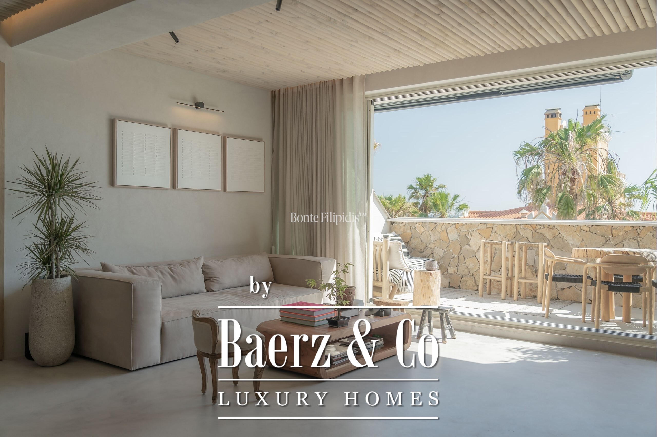 Met een woonoppervlakte van 88 m² sluiten de open woonkamer, eetruimte en keuken naadloos op elkaar aan, voorzien van hoogwaardige afwerking en volledig geïntegreerde apparatuur. De woonkamer leidt naar een terras van 19 m² met bar en een buitendouche om verkoeling te zoeken onder de lucht, met een sereen uitzicht op de baai. In het privégedeelte waarborgt de en-suite slaapkamer privacy, terwijl de tweede slaapkamer met zeezicht een eigen balkon en een aparte, complete badkamer biedt.