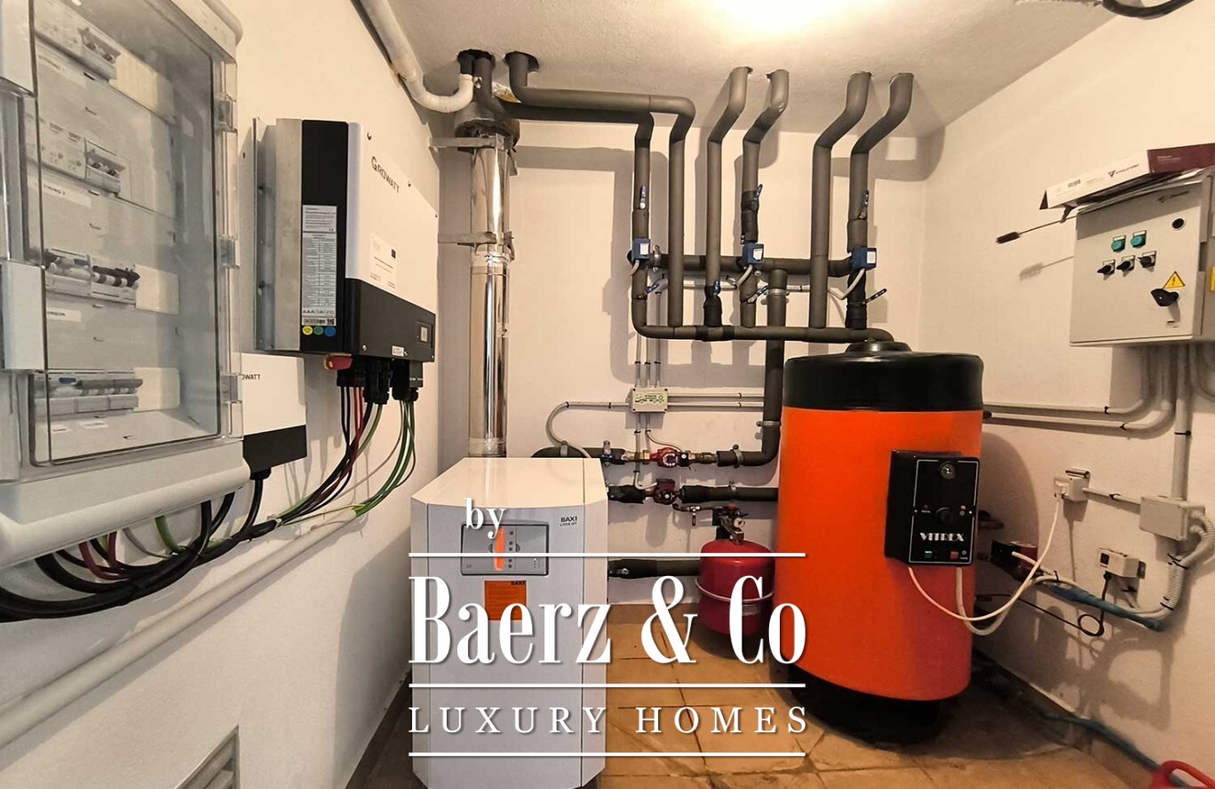 Het souterrain onder de villa beslaat de volledige omvang van het huis en biedt een uitzonderlijke garage met ruimte voor meerdere voertuigen. Geavanceerde klimaatregeling — met vloerverwarming op de begane grond, centrale verwarming boven, airconditioning, zonnepanelen en een centraal stofzuigsysteem — onderstreept het streven naar comfort en duurzaamheid.