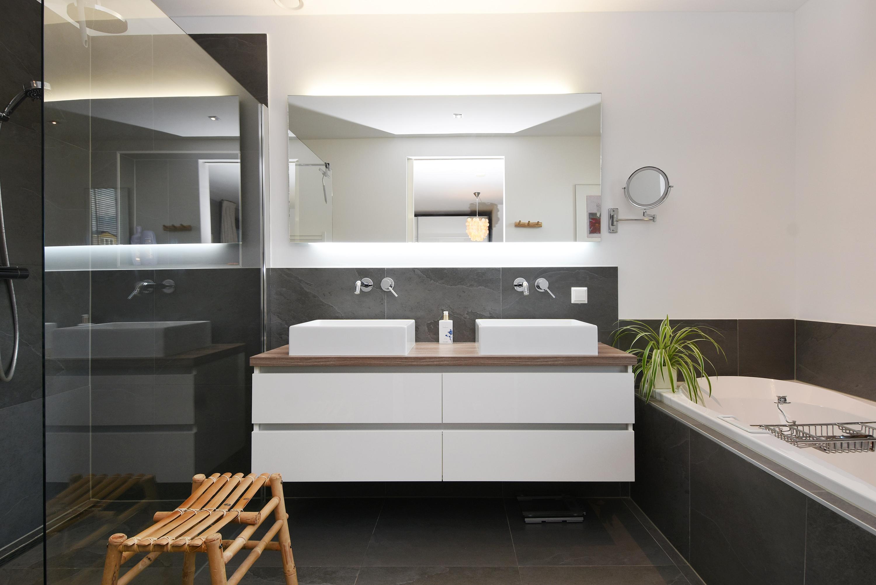 De hal, bij de entree van de woning, biedt toegang tot een bijkeuken met opstelplaats voor een wasmachine/droger/vriezer e.d. en tot een luxe toilet (hangend closet) met fontein. Vanuit hier bereik je ook de master bedroom met een badkamer ensuite, voorzien van een fraaie inloopdouche, ligbad en dubbele vaste wastafel + meubel.