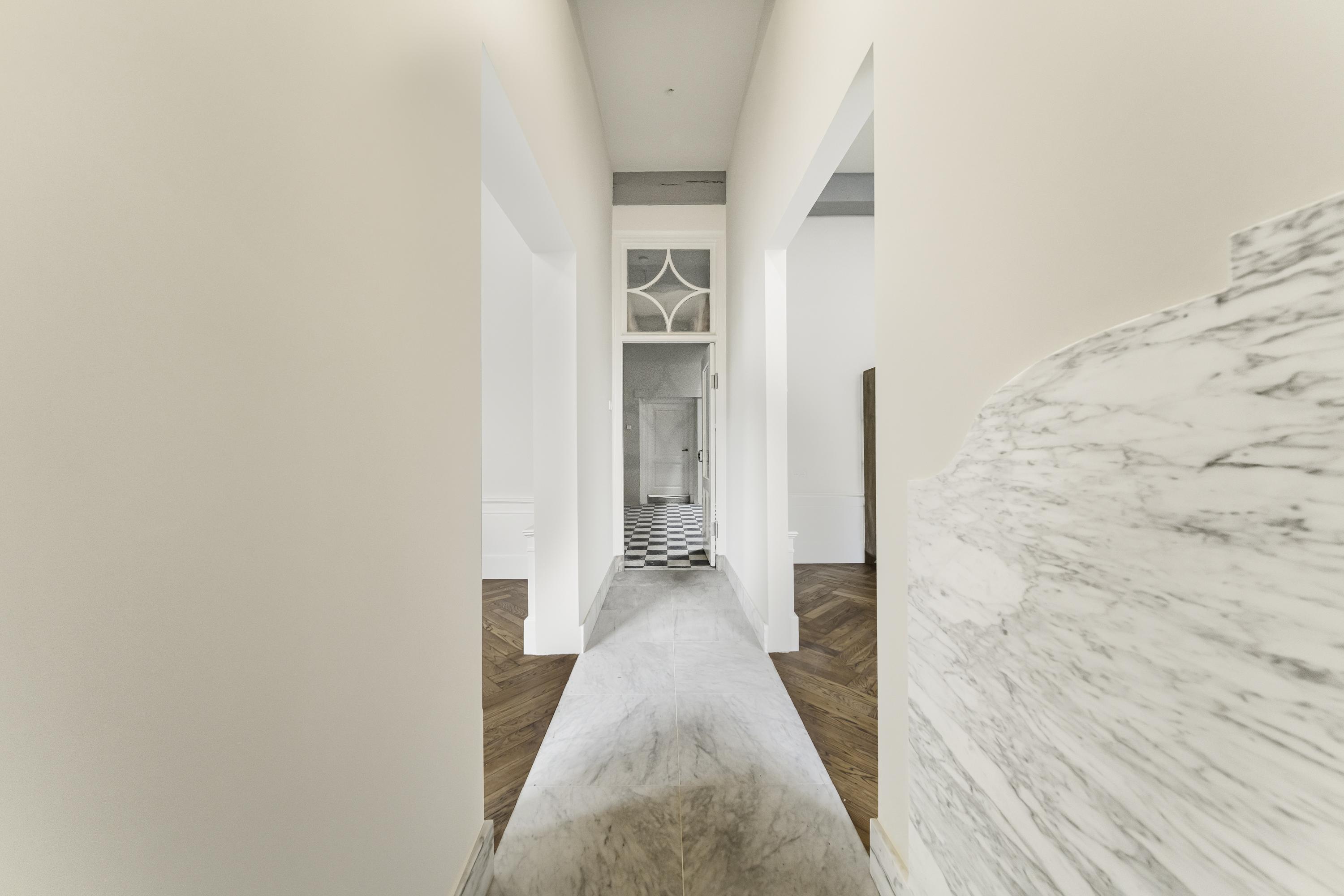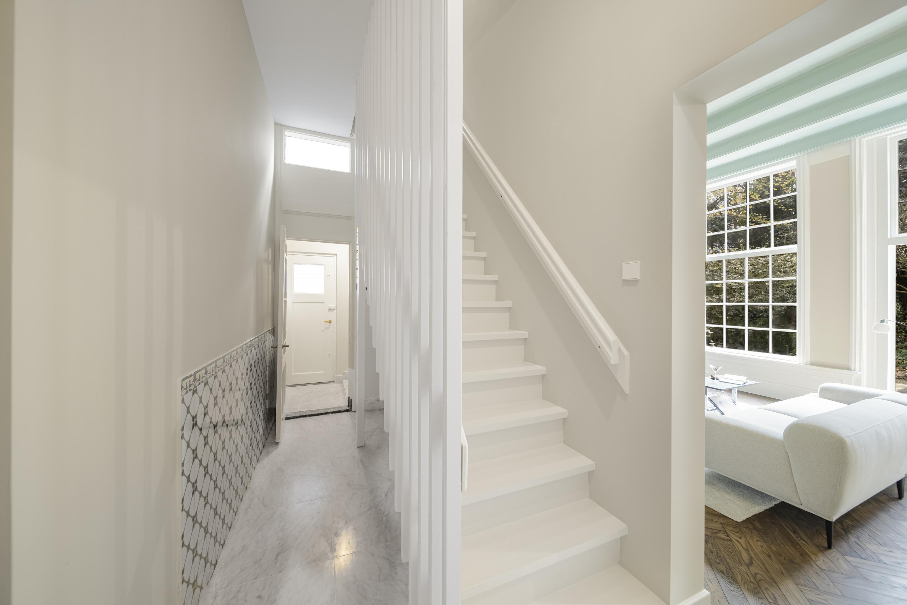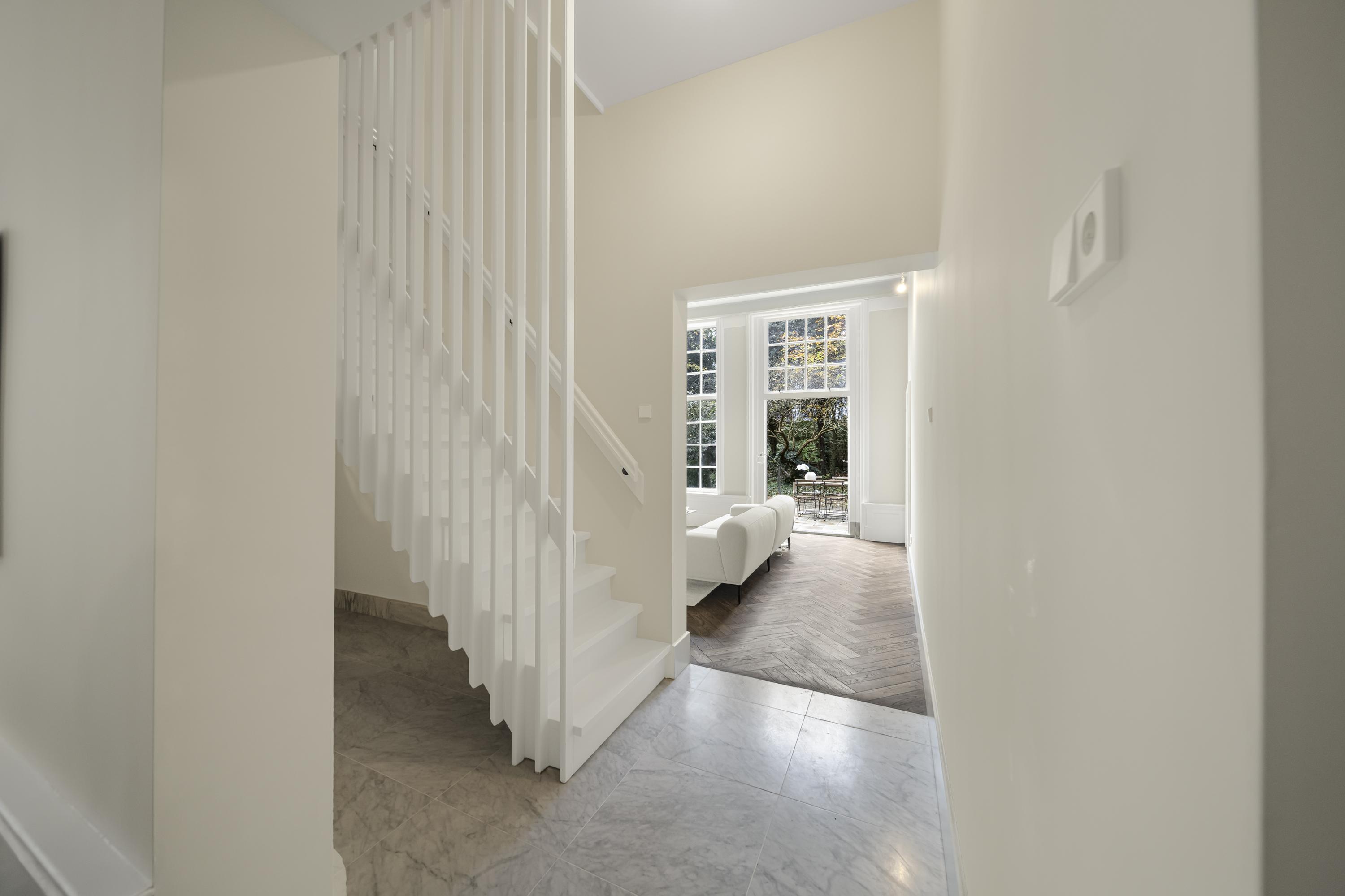 Entree, lange gang en imposante hal met klassieke zwart-wit marmeren vloer en monumentale eiken trap. Aan de voorzijde twee kamers met originele schouwen, ideaal als kantoor of praktijkruimte. Aansluitend een ruime tussenkamer die overgaat in de zonnige, tuingerichte woonkamer met monumentale schouw.