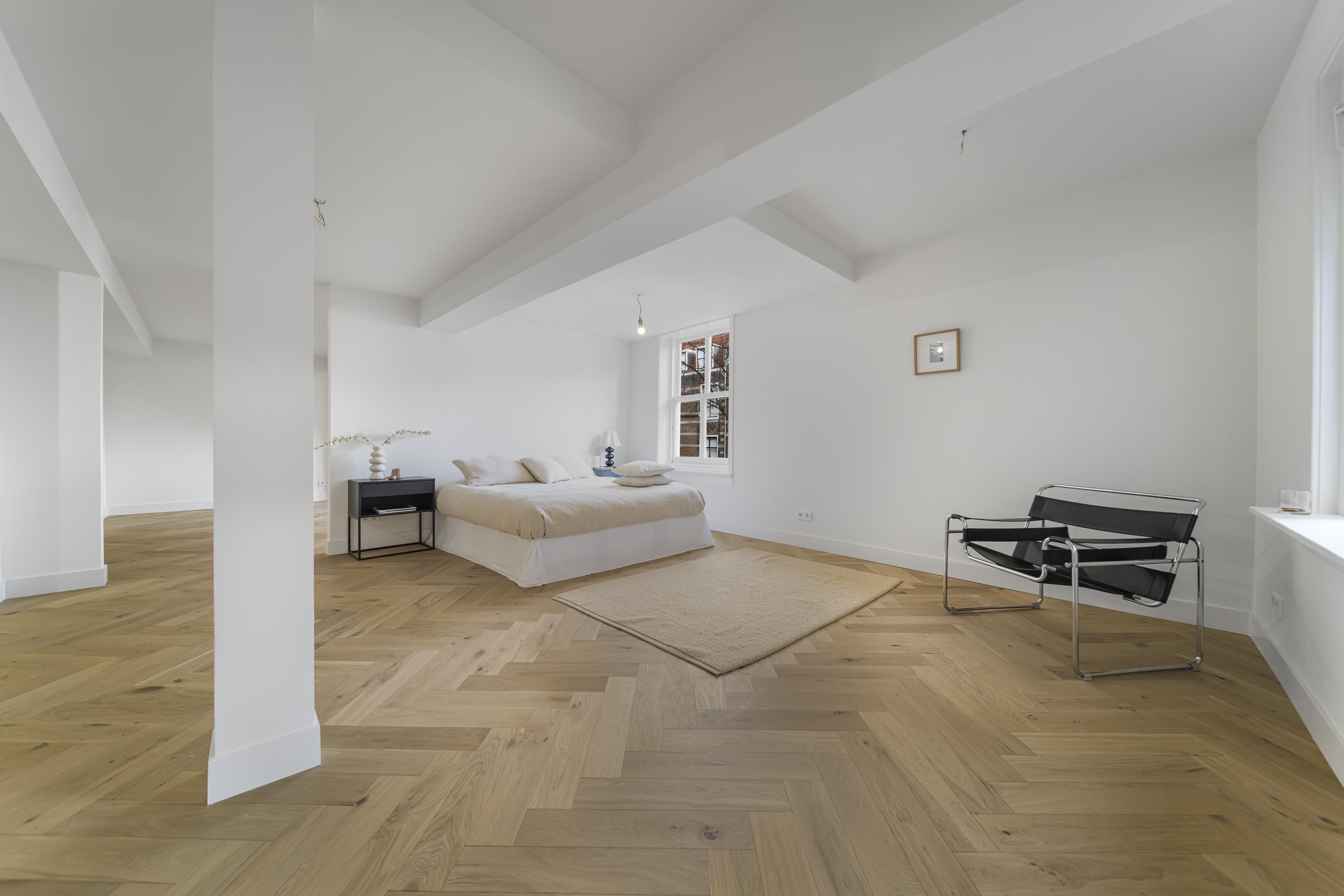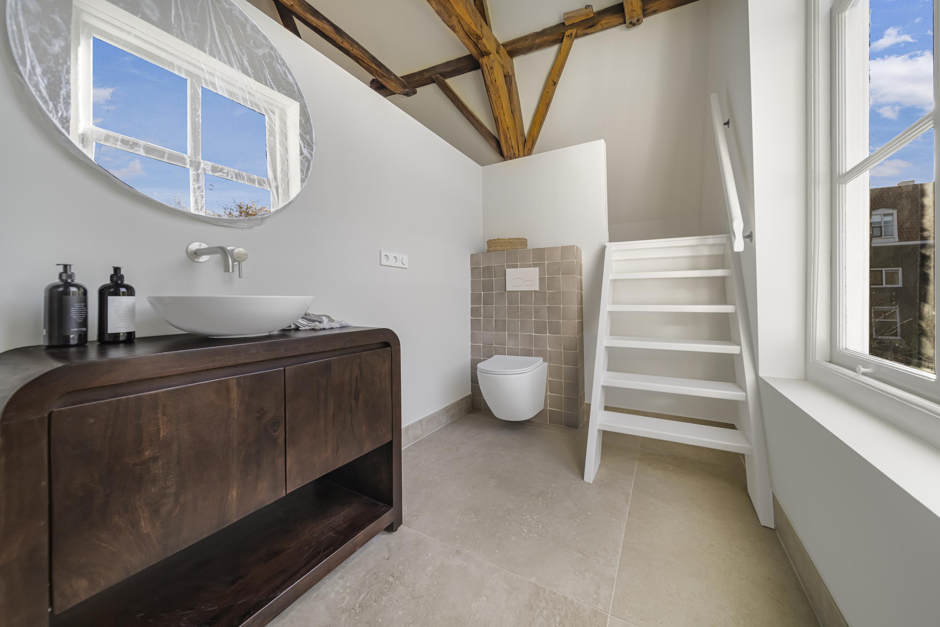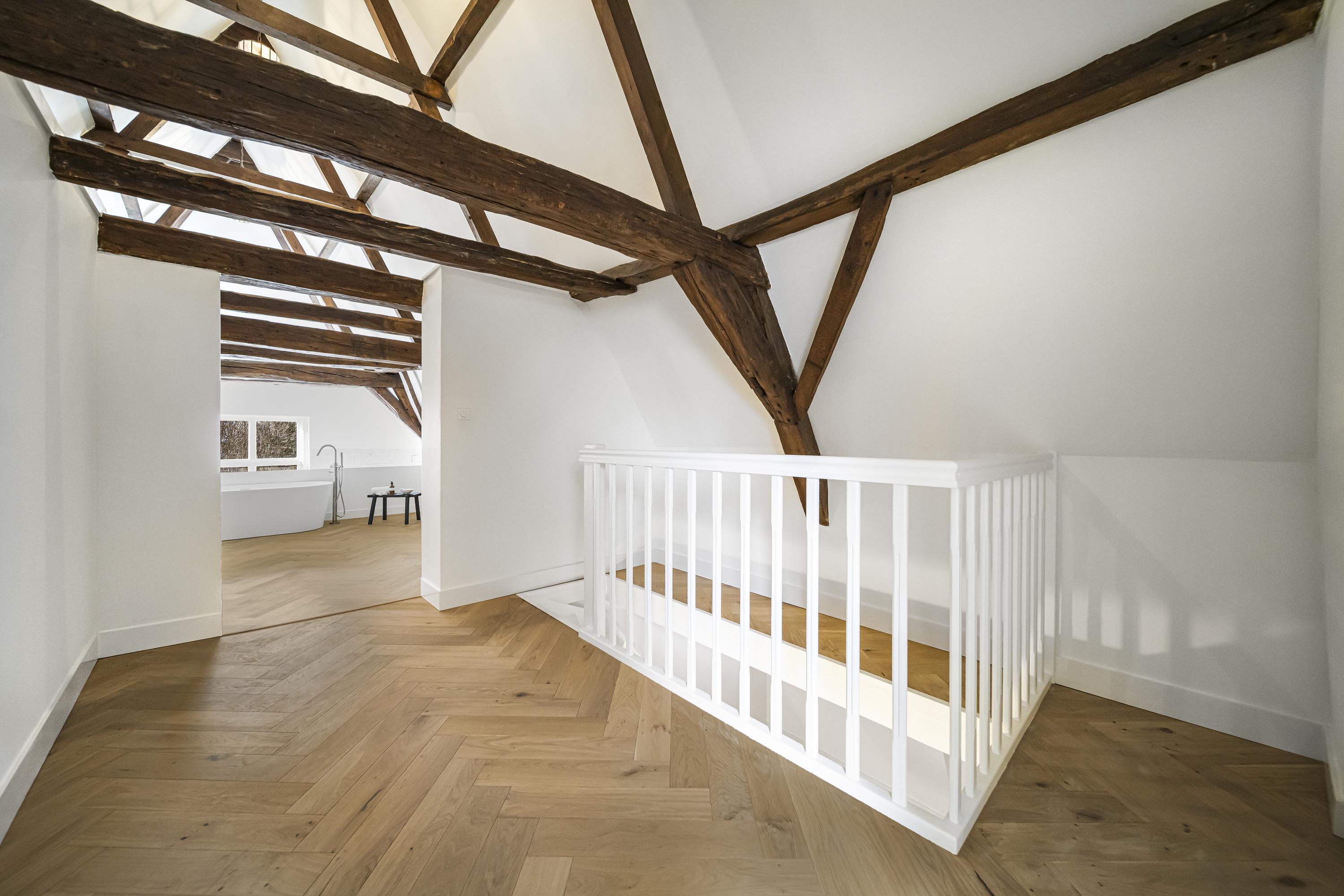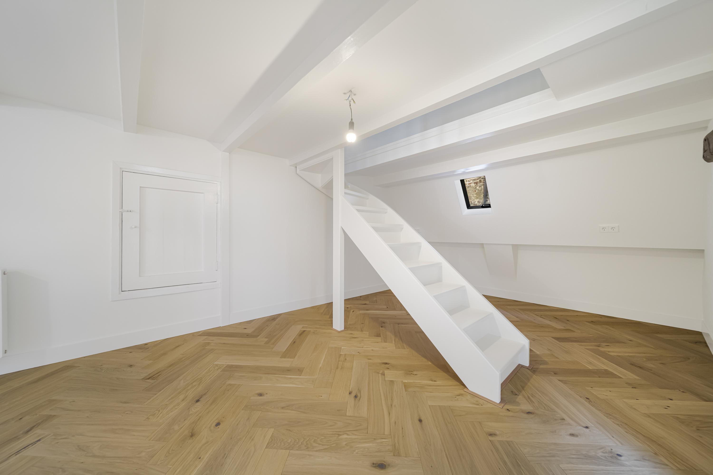 Een prachtige verdieping met zicht op de originele kapconstructie. Aan de voorzijde een bijzonder lichte multifunctionele ruimte. Verder een grote bergruimte en toiletruimte. Extra daglicht via de hoog geplaatste nieuwe ramen boven de vide.