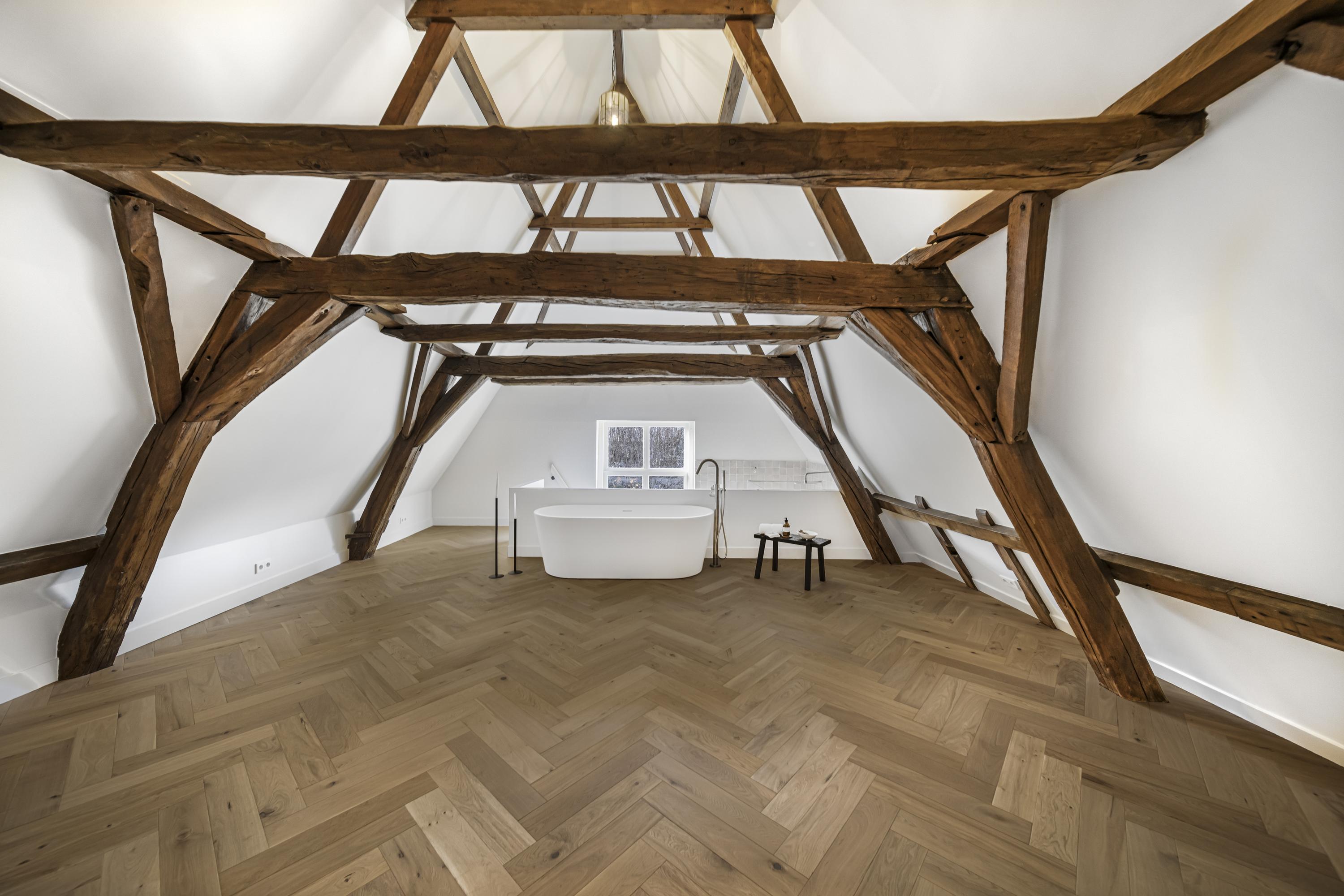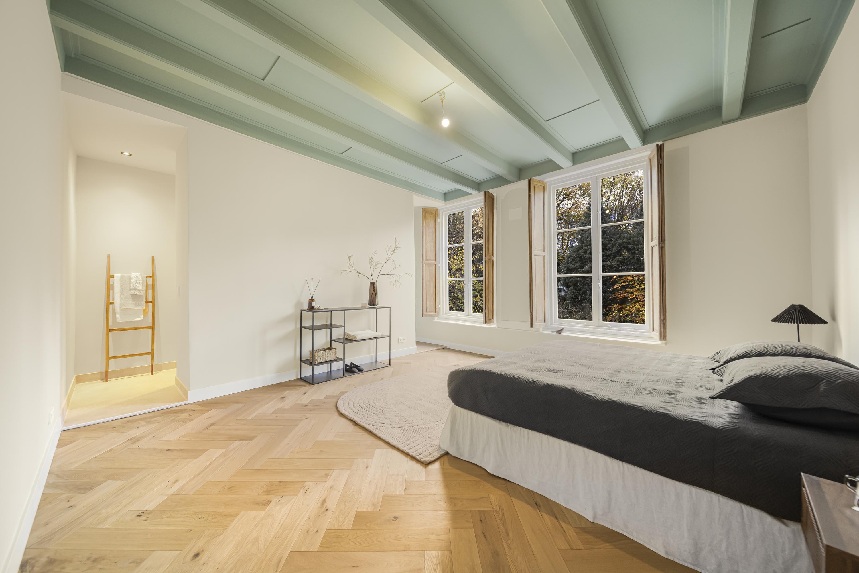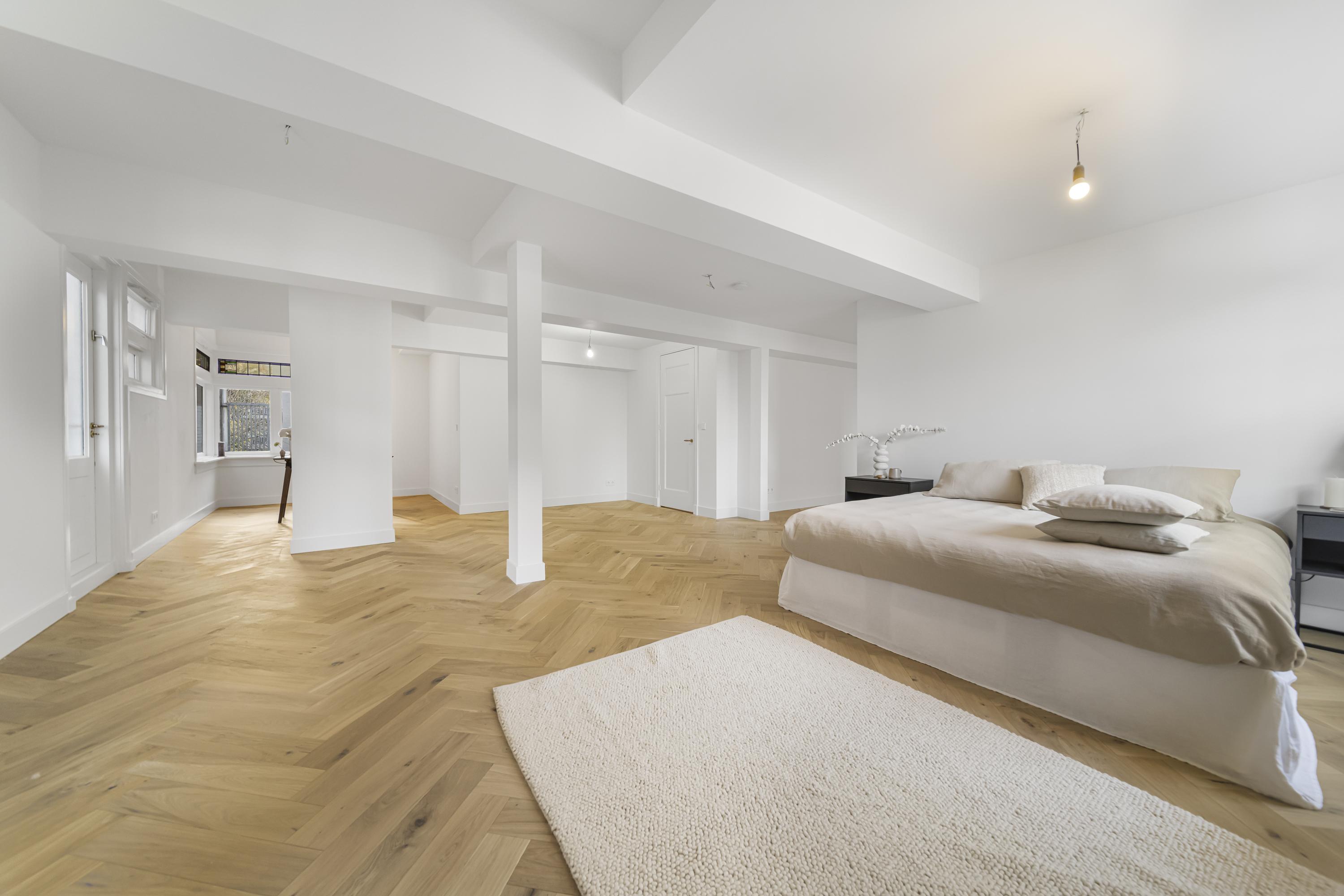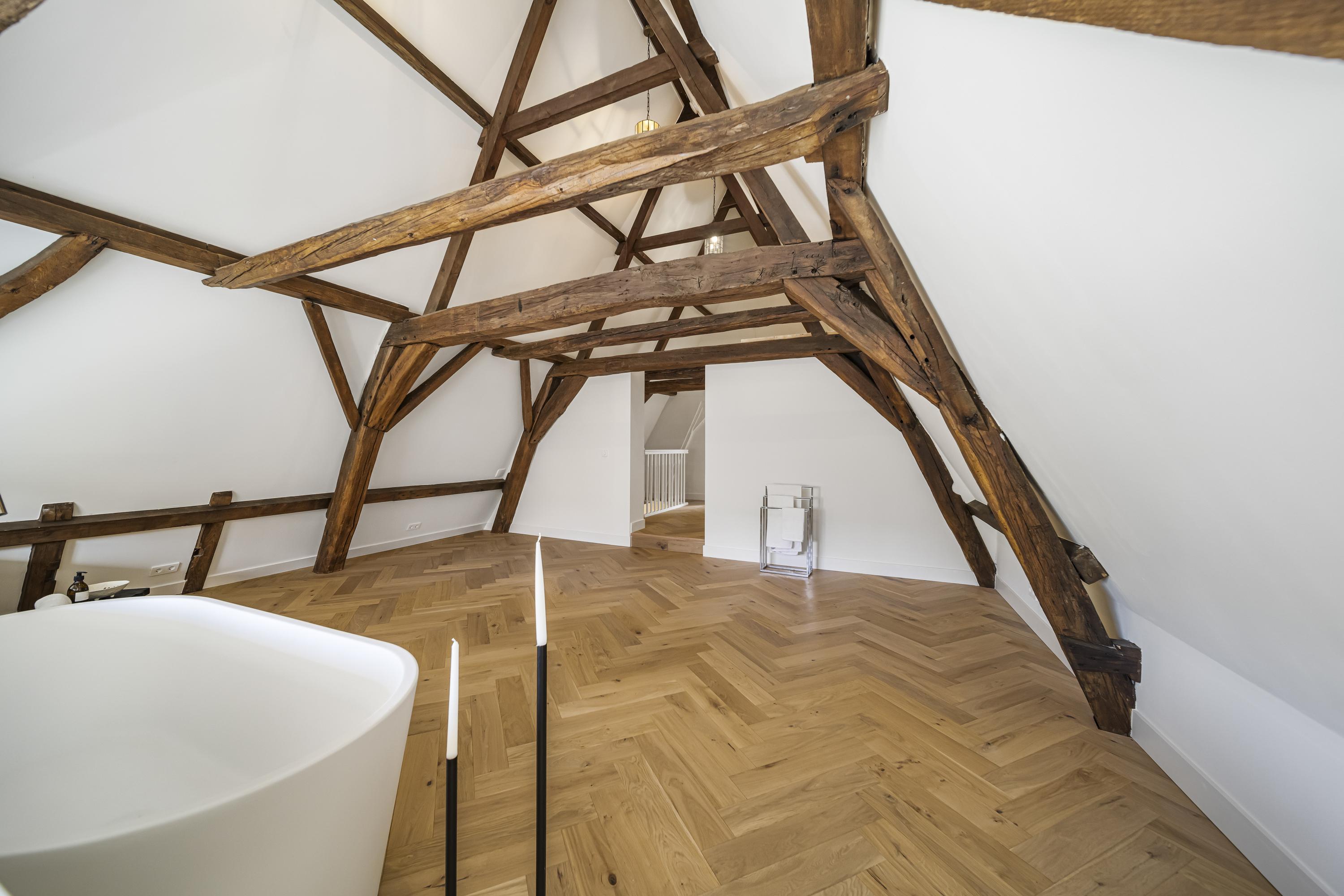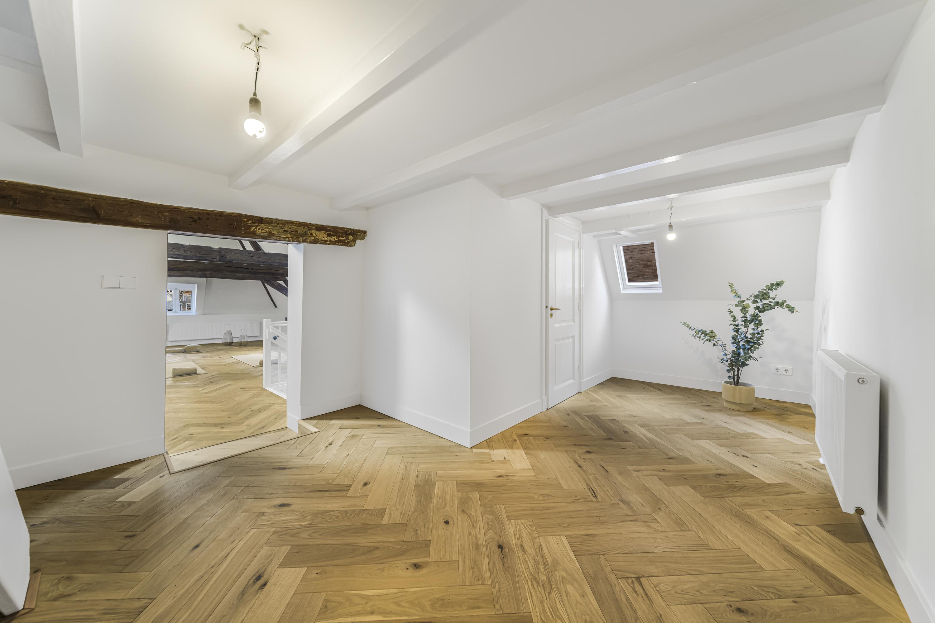 Een prachtige verdieping met zicht op de originele kapconstructie. Aan de voorzijde een bijzonder lichte multifunctionele ruimte. Verder een grote bergruimte en toiletruimte. Extra daglicht via de hoog geplaatste nieuwe ramen boven de vide.
