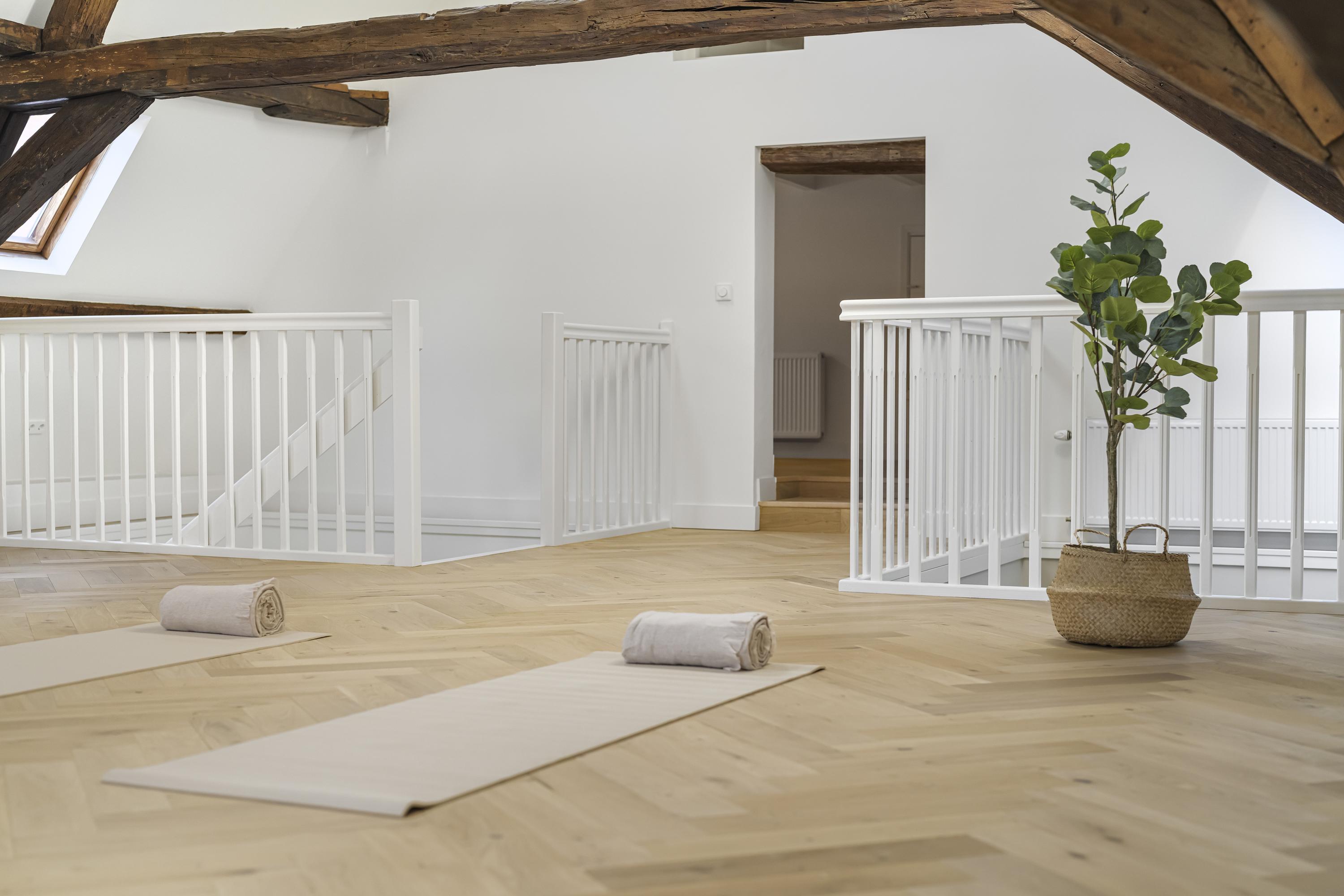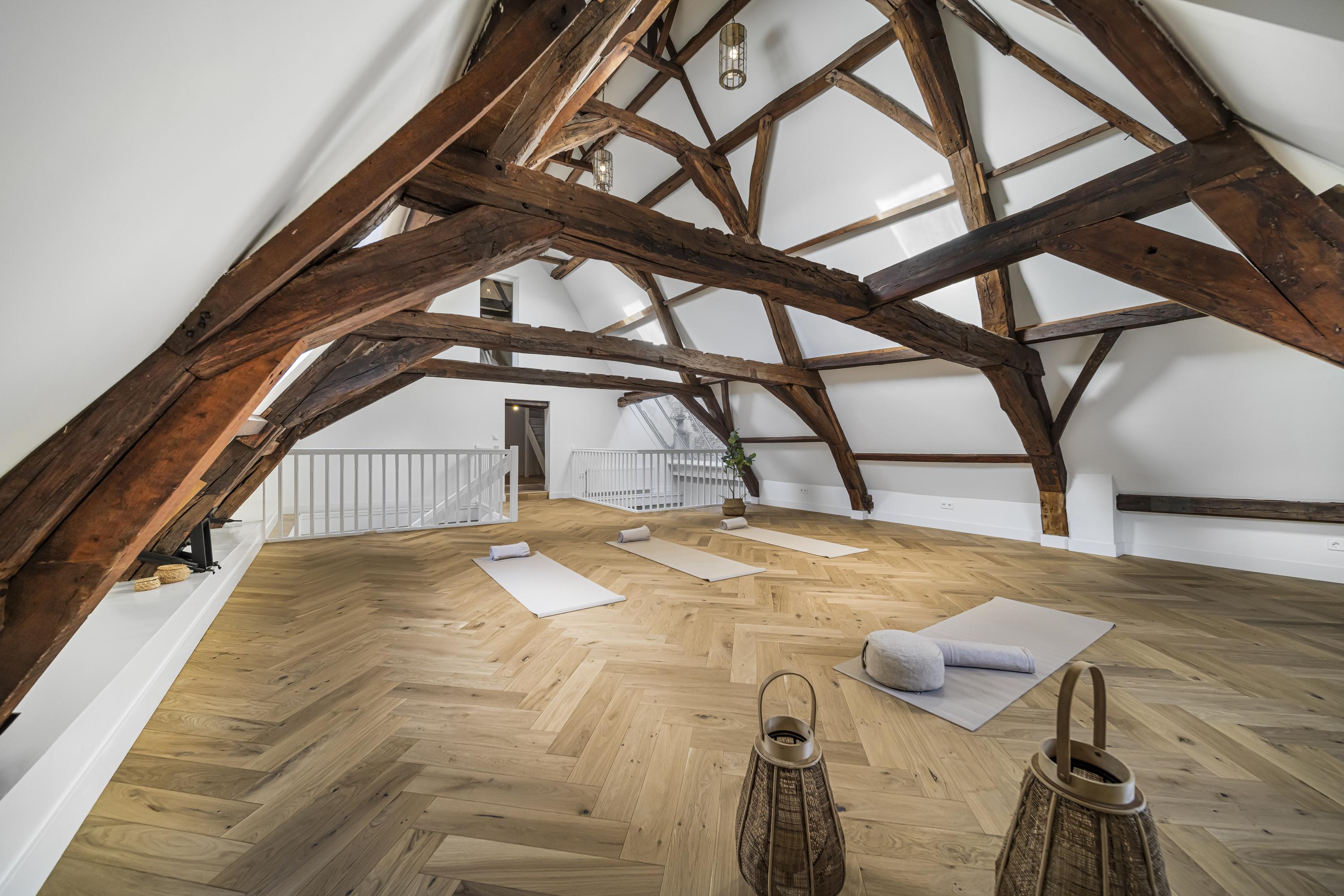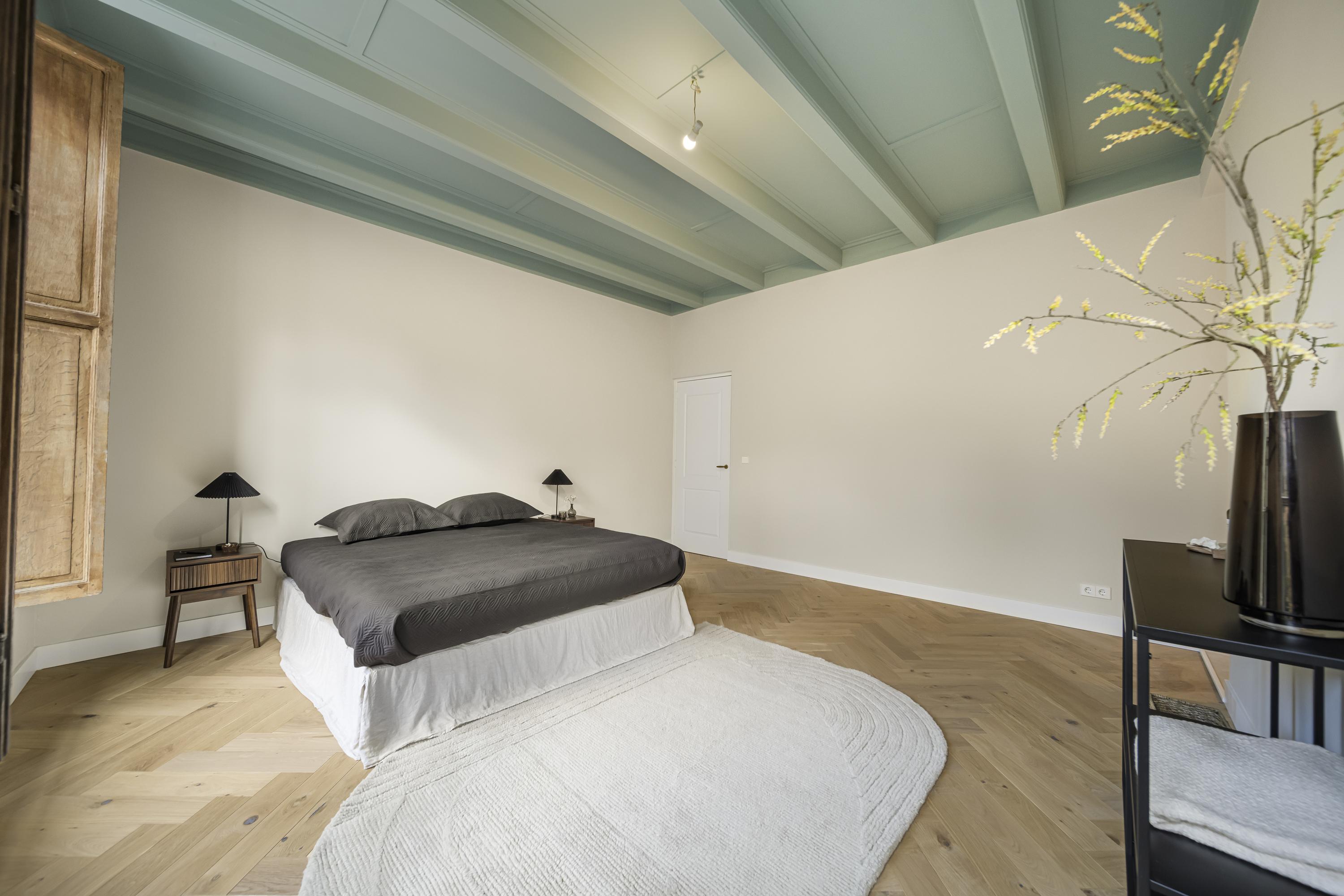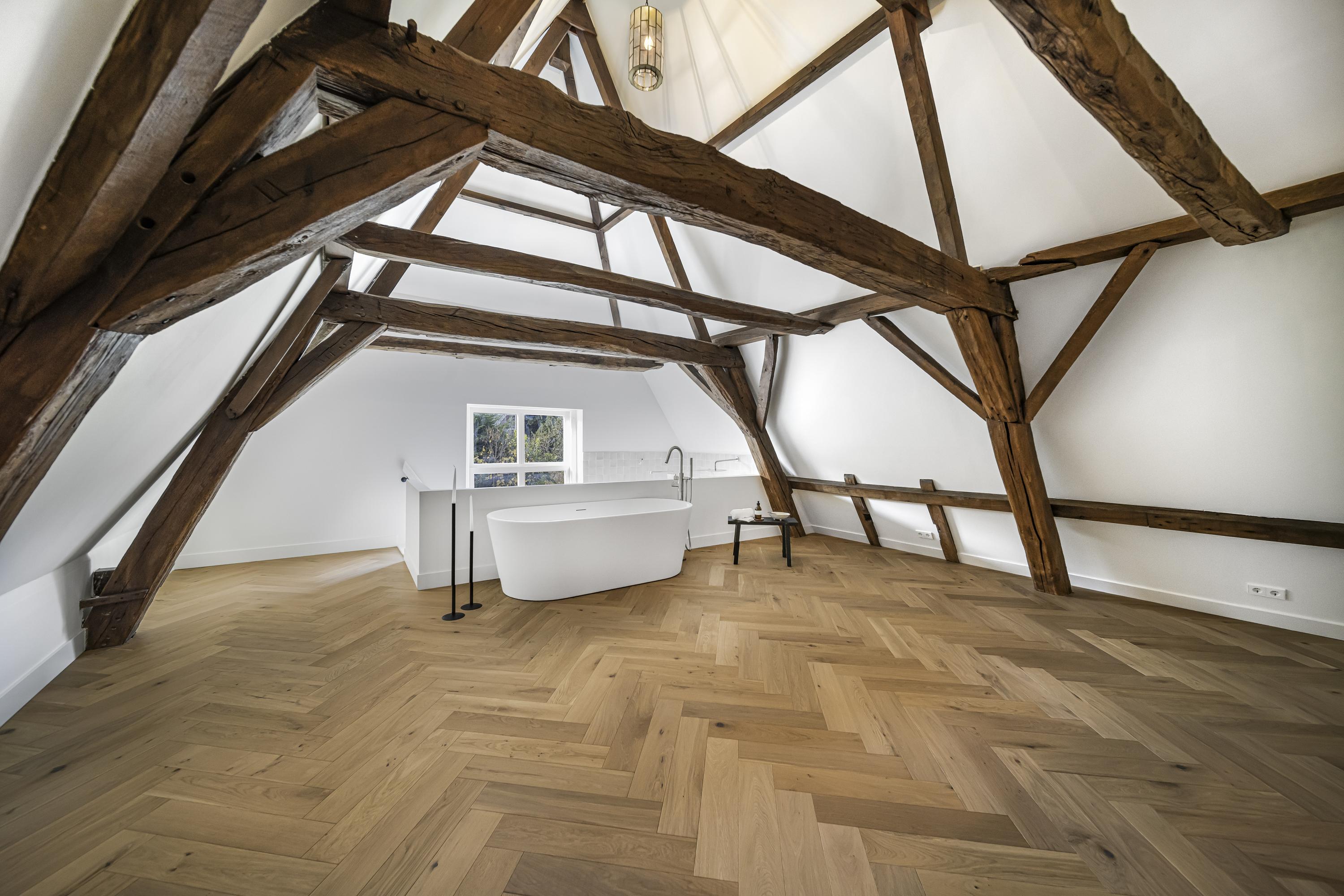 Een prachtige verdieping met zicht op de originele kapconstructie. Aan de voorzijde een bijzonder lichte multifunctionele ruimte. Verder een grote bergruimte en toiletruimte. Extra daglicht via de hoog geplaatste nieuwe ramen boven de vide.