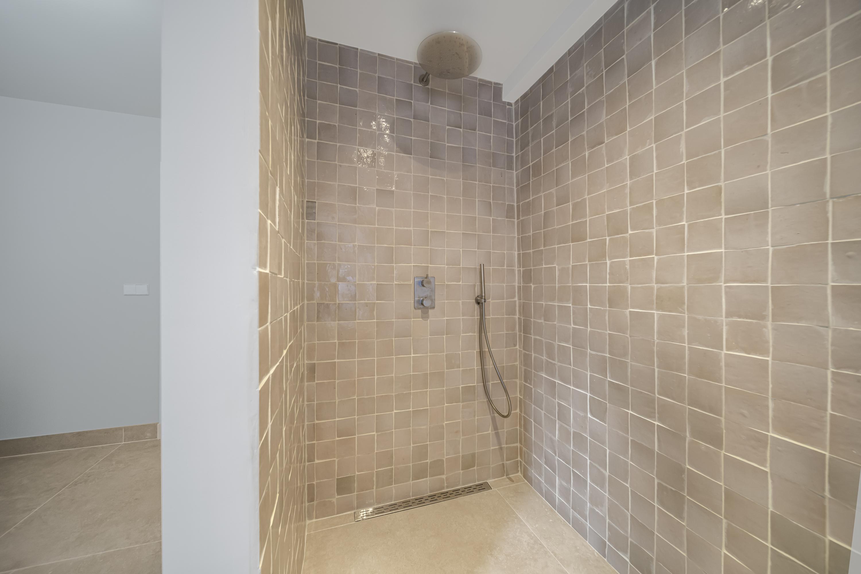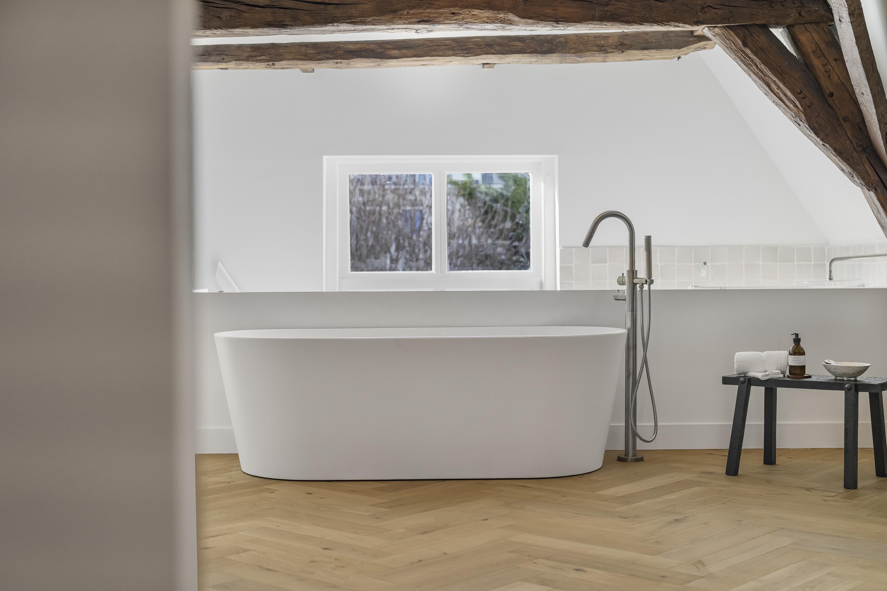 Overloop, royale open ruimte, grote slaapkamer en toegang middels een kleine traptrede tot de badkamer met inloopdouche en ligbad.