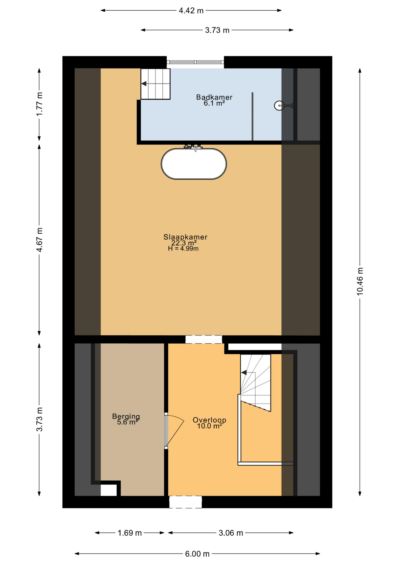Riante overloop met toegang tot de slaapkamers, badkamer en aparte toiletruimte. Aan de achterzijde ligt een grote slaapkamer met directe toegang tot de tweede badkamer.