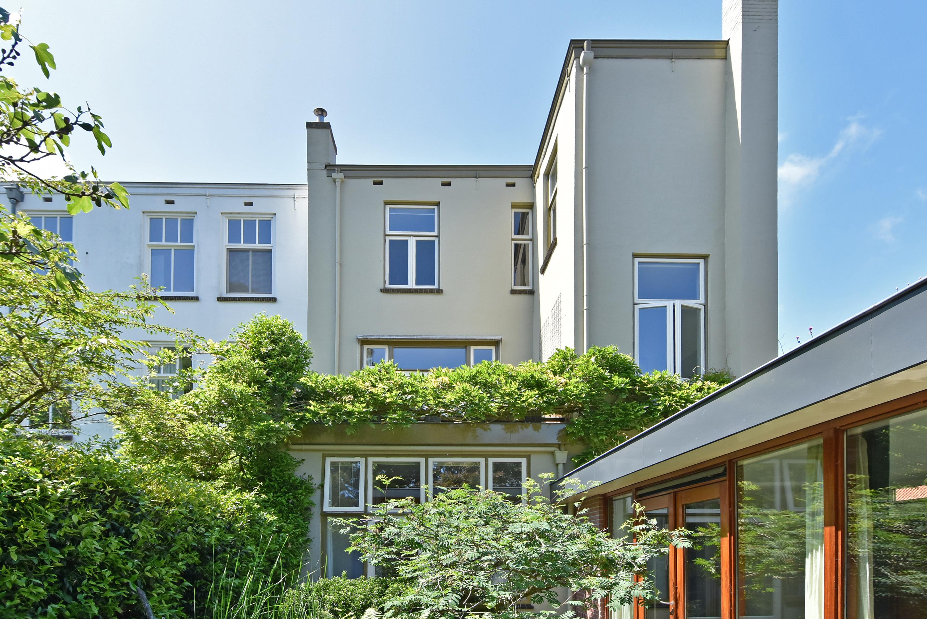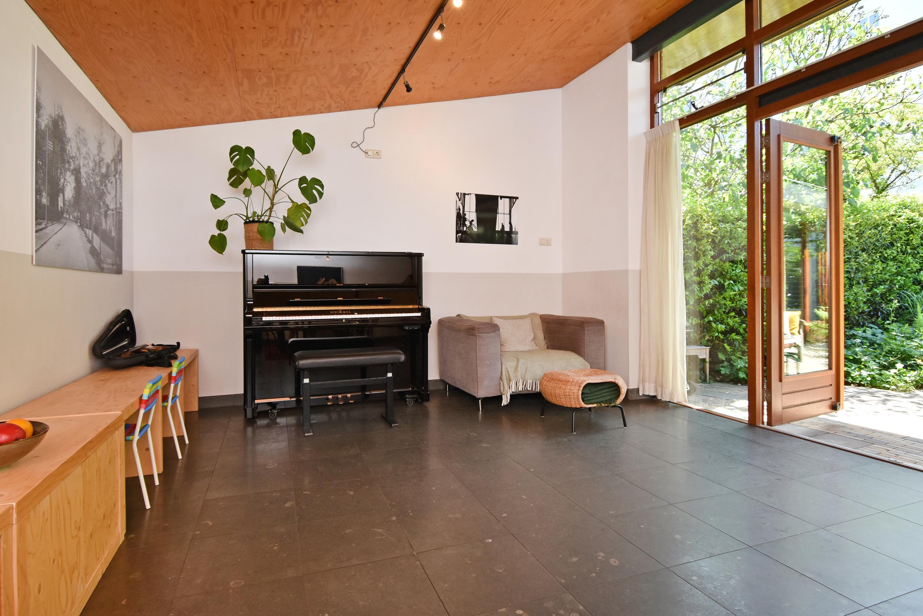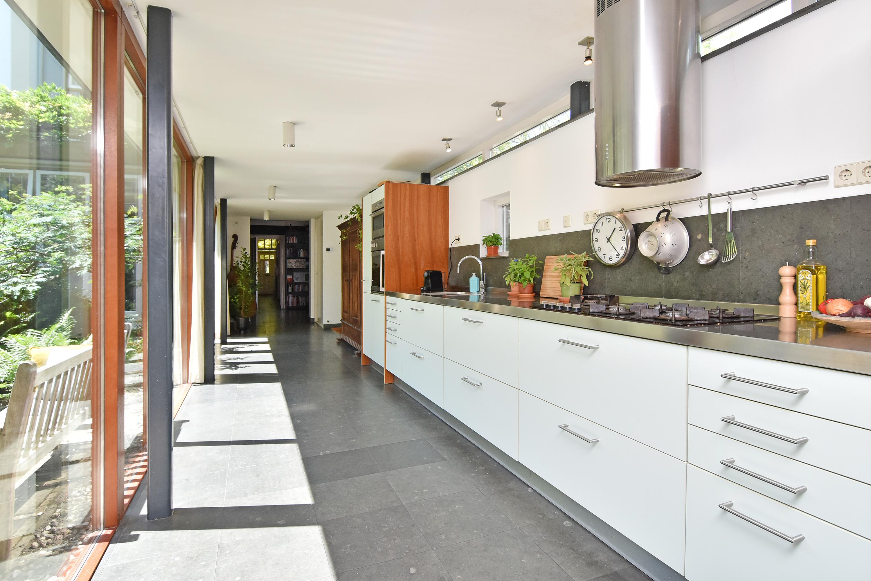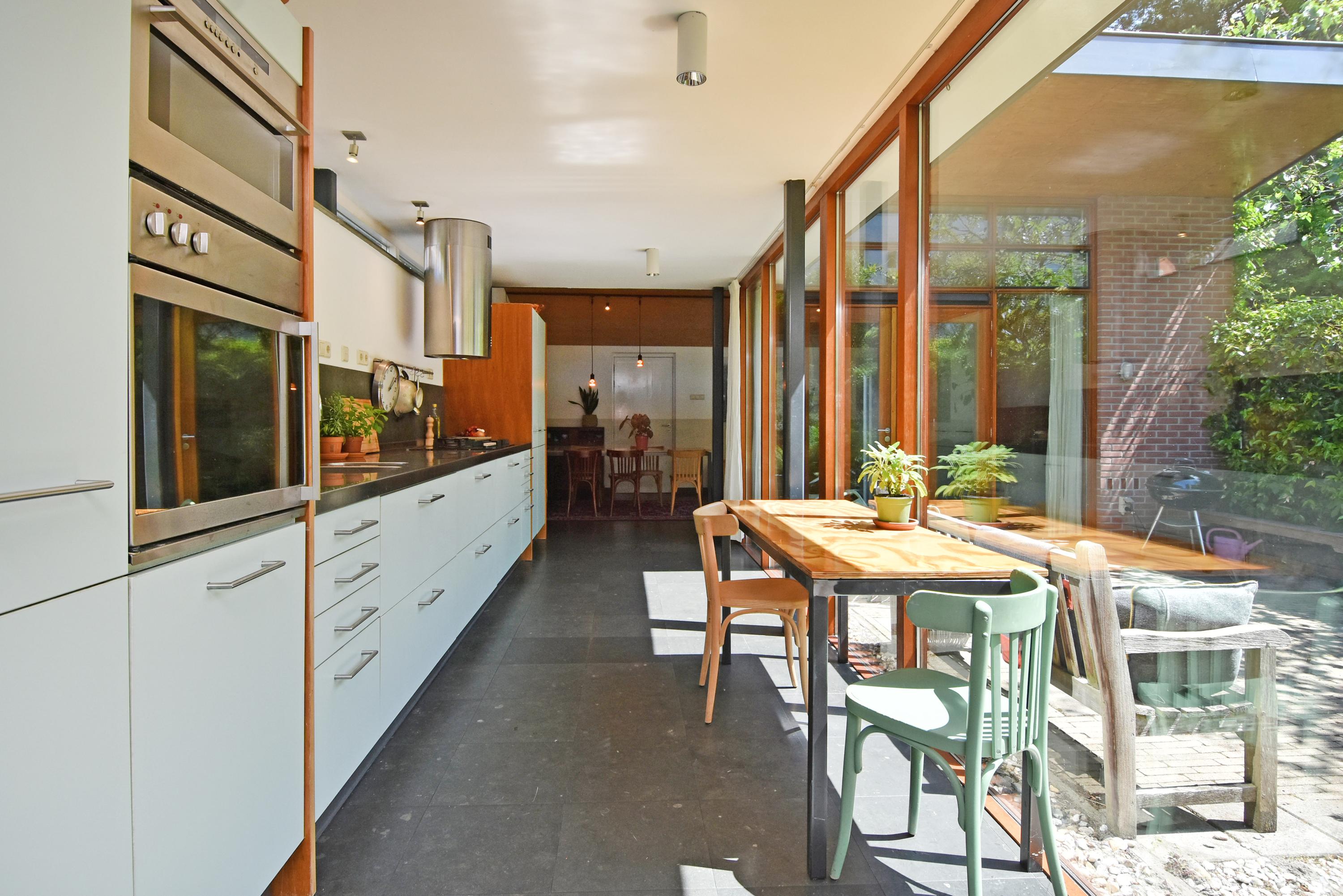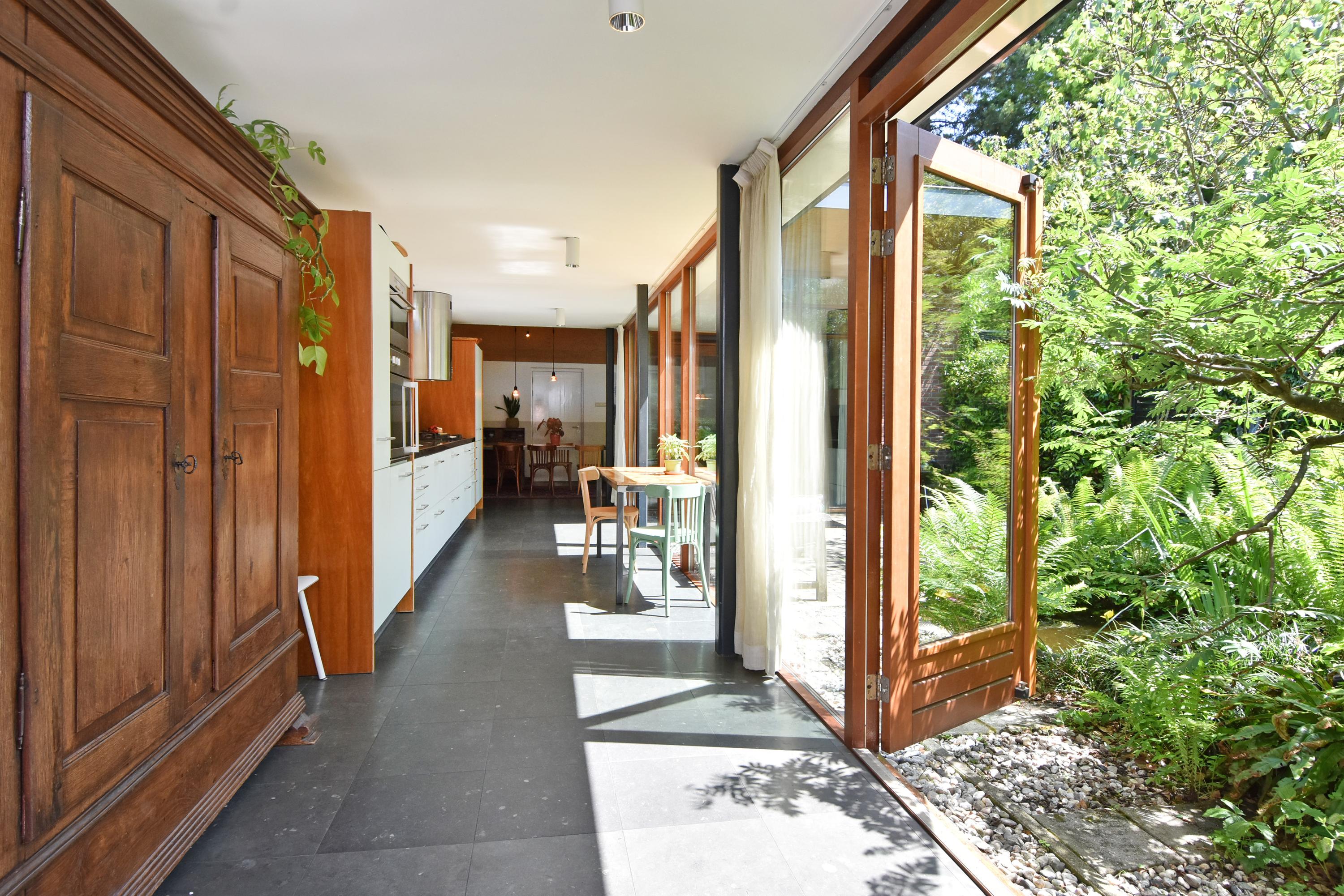 Een moderne aanbouw vormt een bijzonder geheel met het historische huis. Hier vind je de volledig ingerichte en uitgebreide keuken, voorzien van groot blok met rvs-aanrechtblad, ladenblokken, prima werkruimte en veel (design) inbouw-apparatuur, die met grote raampartijen uniek uitzicht heeft tot de fraai aangelegde, zeer groene en zonnige tuin. Aansluitend vind je een royale eet- en muziekkamer, welke ook via openslaande deuren toegang biedt tot de achtertuin. Deze eetkamer maakt het eveneens mogelijk om de achtergelegen royale garage te bereiken. Uiteraard kun je de garage, mede voorzien van daglicht, ook via de naastgelegen straat bereiken.