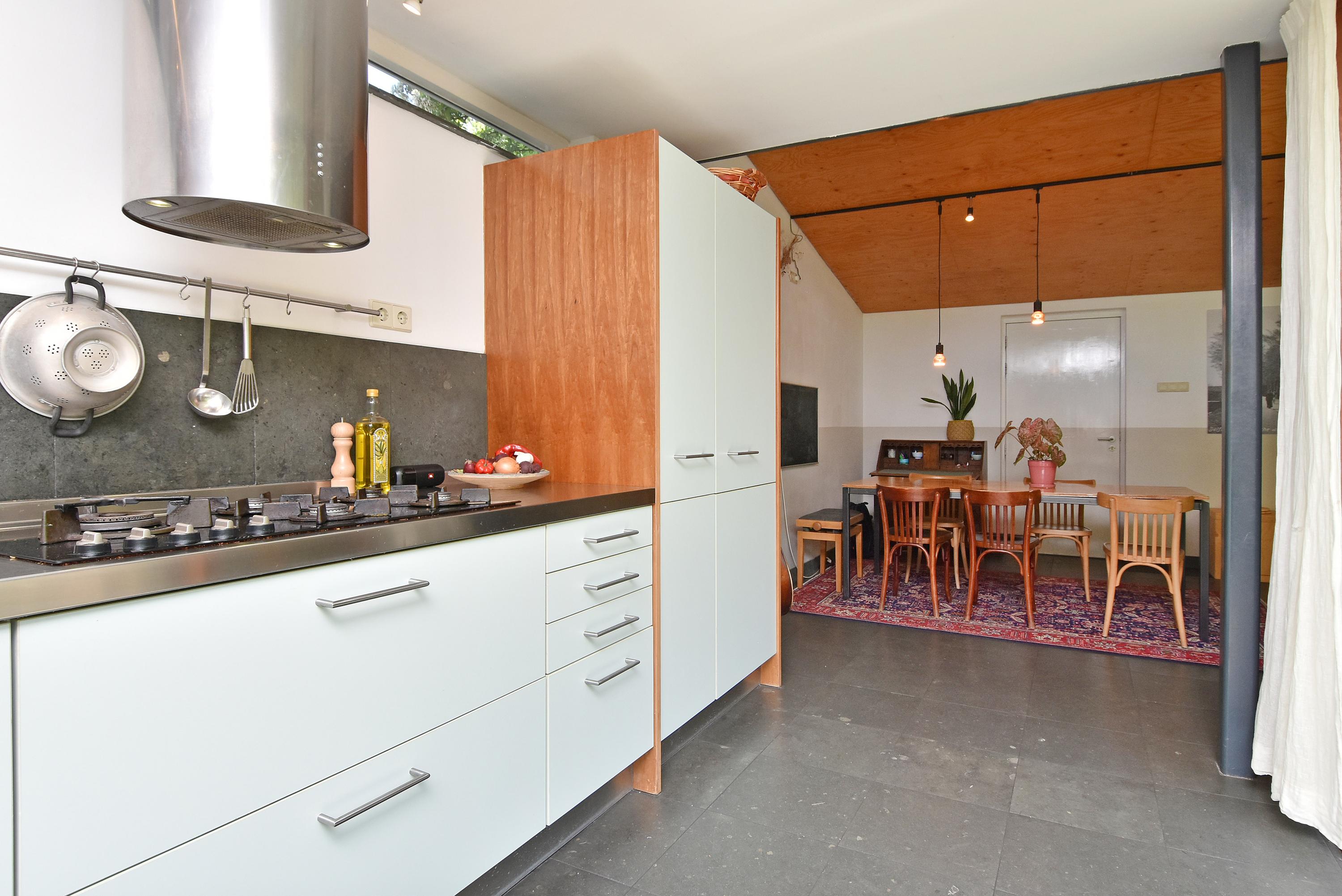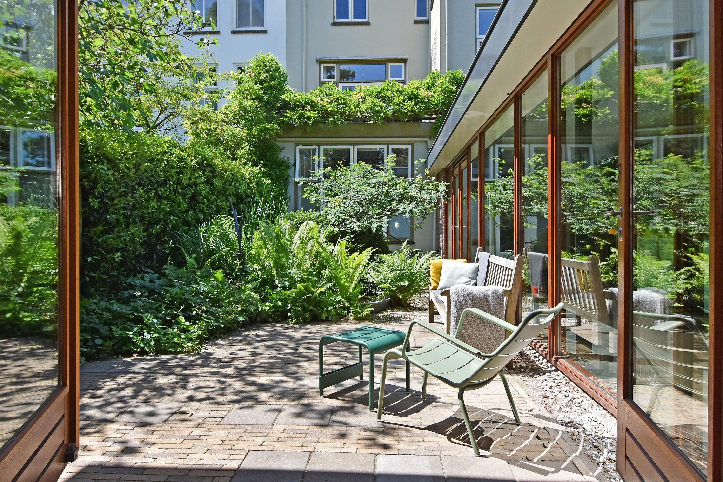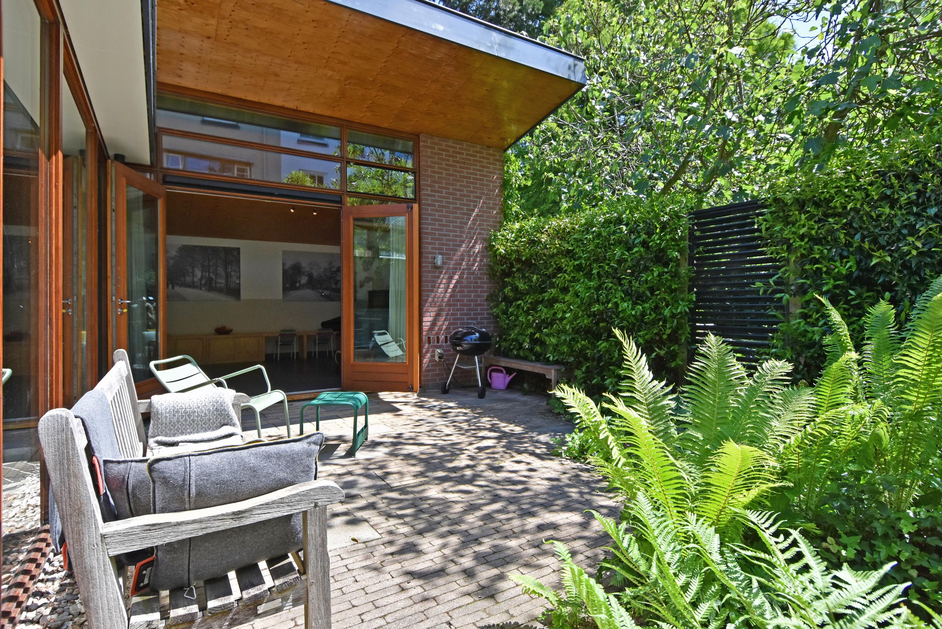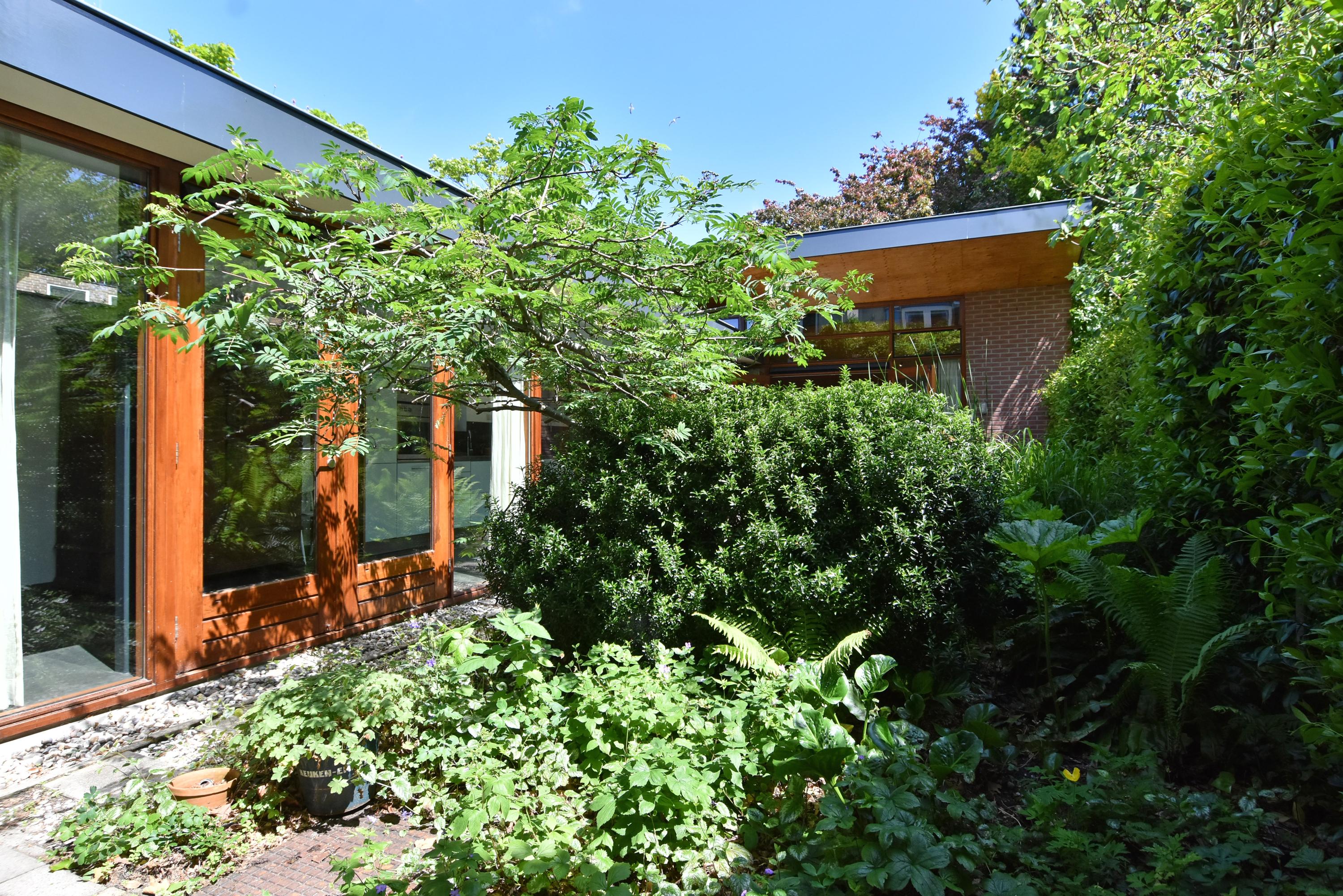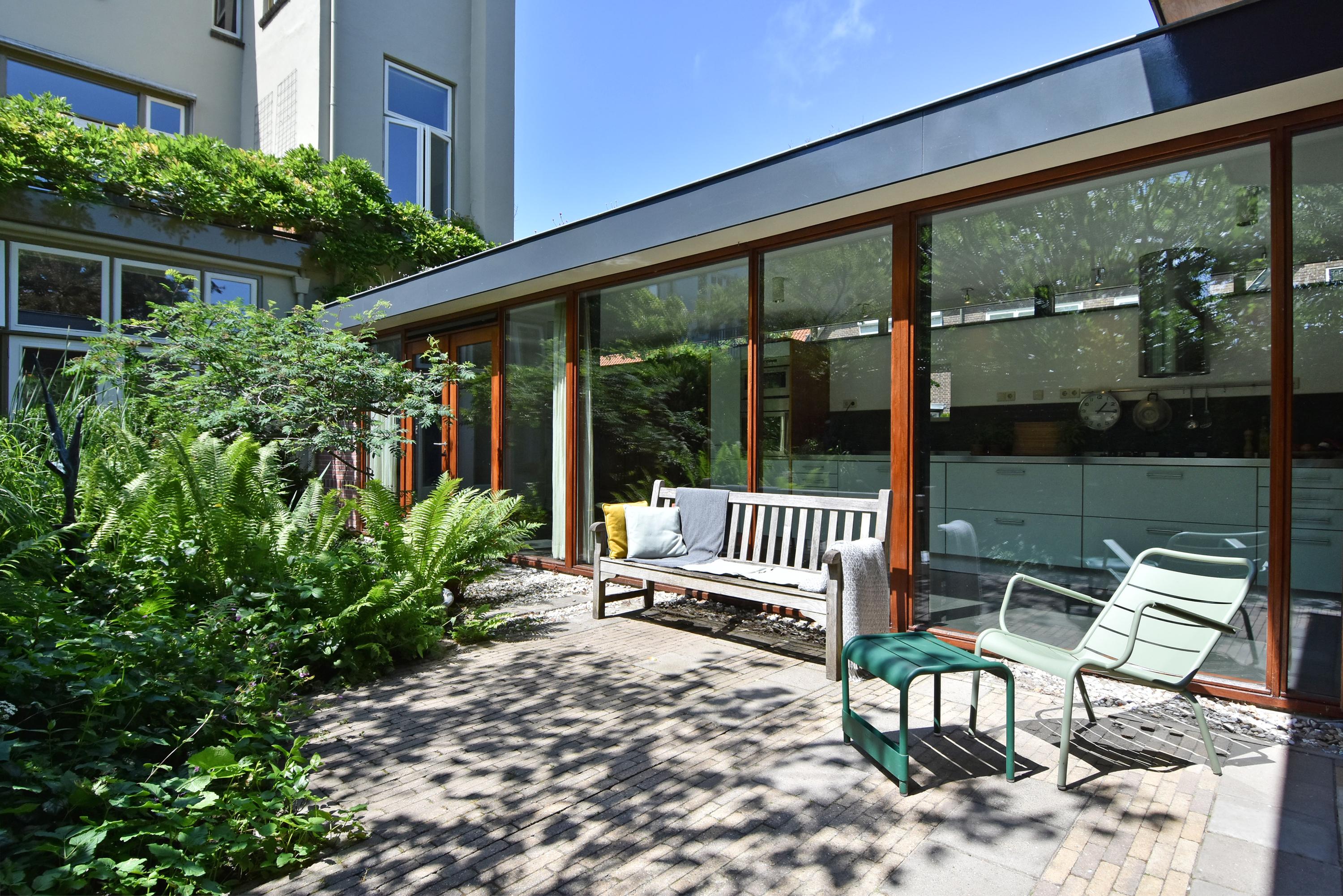 Een moderne aanbouw vormt een bijzonder geheel met het historische huis. Hier vind je de volledig ingerichte en uitgebreide keuken, voorzien van groot blok met rvs-aanrechtblad, ladenblokken, prima werkruimte en veel (design) inbouw-apparatuur, die met grote raampartijen uniek uitzicht heeft tot de fraai aangelegde, zeer groene en zonnige tuin. Aansluitend vind je een royale eet- en muziekkamer, welke ook via openslaande deuren toegang biedt tot de achtertuin. Deze eetkamer maakt het eveneens mogelijk om de achtergelegen royale garage te bereiken. Uiteraard kun je de garage, mede voorzien van daglicht, ook via de naastgelegen straat bereiken.