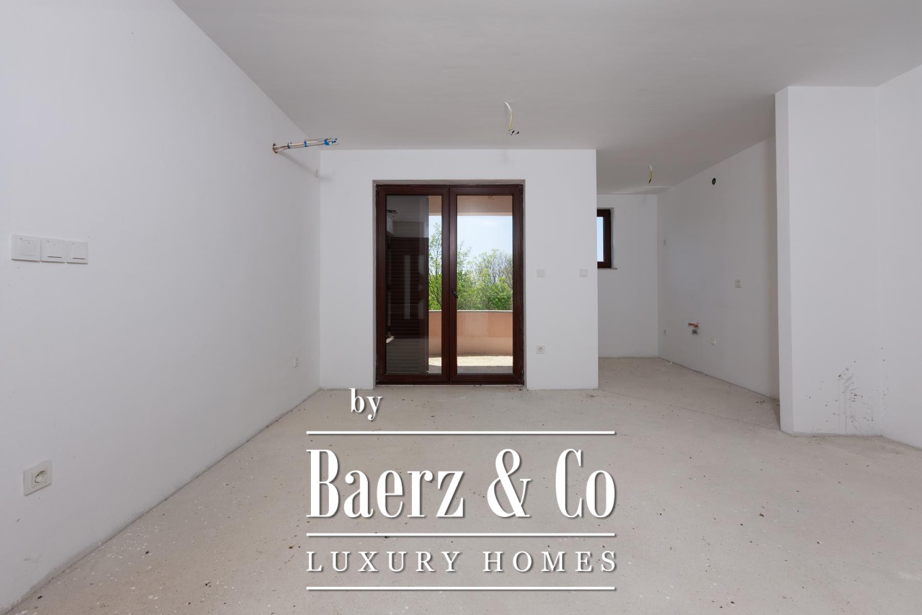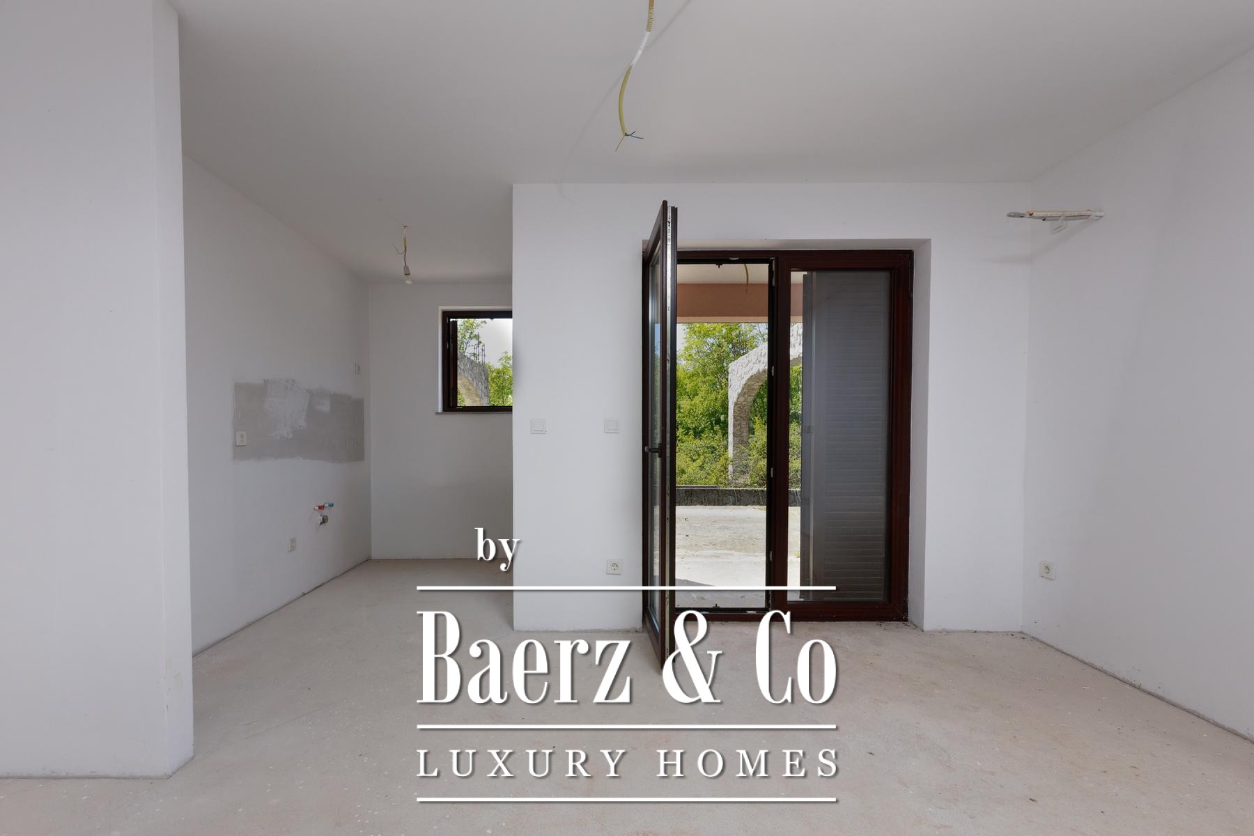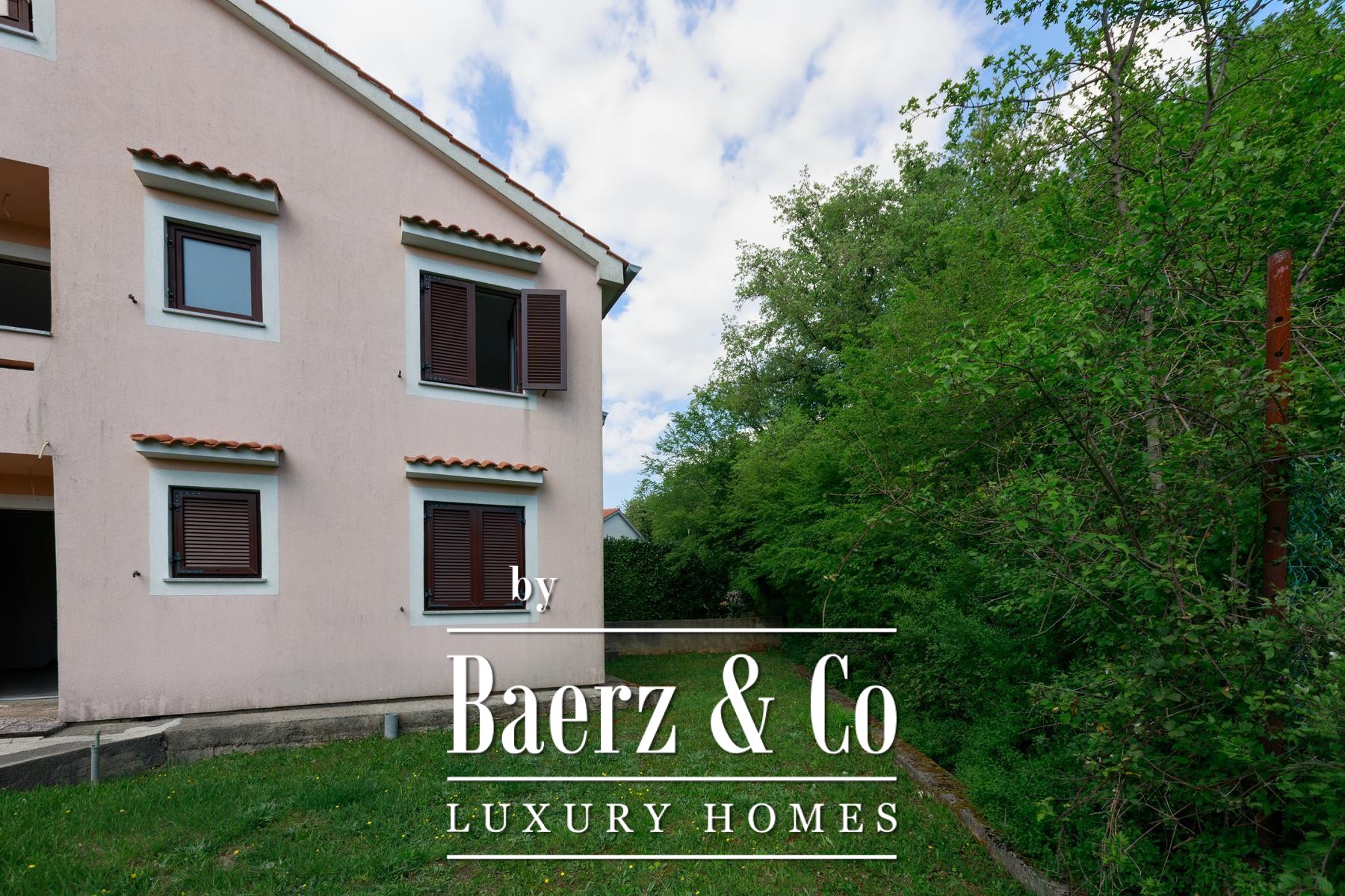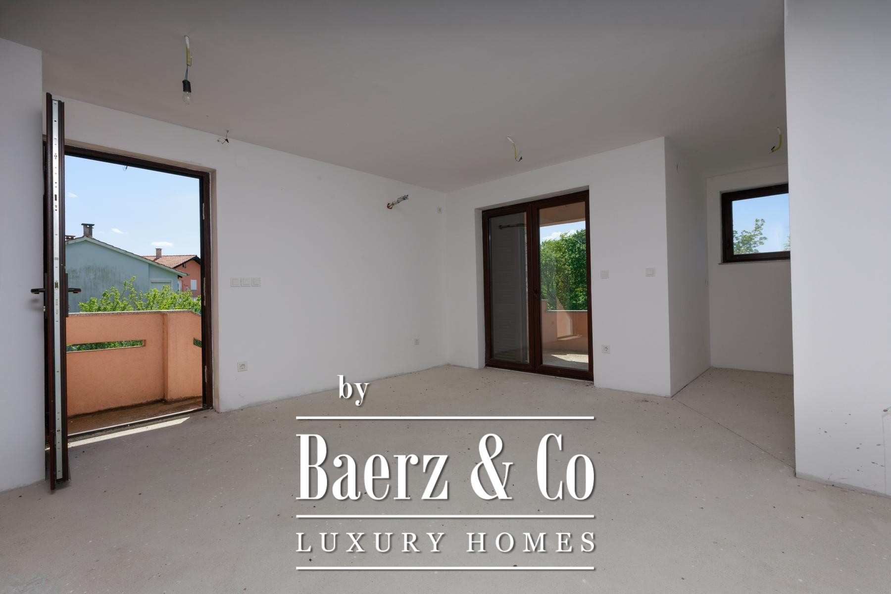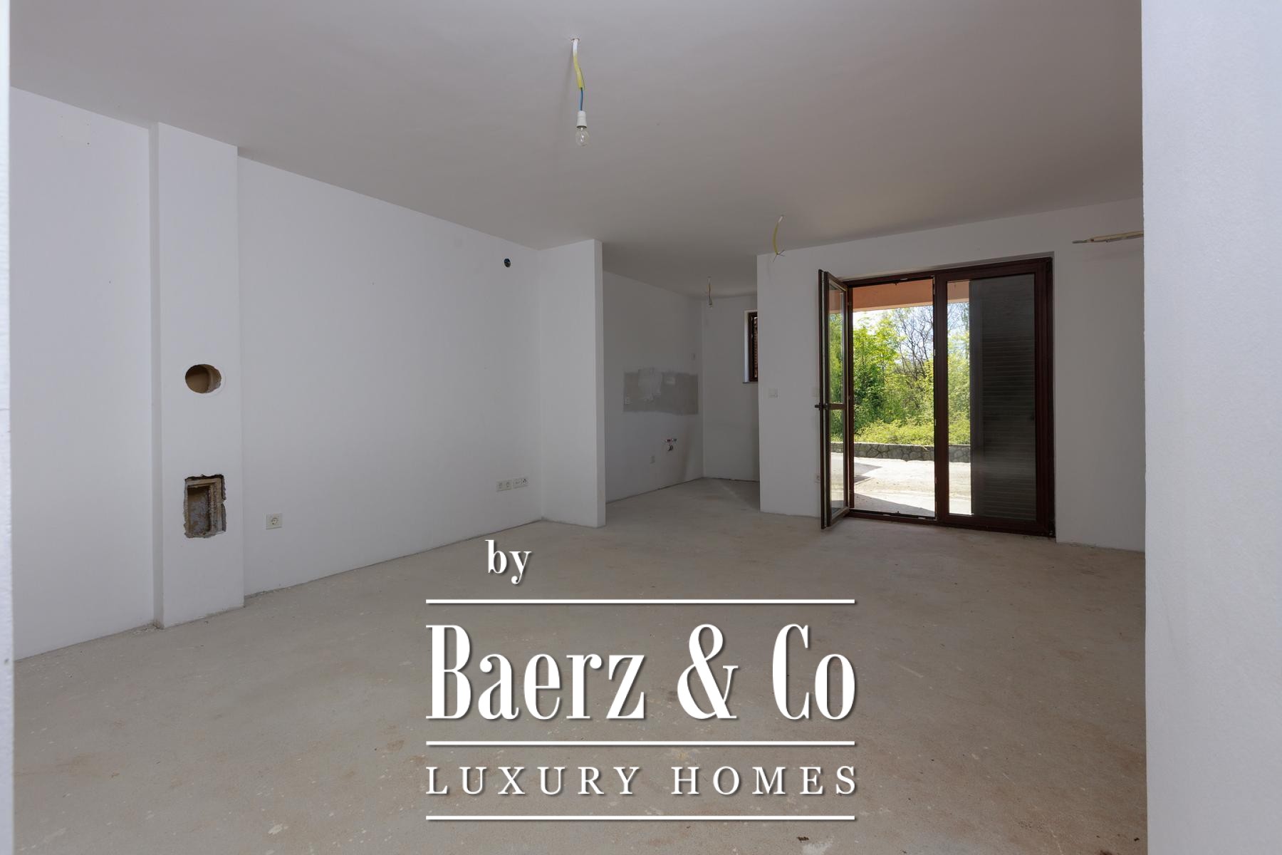 Beide helften van het object beschikken over een eigen tuin, met voldoende ruimte voor individuele zwembaden. Beganegrondappartementen openen naar privéterrassen, terwijl de appartementen op de eerste verdieping over balkons beschikken met uitzicht op het groen. Een aparte eetruimte ligt in de natuurlijke schaduw, ideaal voor buitenverblijven. De rust van Kras, ver van de drukte van de stad en toch op korte rijafstand van zee en voorzieningen, biedt een verfijnd maar ontspannen levensritme.
