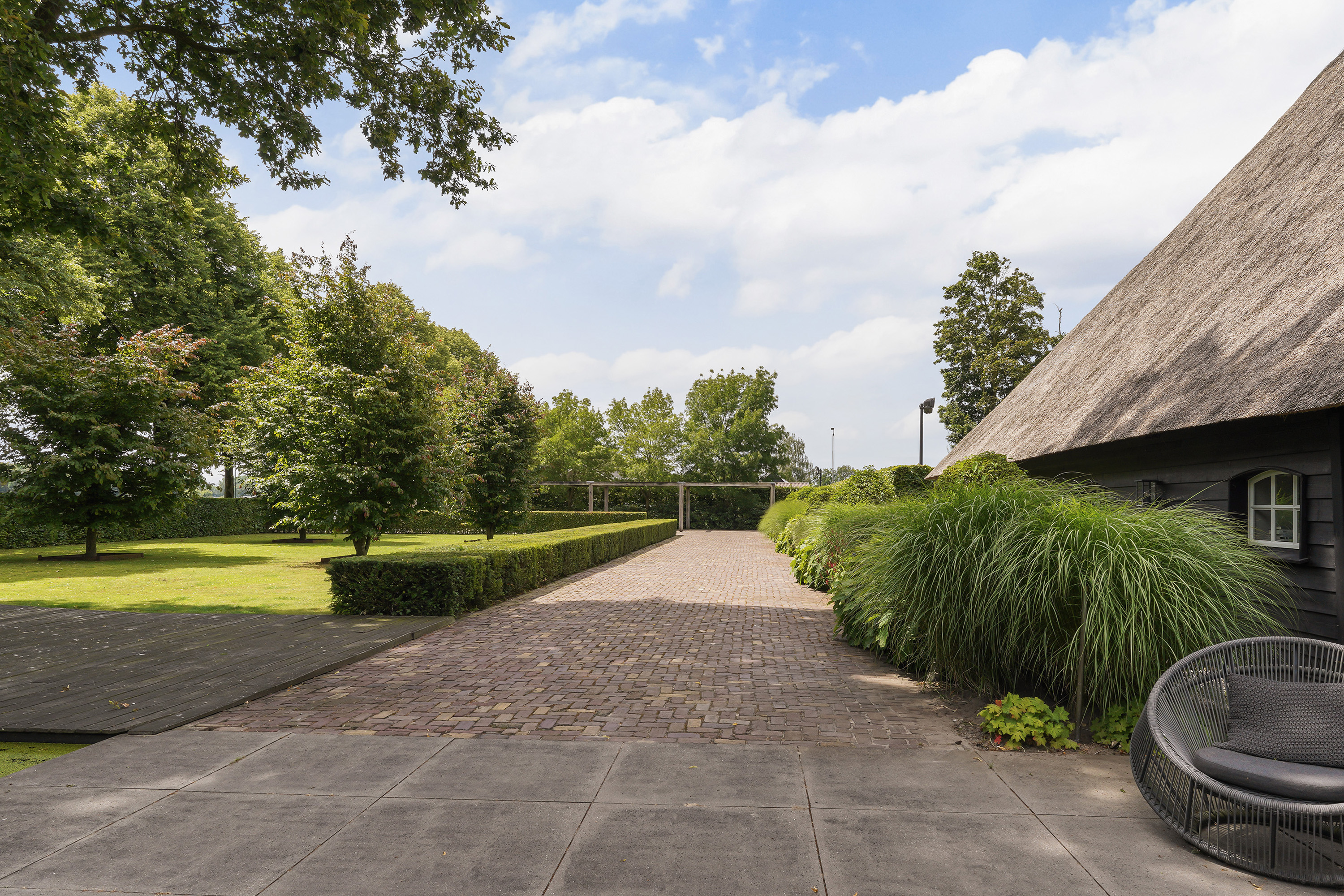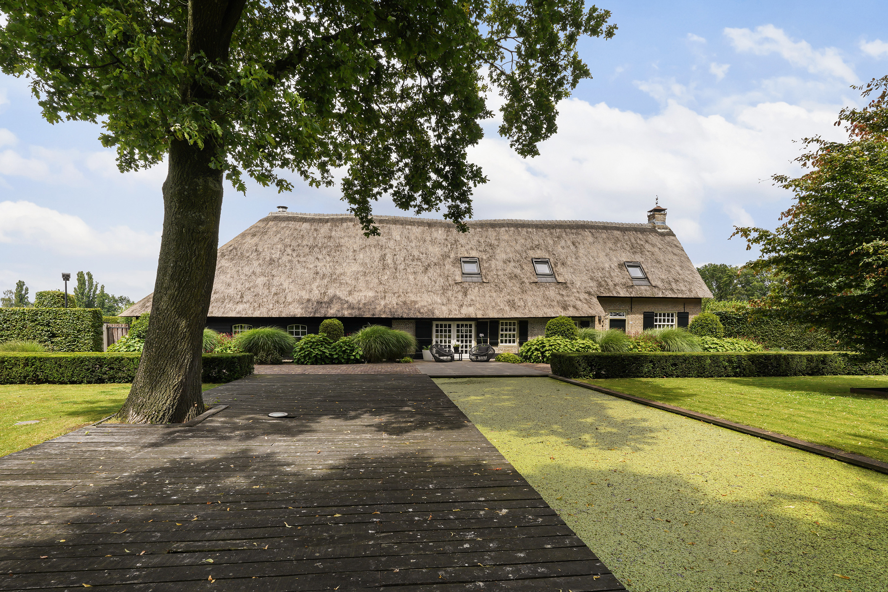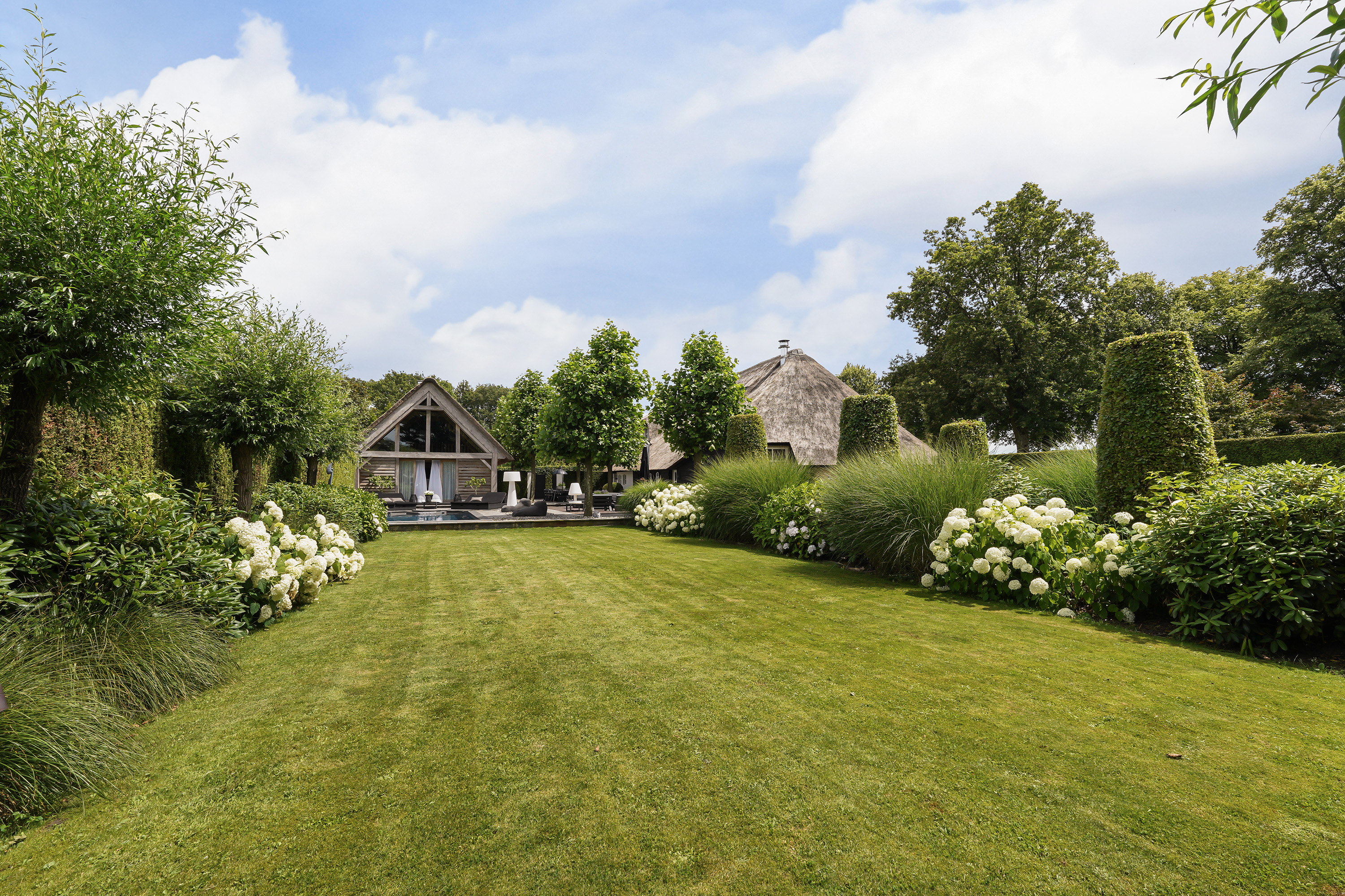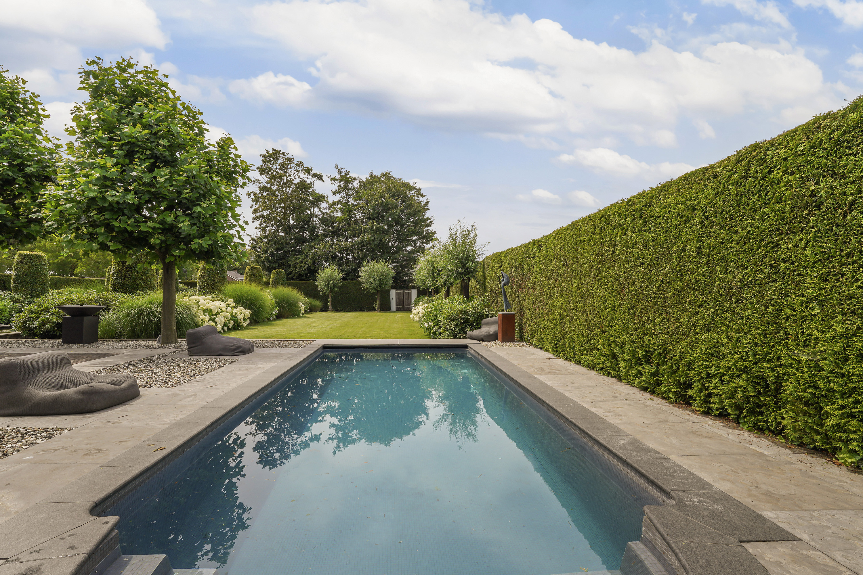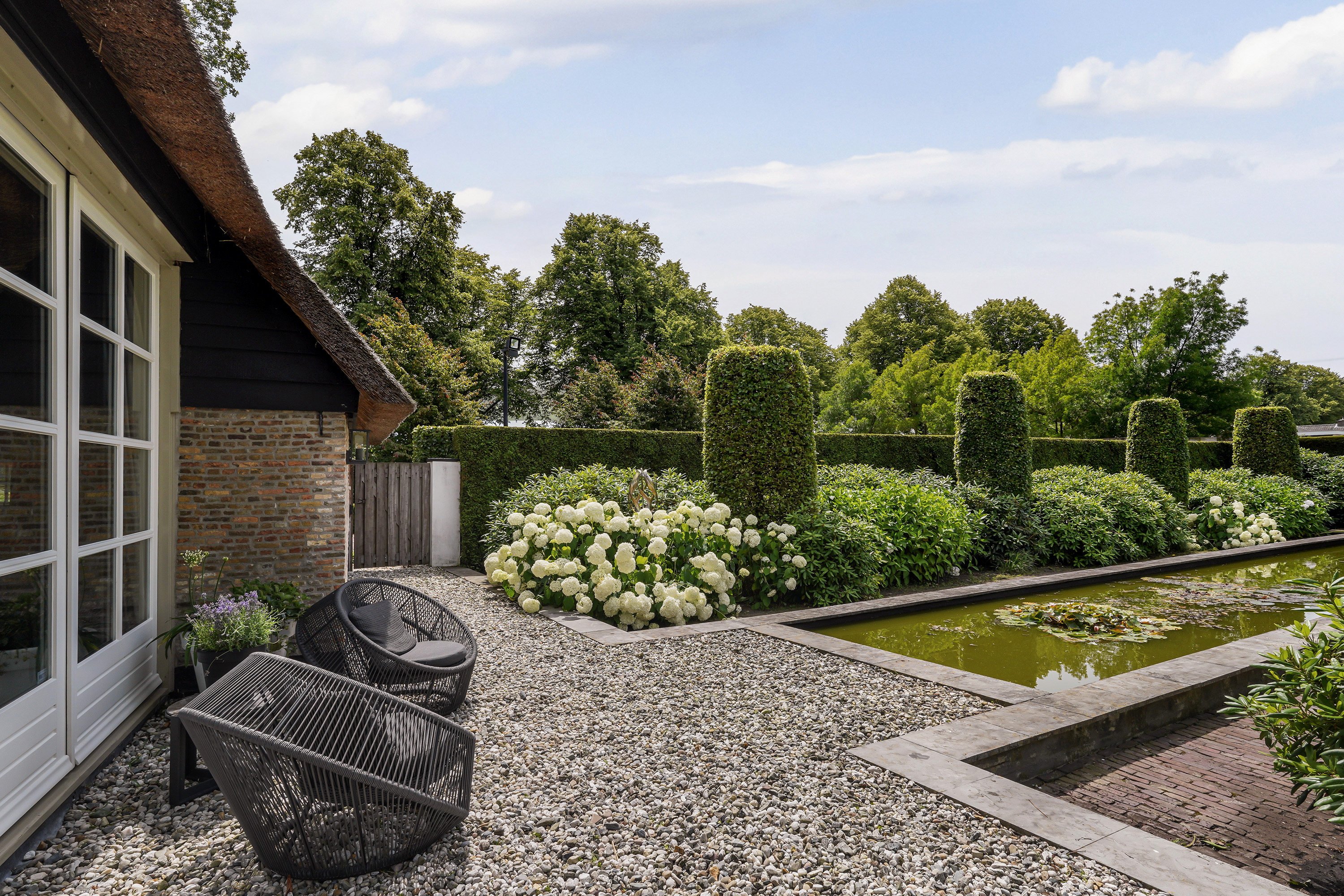 Het riante perceel van maar liefst 3.610 m² maakt de beleving compleet. Via de statige oprijlaan bereikt u de prachtige, onder architectuur aangelegde tuin met sierlijke vijverpartijen, fraaie zichtlijnen en volop privacy. Hier vindt u ook het verwarmde zwembad met jetstream, de rietgedekte carport en een luxueus guesthouse met sauna, keuken en openhaard. Het geheel is volledig omheind en beschikt over twee elektrische toegangspoorten.