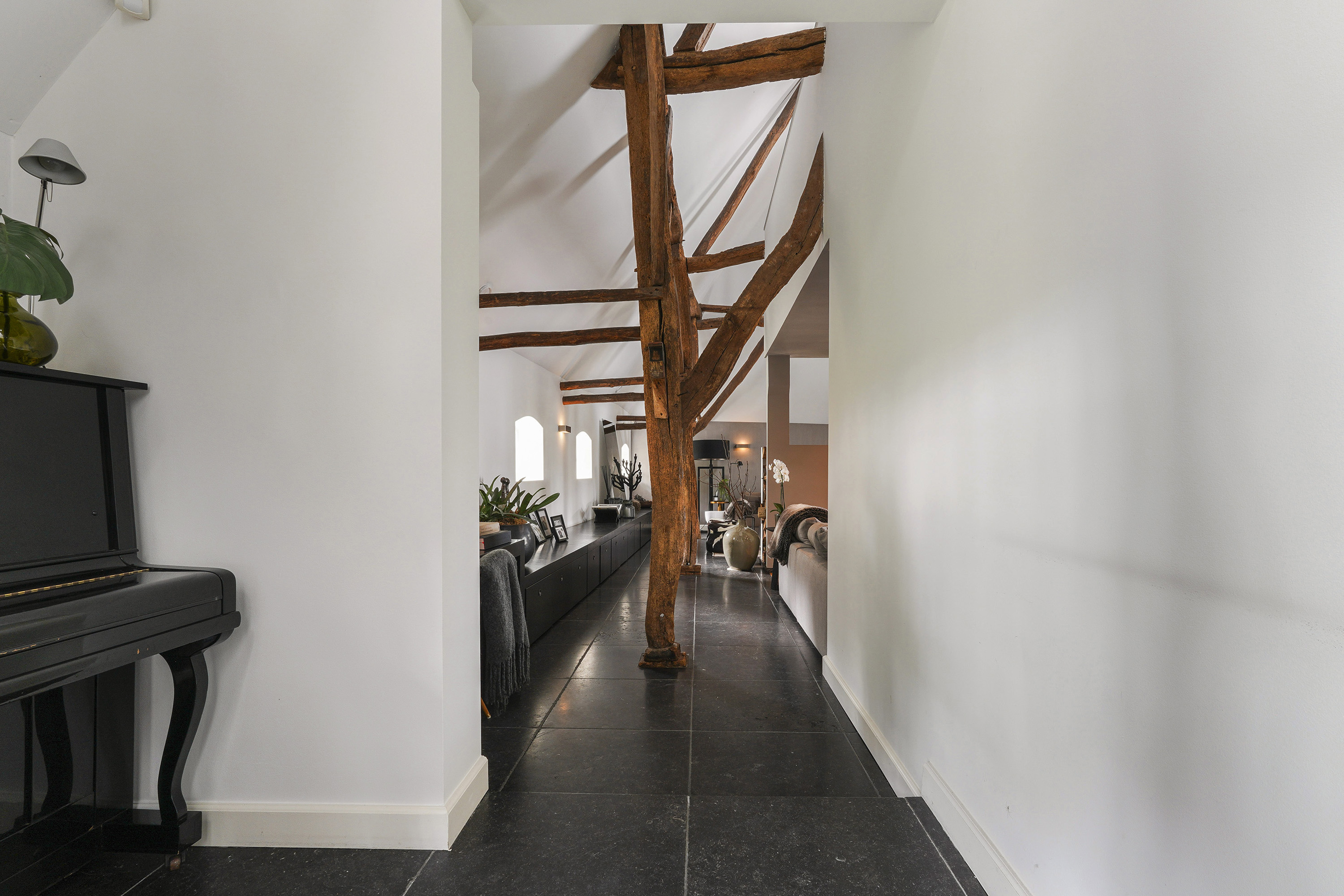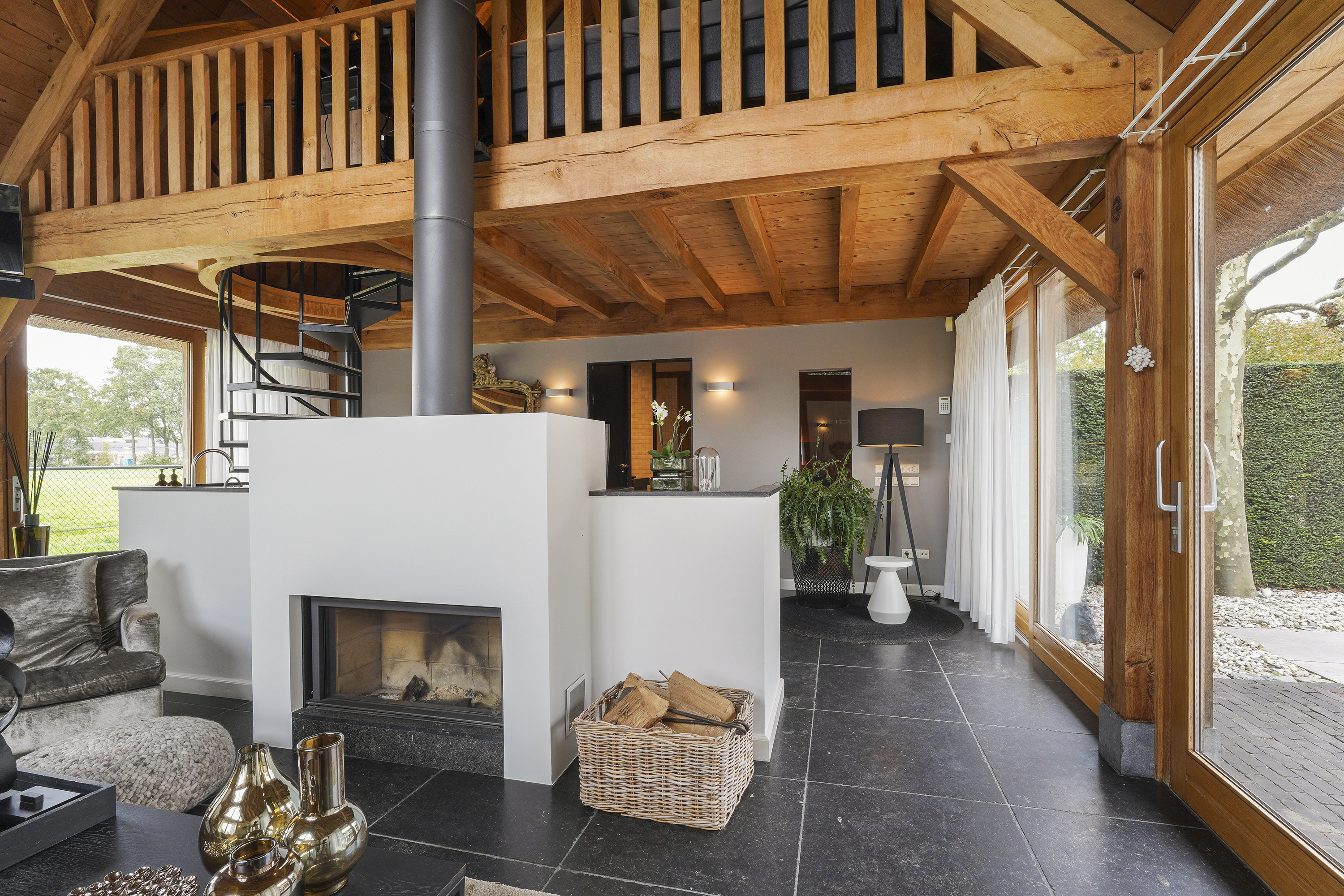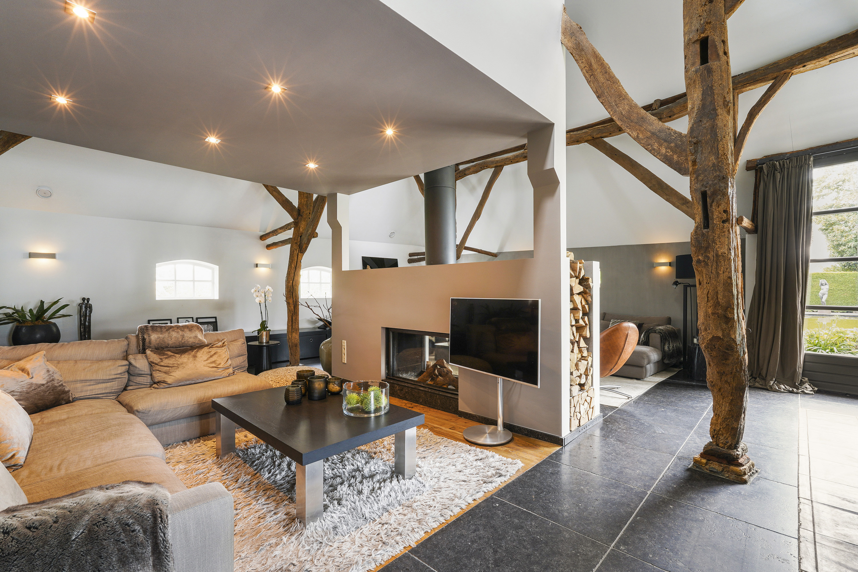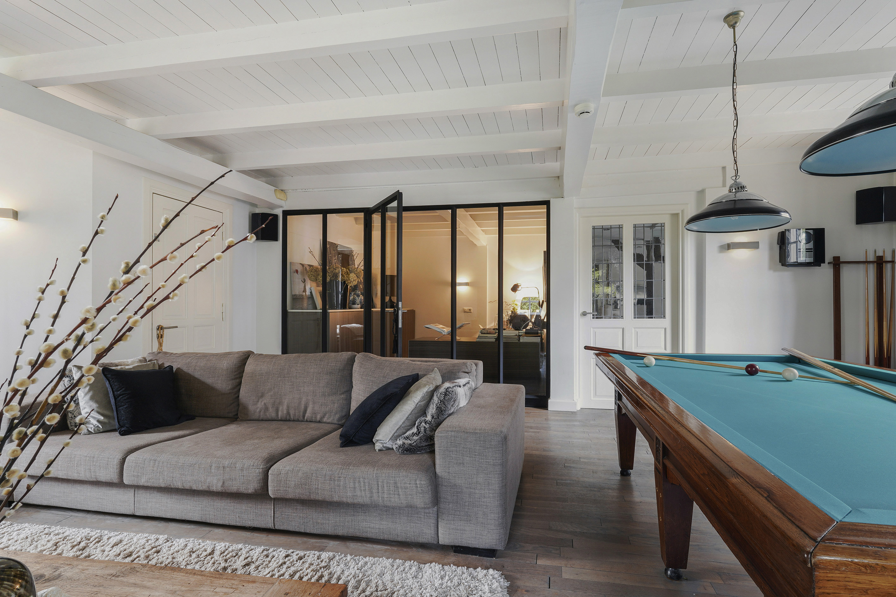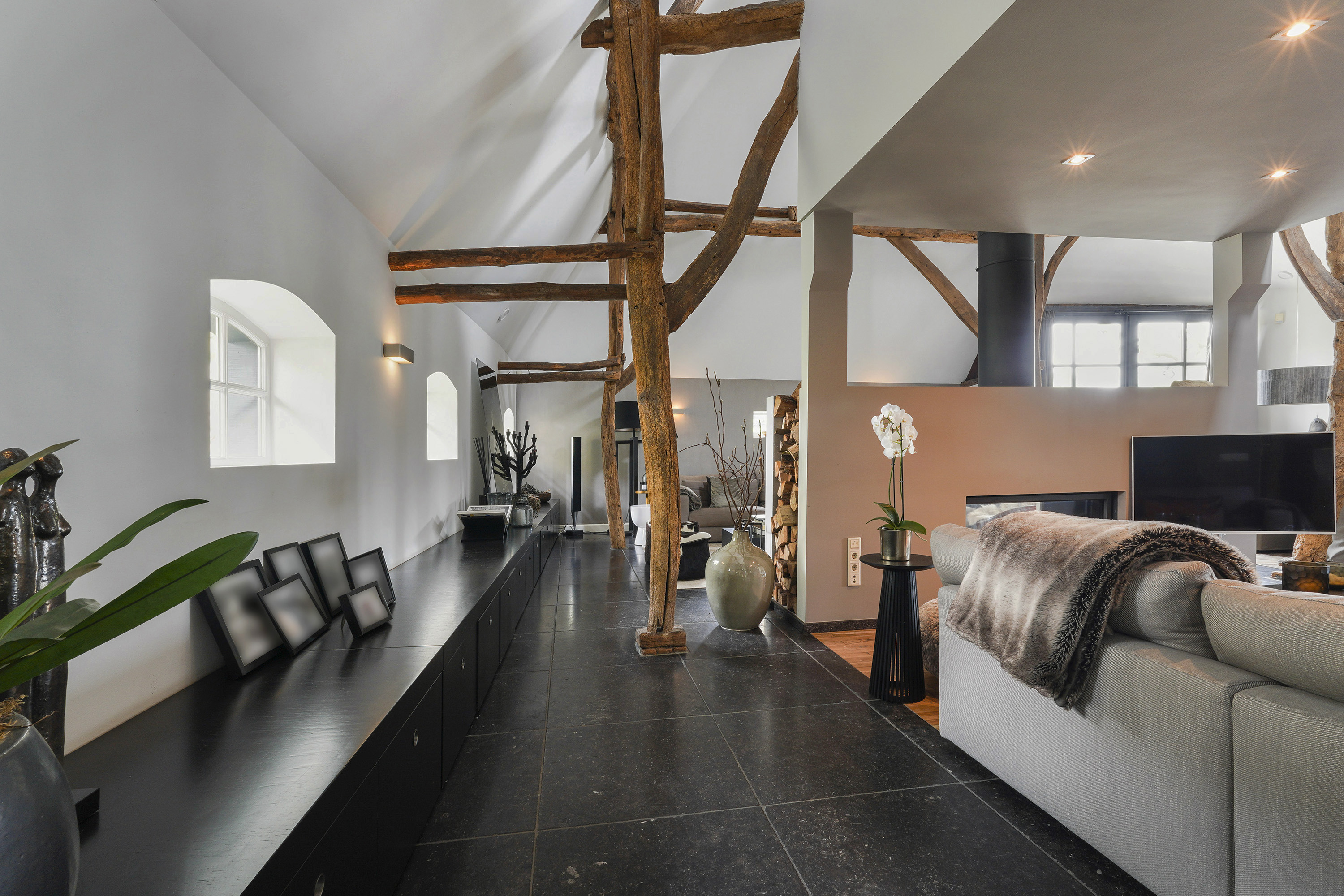Binnen ademt elke ruimte karakter. Aan de rechterzijde van de woning bevindt zich de voormalige woonkamer, nu ingericht als stijlvolle biljartkamer met authentieke schouw en originele eikendelen vloer. De woonkeuken is het hart van het huis: een combinatie van Belgisch hardsteen en eikenhout, voorzien van kookeiland, topapparatuur en een warme sfeer. Vanuit hier loopt u door naar de lounge en de living, waar een moderne tunnelhaard centraal staat en de hoge gebinten prachtig contrasteren met de strakke wanden. De vide en grote raampartijen zorgen voor een ruimtelijk effect en direct contact met de fraai aangelegde tuin.
