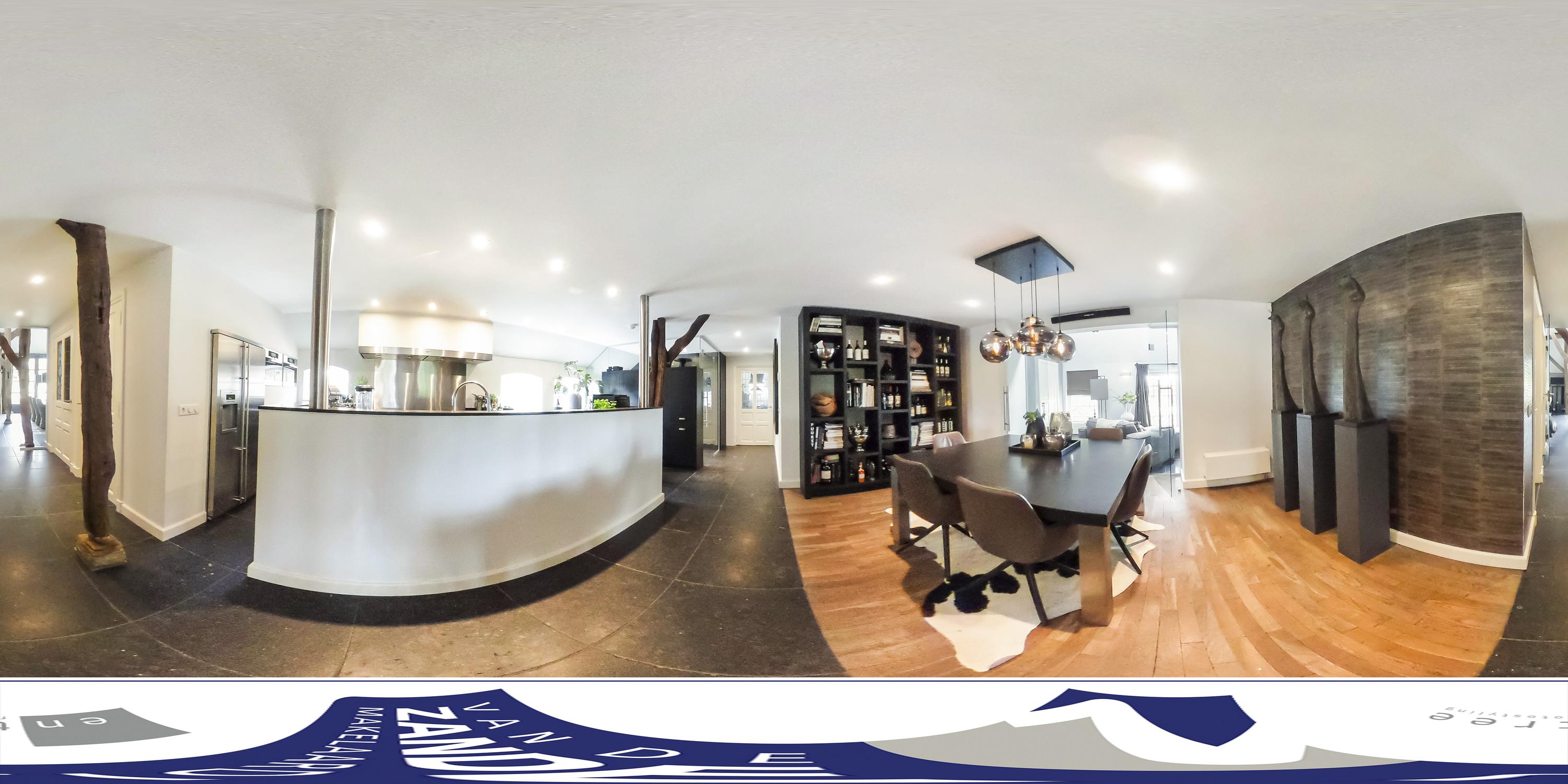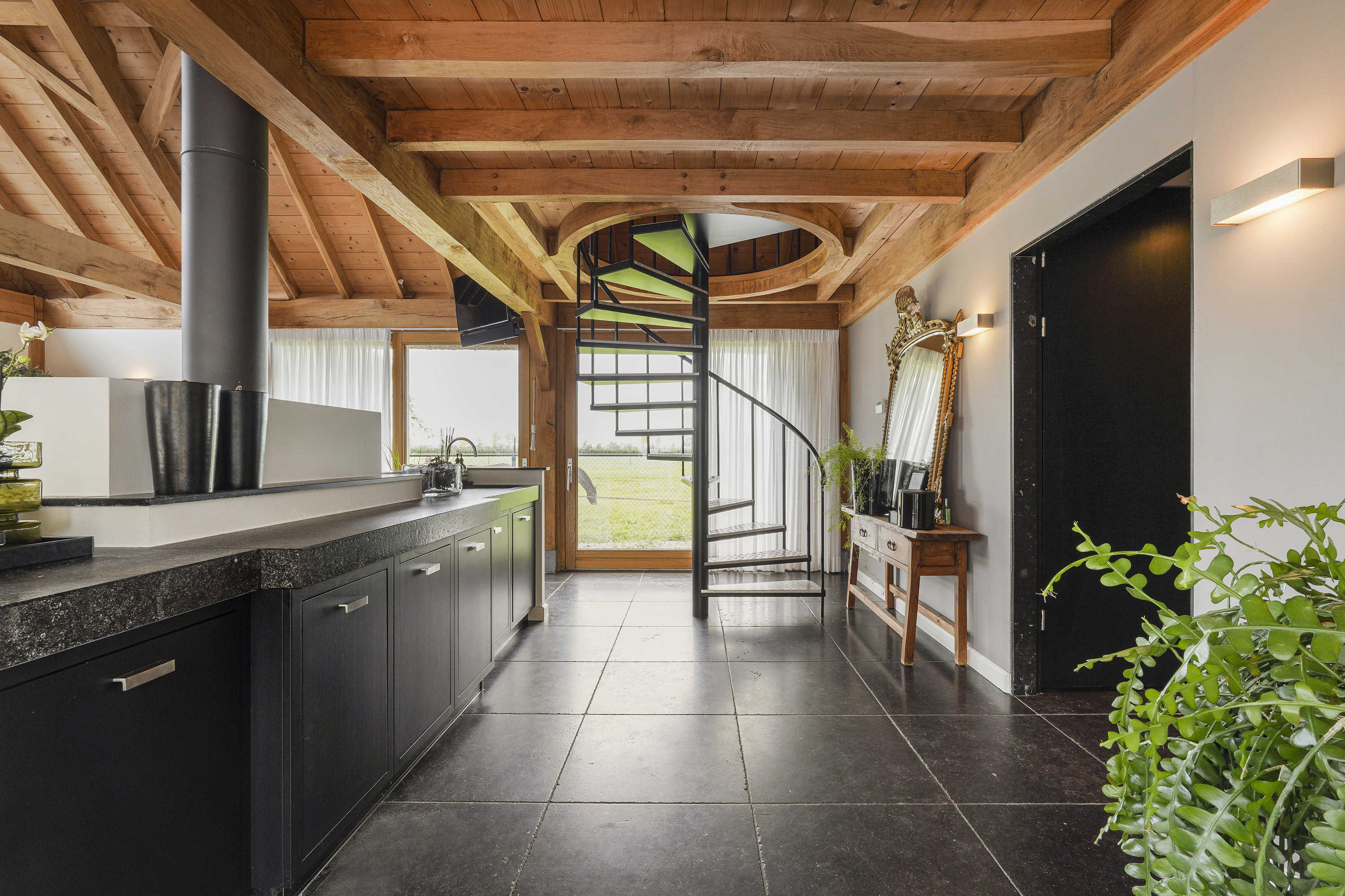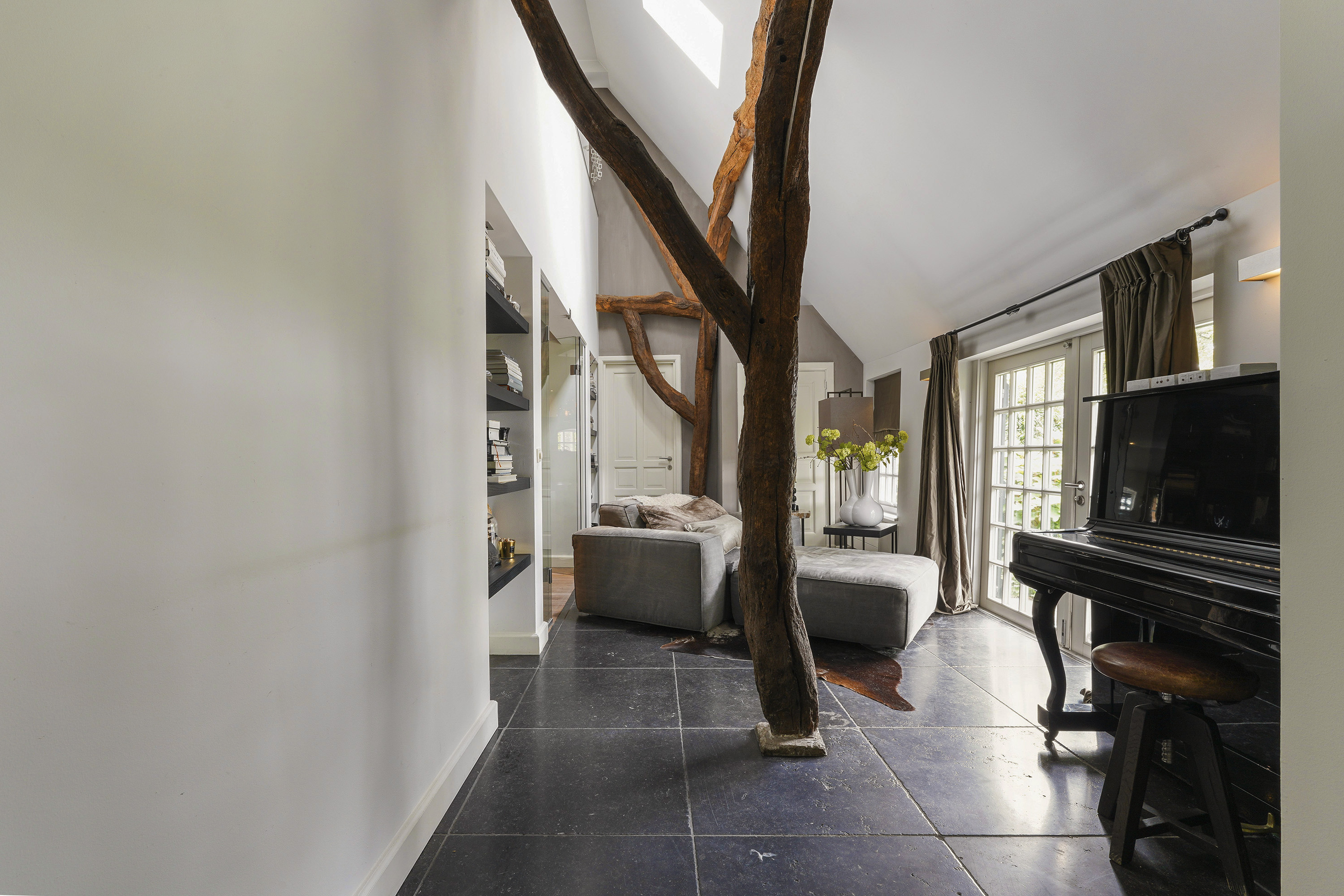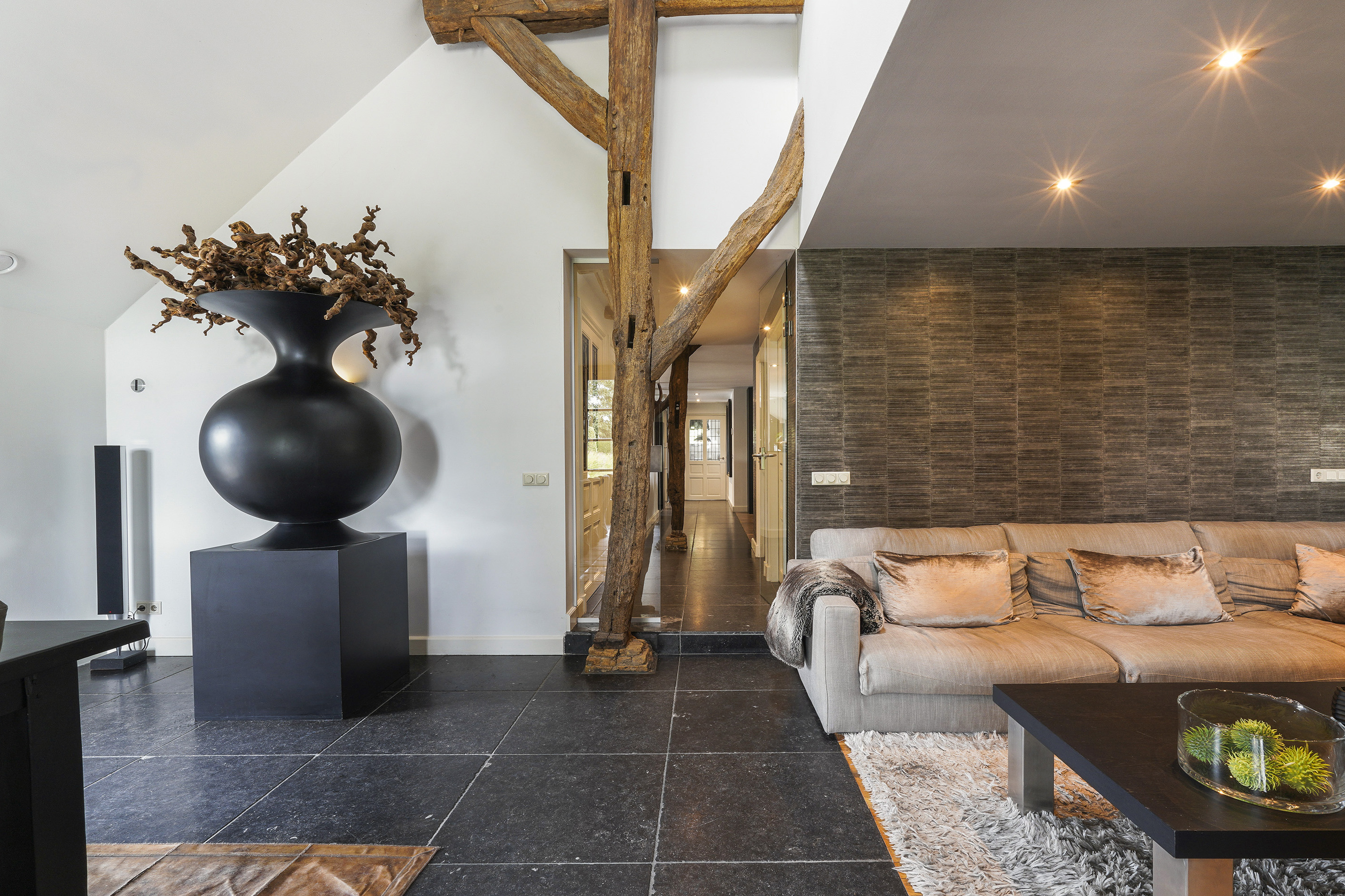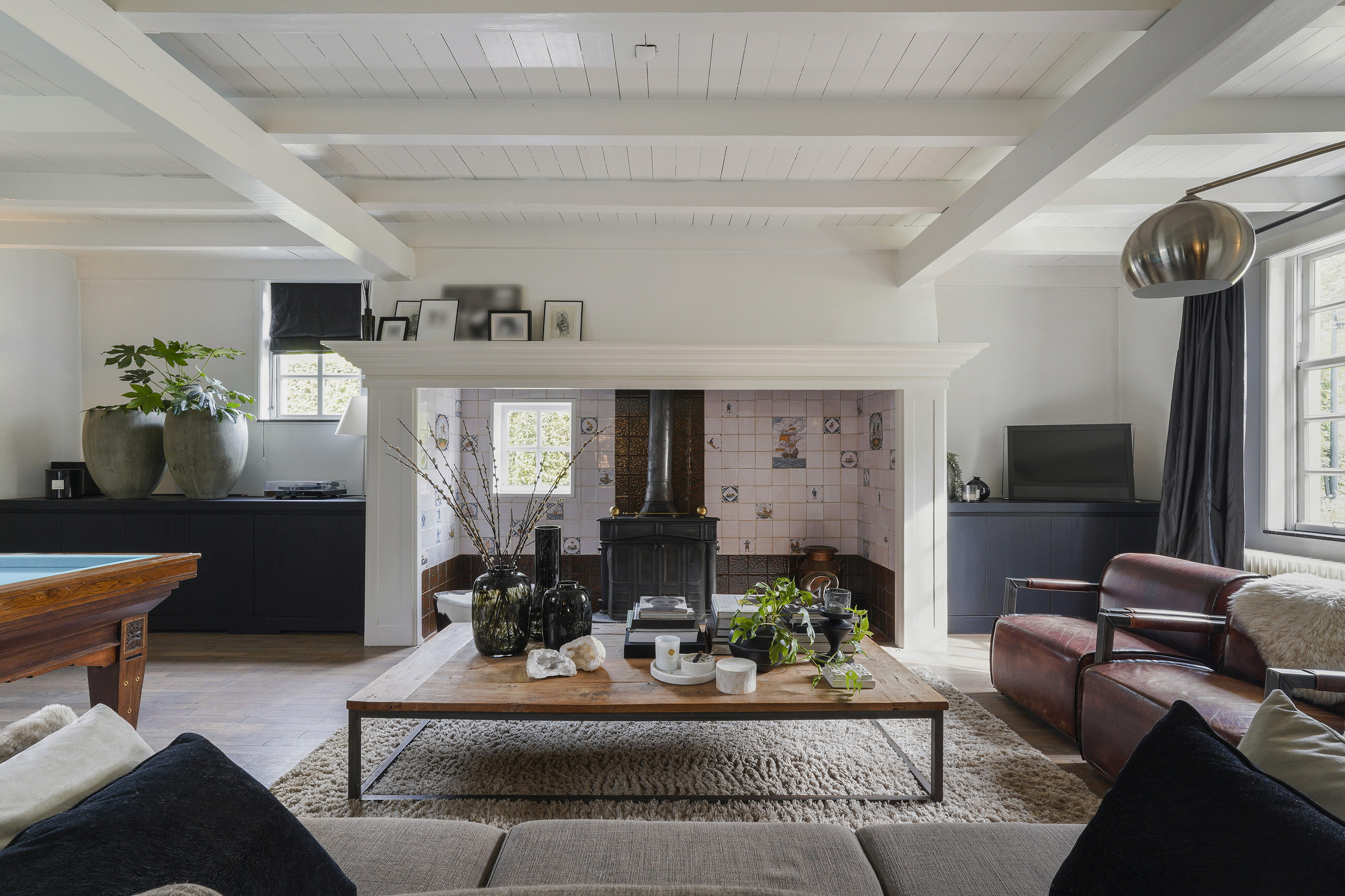 Binnen ademt elke ruimte karakter. Aan de rechterzijde van de woning bevindt zich de voormalige woonkamer, nu ingericht als stijlvolle biljartkamer met authentieke schouw en originele eikendelen vloer. De woonkeuken is het hart van het huis: een combinatie van Belgisch hardsteen en eikenhout, voorzien van kookeiland, topapparatuur en een warme sfeer. Vanuit hier loopt u door naar de lounge en de living, waar een moderne tunnelhaard centraal staat en de hoge gebinten prachtig contrasteren met de strakke wanden. De vide en grote raampartijen zorgen voor een ruimtelijk effect en direct contact met de fraai aangelegde tuin.