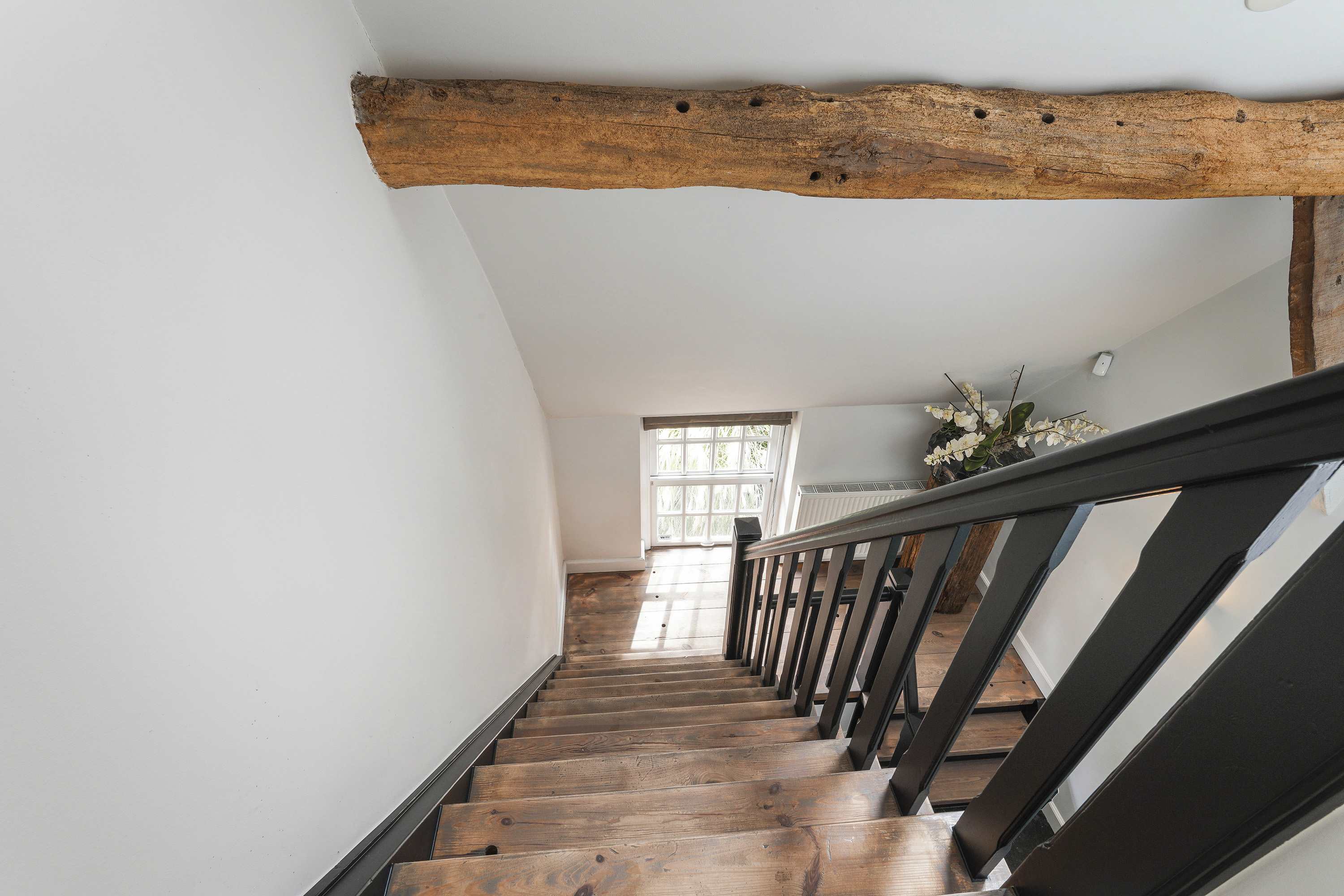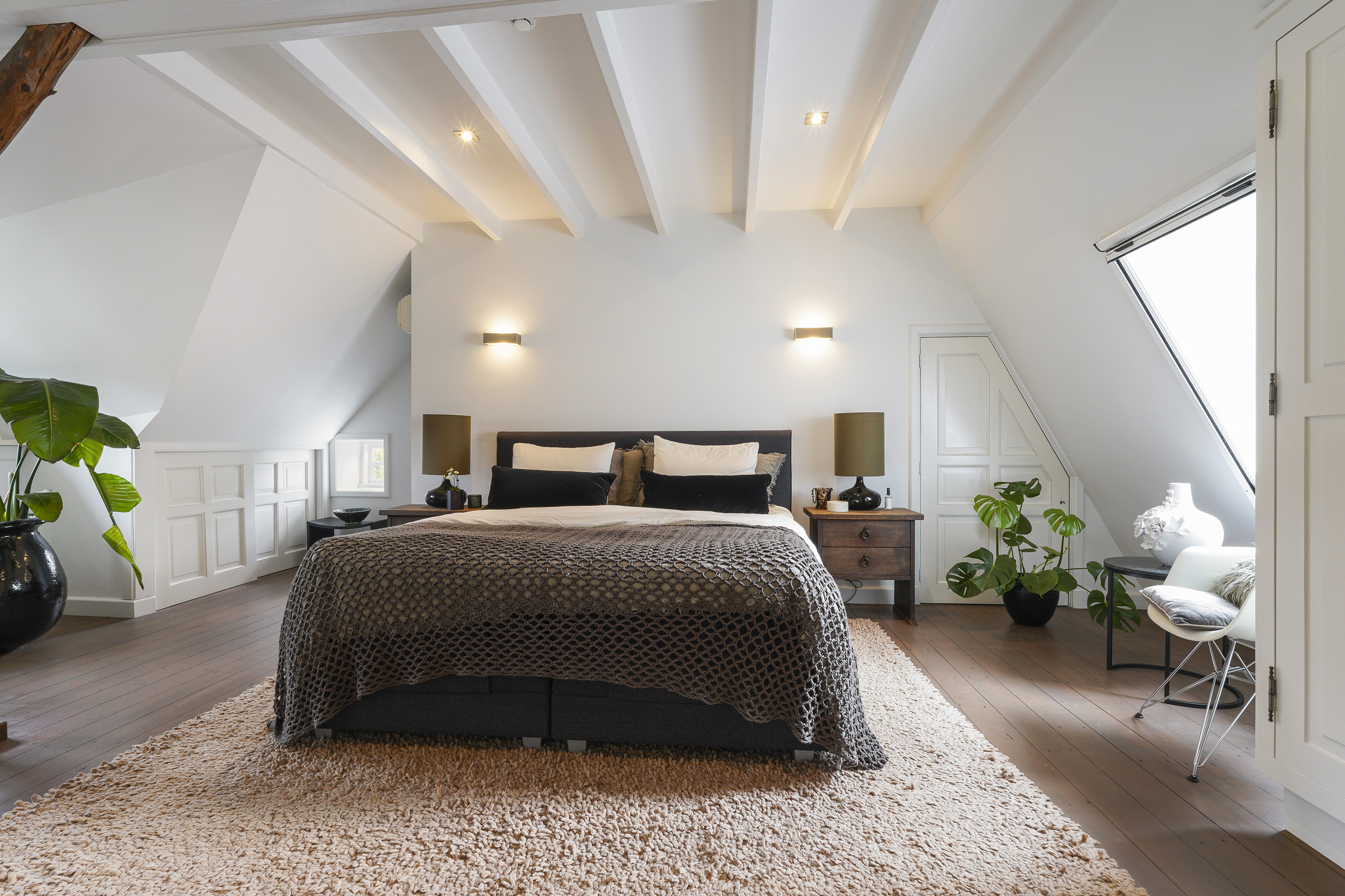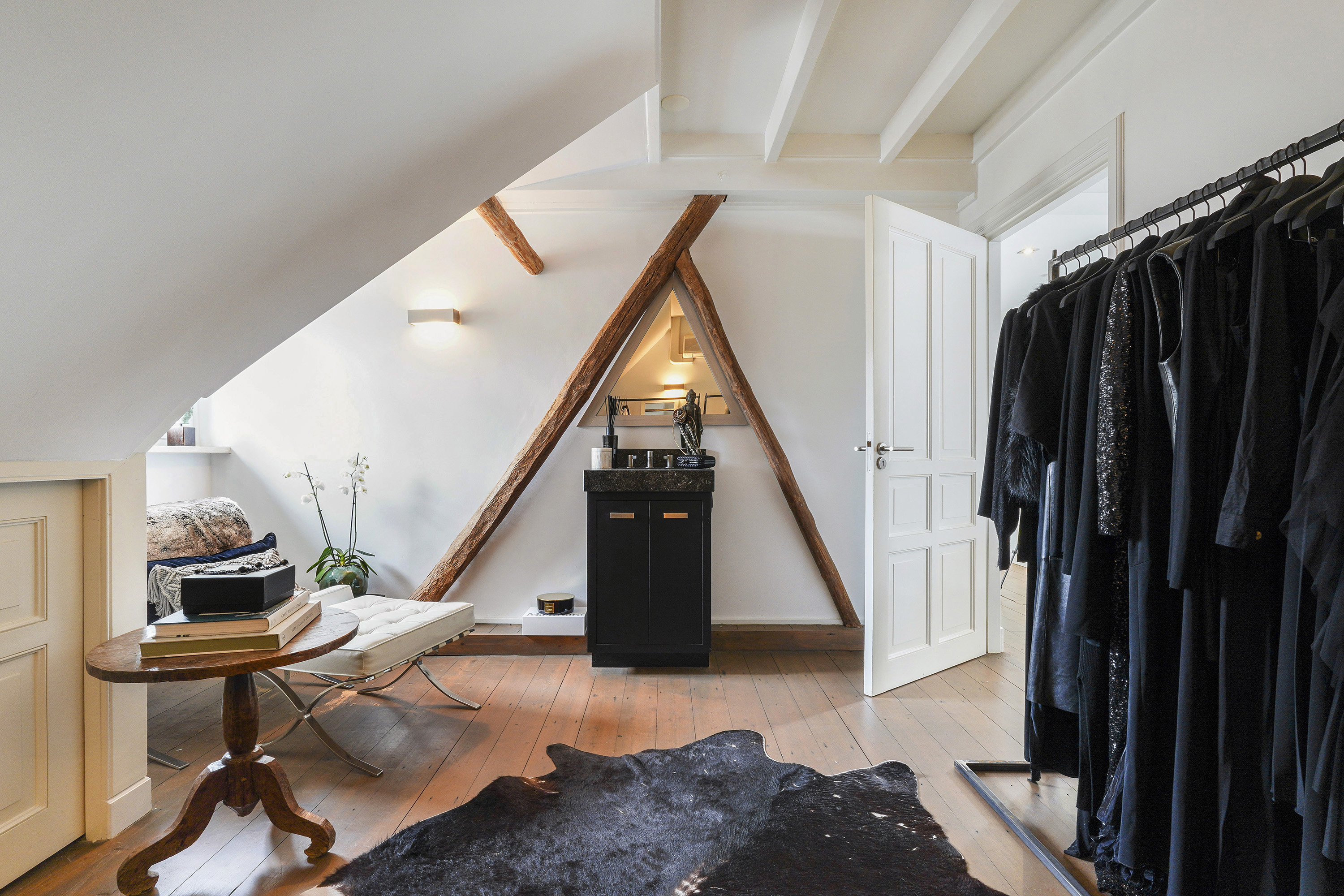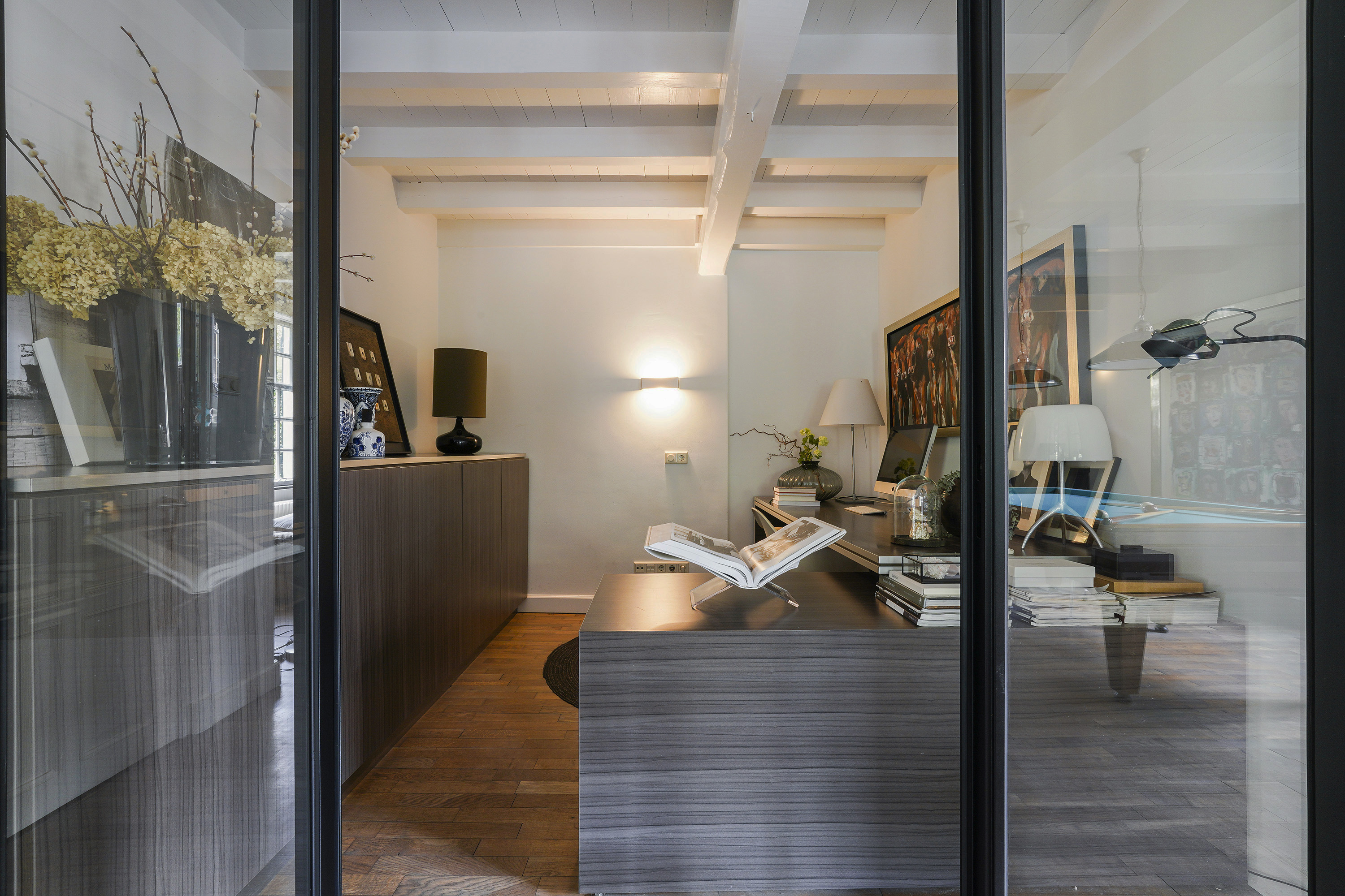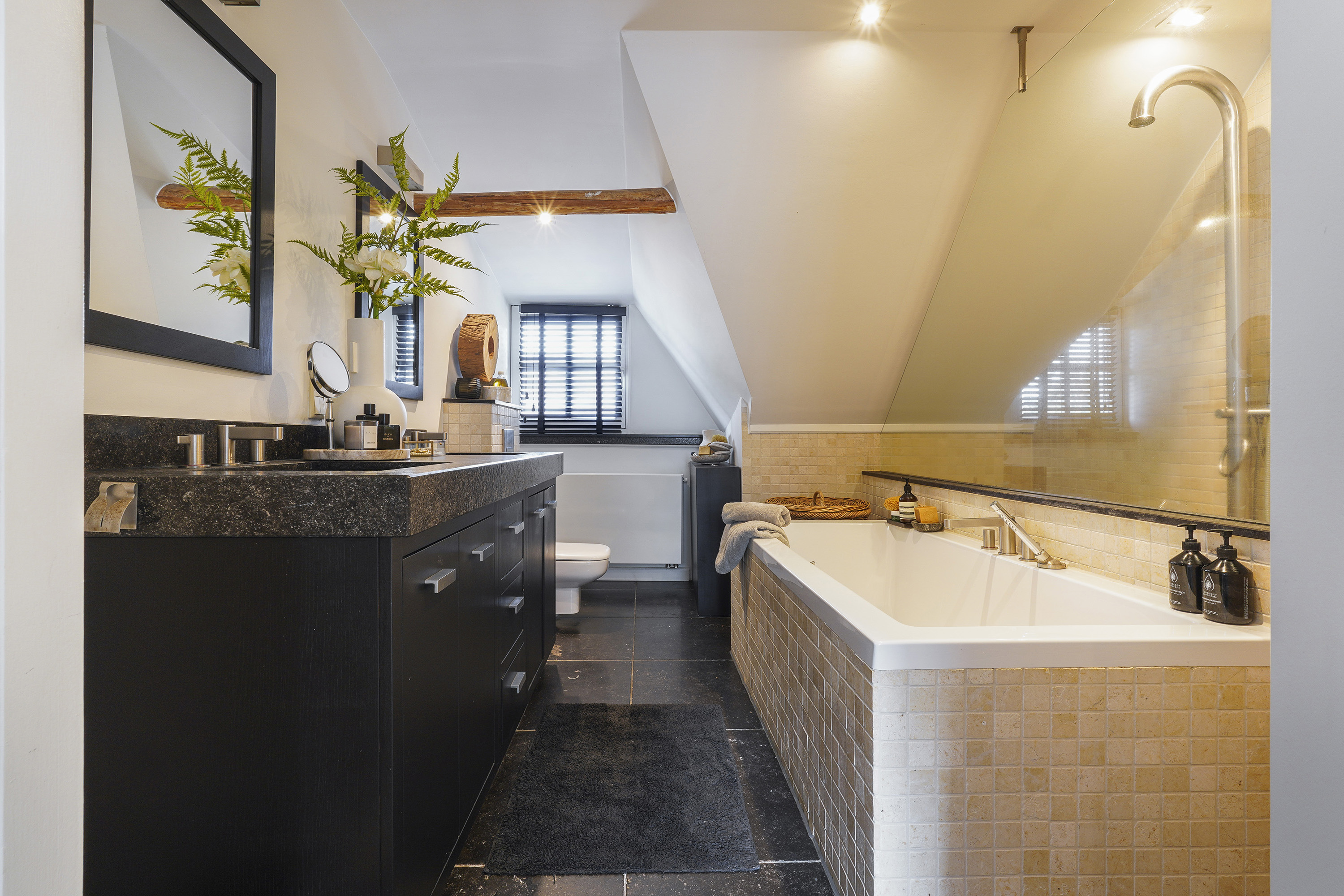 De verdieping biedt drie slaapkamers, alle voorzien van airco en houten vloeren met een bijzonder verhaal – afkomstig uit een kerk. De luxe badkamer is uitgerust met een ligbad, inloopdouche, dubbele wastafel en toilet. Extra bijzonder: een open werkkamer op de vide met uitzicht op de living beneden.
