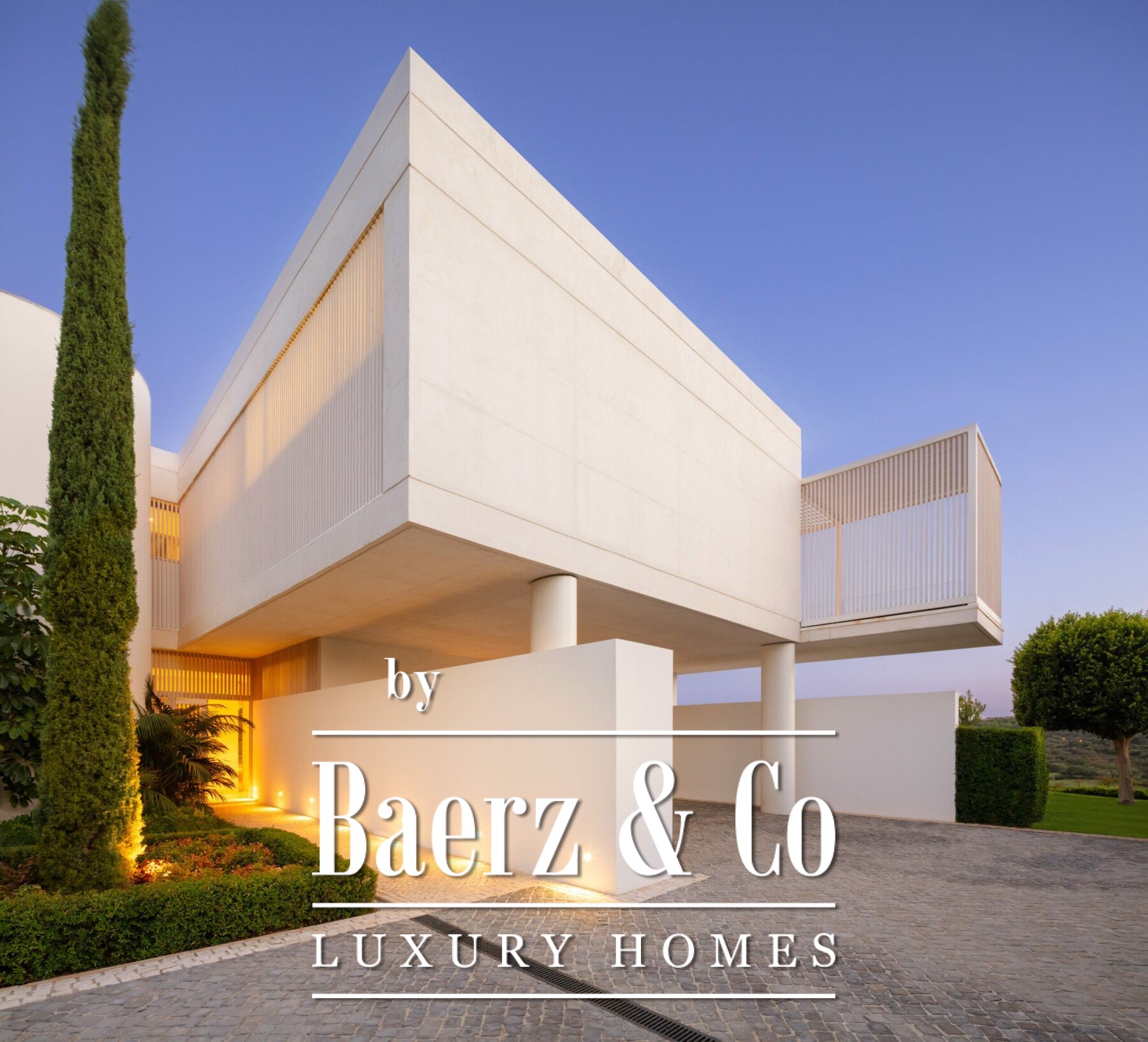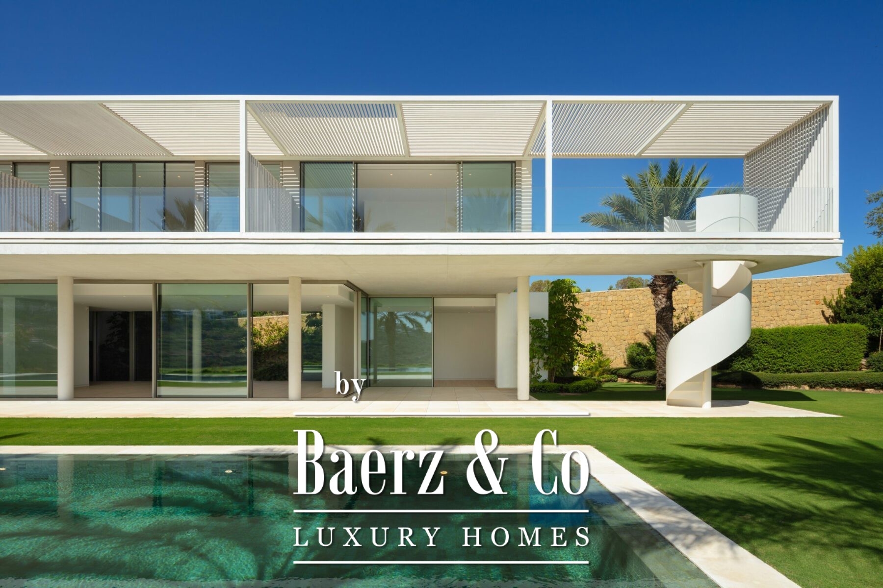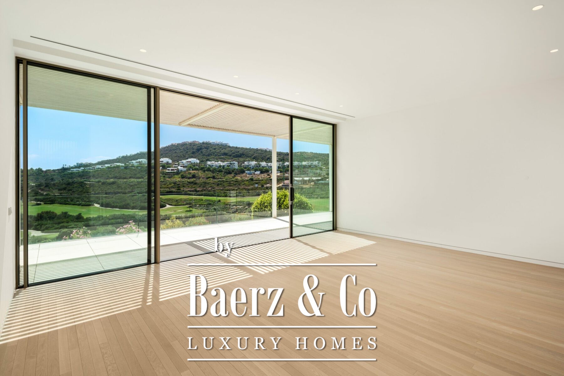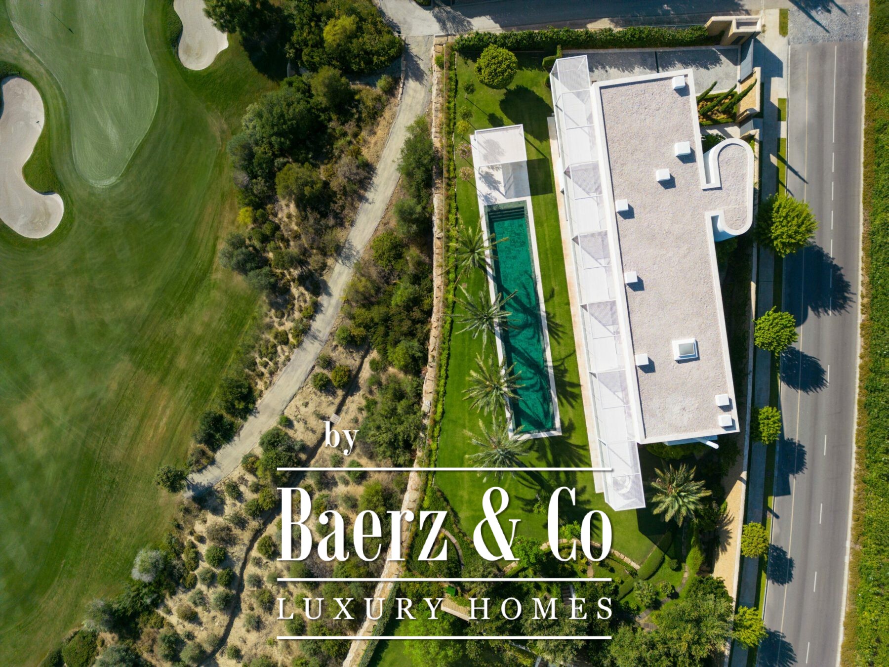 features neutral soft tones and unique materials that imbue the home with an unparalleled sense of individuality. The kitchen, equipped with top-of-the-line Gaggenau appliances, showcases bespoke cabinetry and a stylish kitchen island, while the light wooden flooring throughout the house evokes a serene and tranquil ambiance. The property’s manicured landscapes, carefully curated within its boundaries, create a captivating backdrop visible from the ground floor. The upper level is dedicated to the bedrooms, each with its own private terrace and separated by stunning white dividers. The architectural prowess is evident from every angle, with the property’s impressive entrance leaving a lasting impression on all who arrive. With its privileged frontline golf position, awe-inspiring views and an unwavering commitment to excellence, this masterpiece stands as a truly incomparable residence within the exclusive Golf Resort.