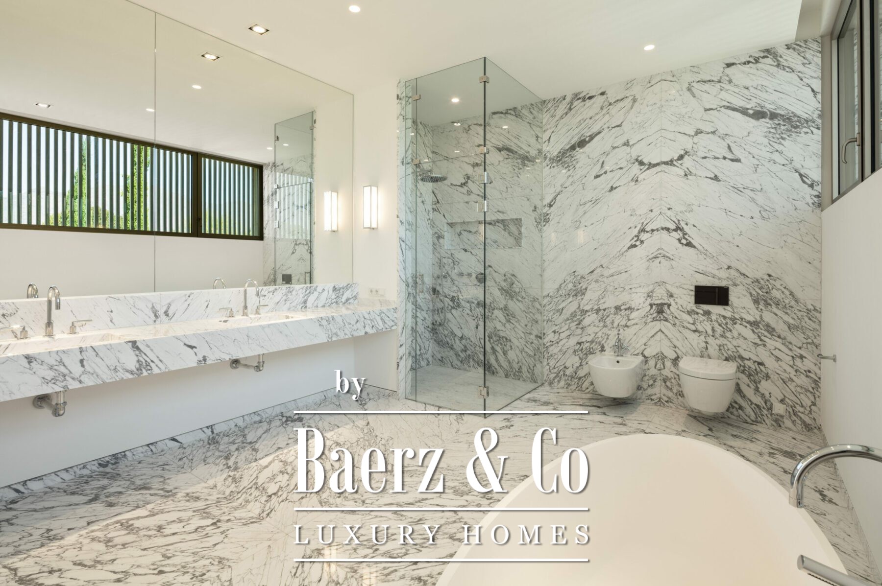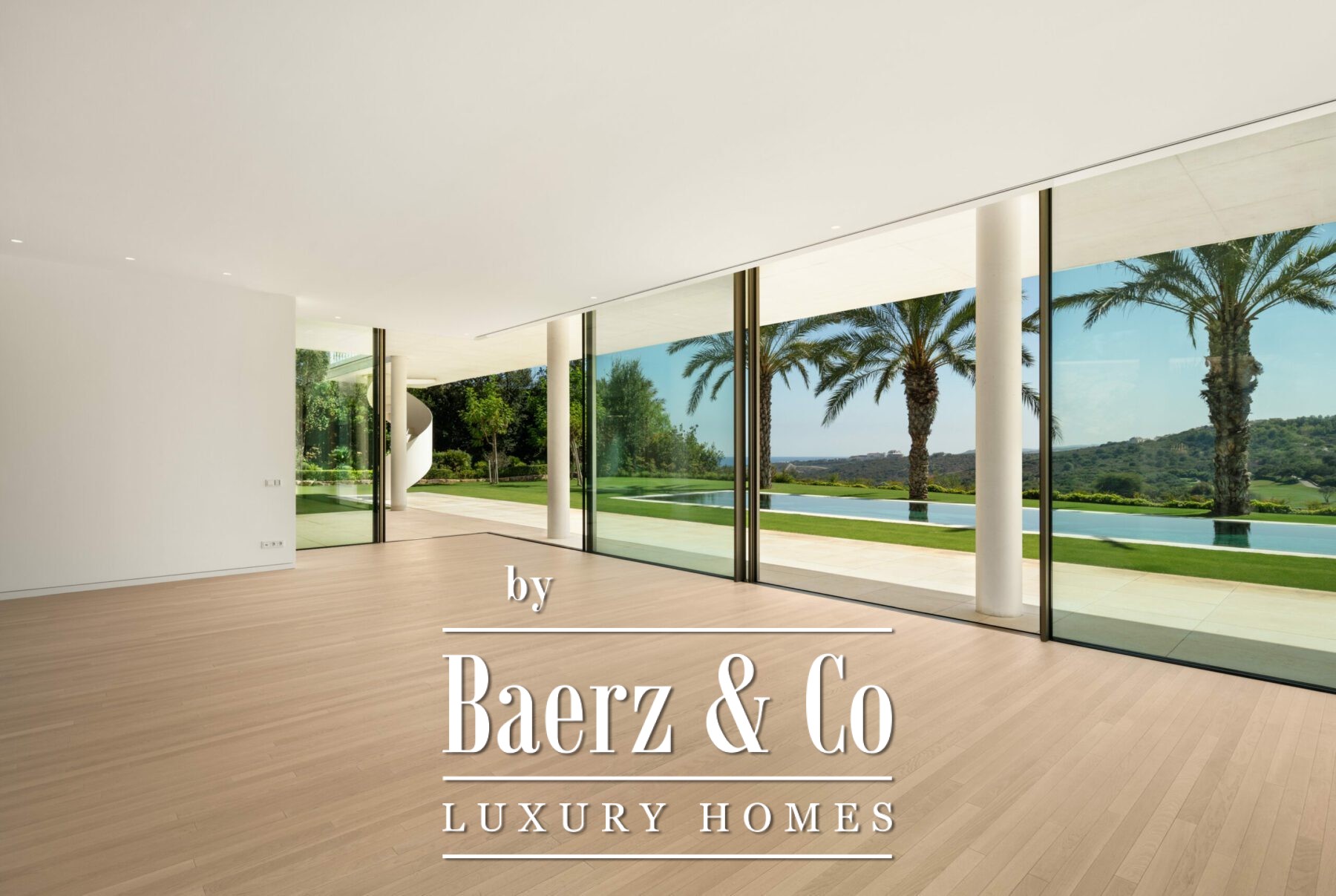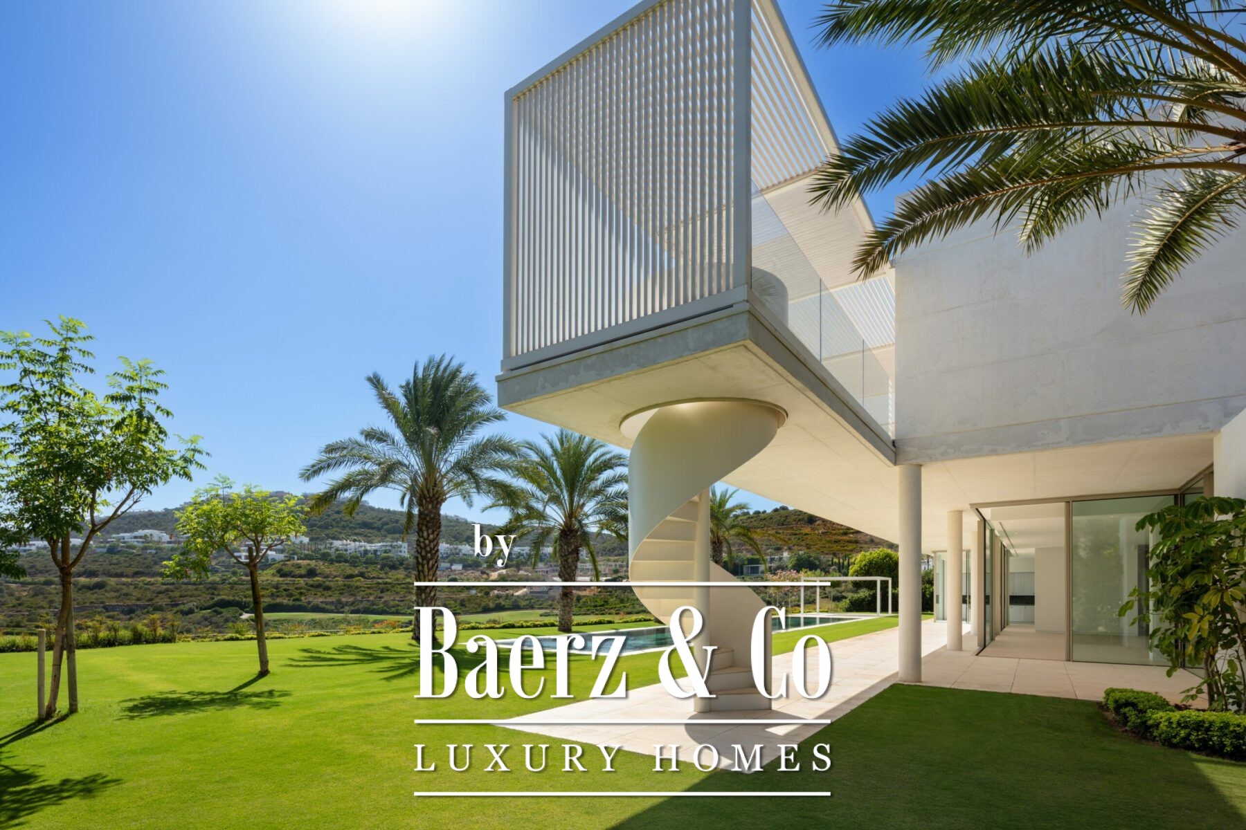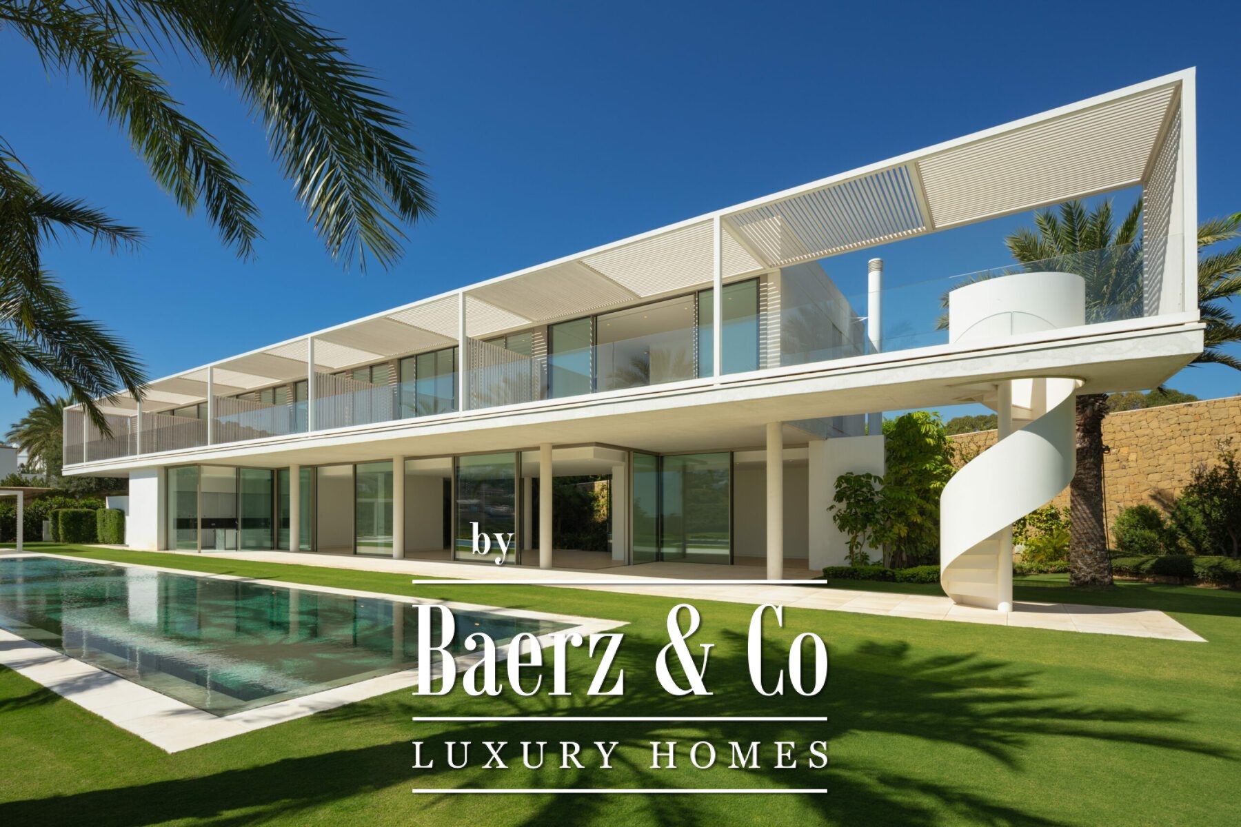 features neutral soft tones and unique materials that imbue the home with an unparalleled sense of individuality. The kitchen, equipped with top-of-the-line Gaggenau appliances, showcases bespoke cabinetry and a stylish kitchen island, while the light wooden flooring throughout the house evokes a serene and tranquil ambiance. The property’s manicured landscapes, carefully curated within its boundaries, create a captivating backdrop visible from the ground floor. The upper level is dedicated to the bedrooms, each with its own private terrace and separated by stunning white dividers. The architectural prowess is evident from every angle, with the property’s impressive entrance leaving a lasting impression on all who arrive. With its privileged frontline golf position, awe-inspiring views and an unwavering commitment to excellence, this masterpiece stands as a truly incomparable residence within the exclusive Golf Resort.