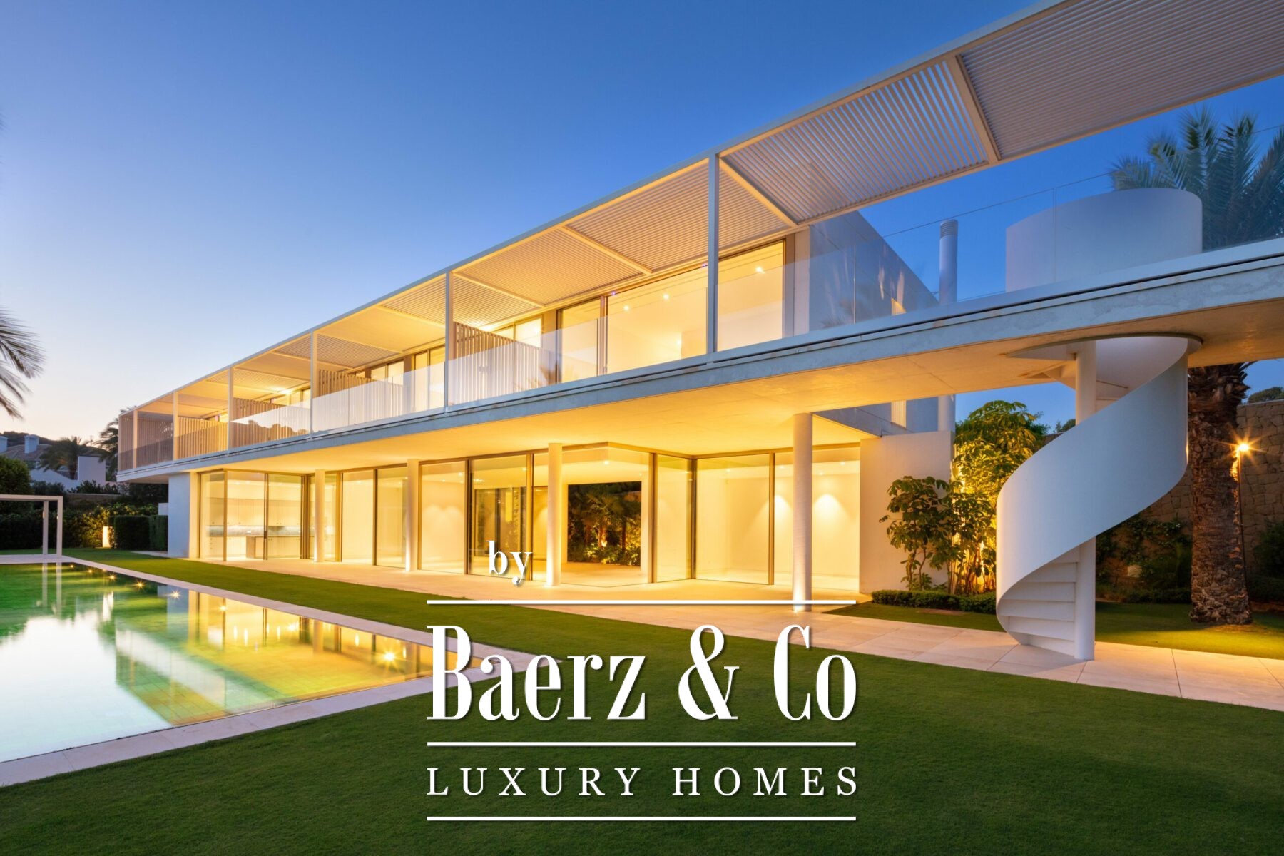 Exuding opulence and refinement, this exceptional villa redefines the very notion of luxury golf resort living. Positioned on an elevated plot, it offers breath taking panoramic views of the golf course and Mediterranean, while its expansive outdoor areas encompass meticulously manicured gardens and a magnificent swimming pool. Enveloped by lush palm trees and abundant flora, this residence provides an exquisite outdoor sanctuary for year-round enjoyment. Bathed in natural light, thanks to an abundance of floor-to-ceiling glass doors, the ground floor seamlessly connects to the garden, fostering a harmonious indoor-outdoor flow. The property is distributed over 3 floors, with a basement housing a laundry room, facility room and bespoke wine cellar. Access to the basement was cleverly integrated to the property through a hidden cylindrical door. The interior spaces are elegantly designed, located on the ground floor level –