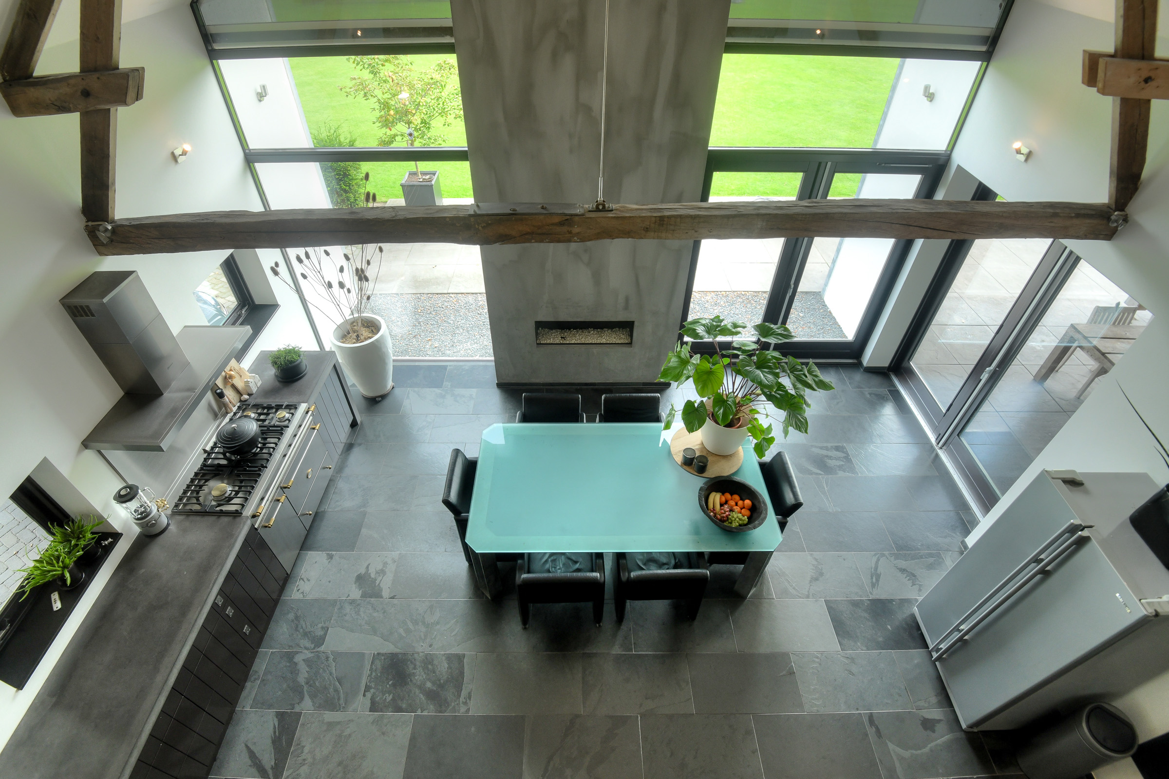 Een extra ruimtelijk effect wordt verkregen door de hoge kapconstructie die in het zicht gebleven is.