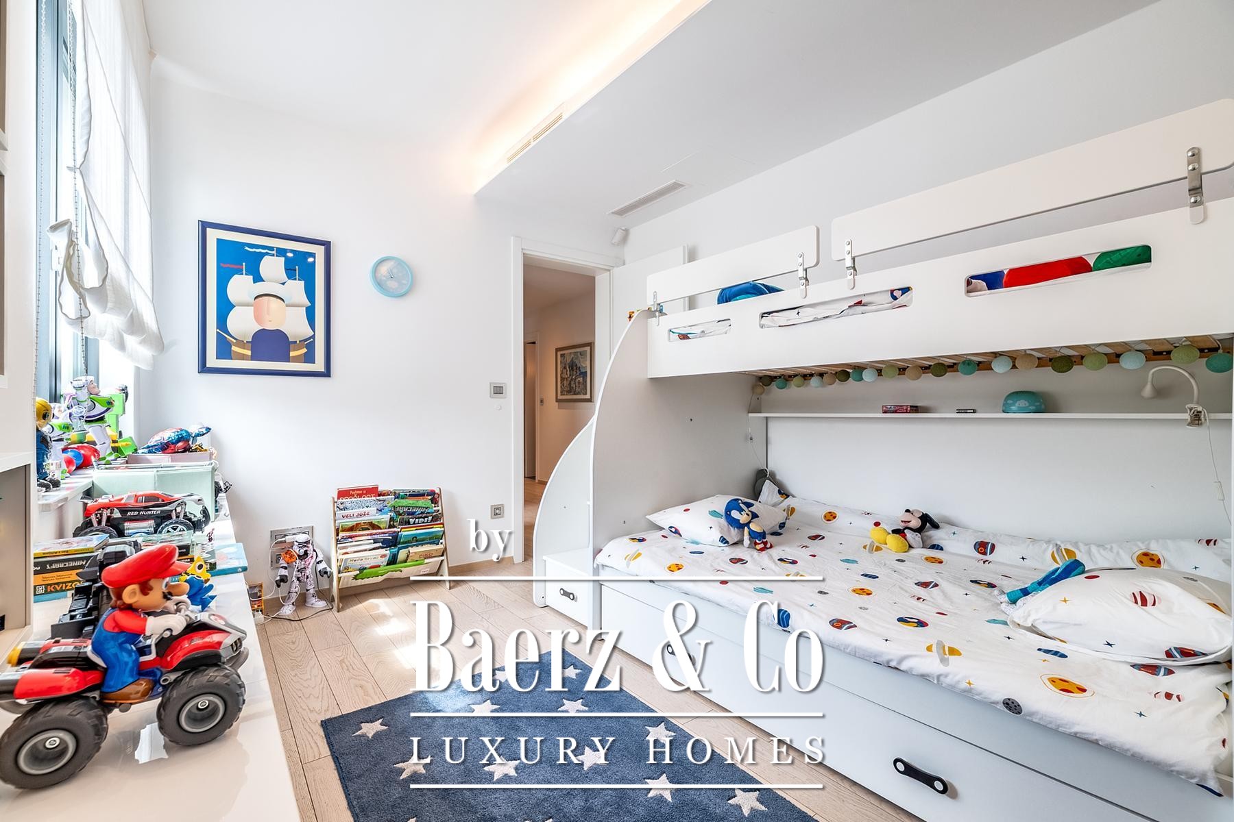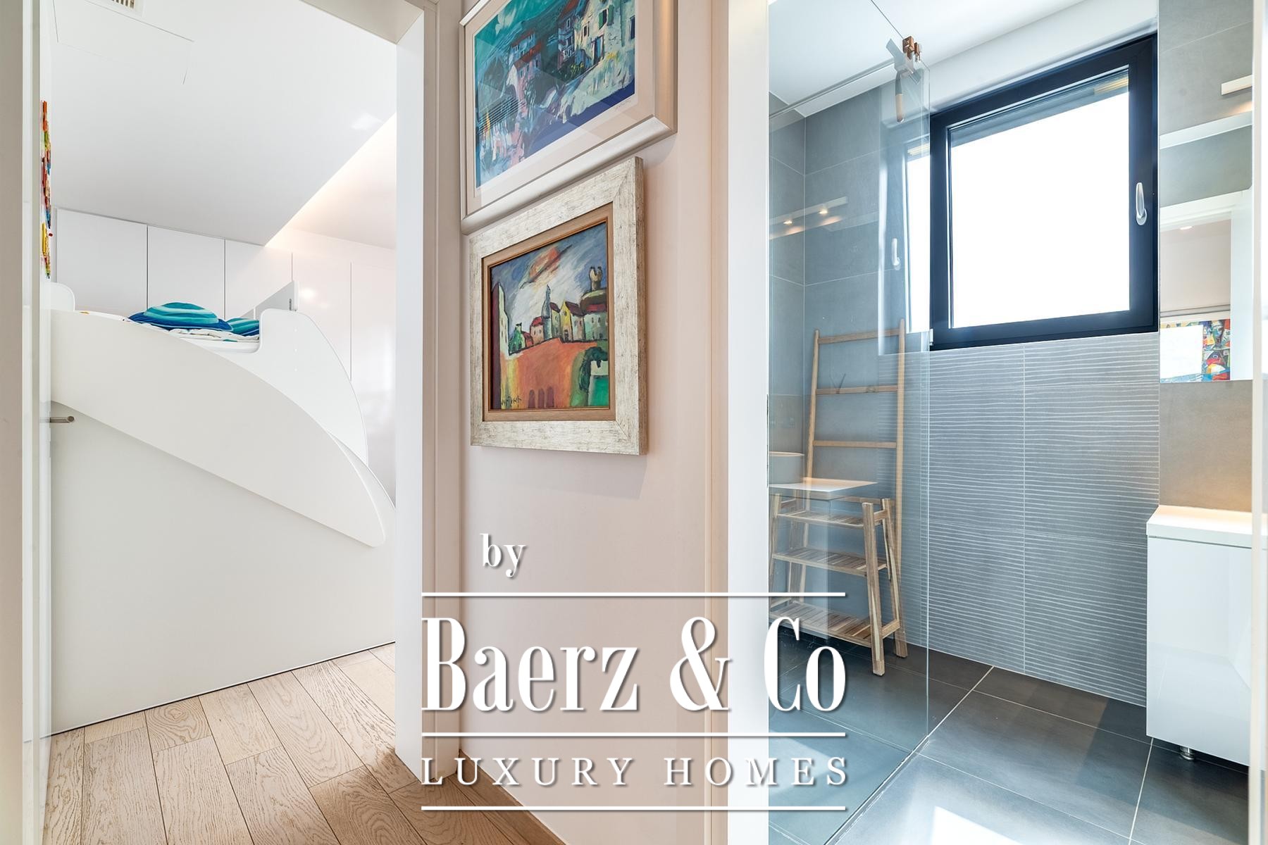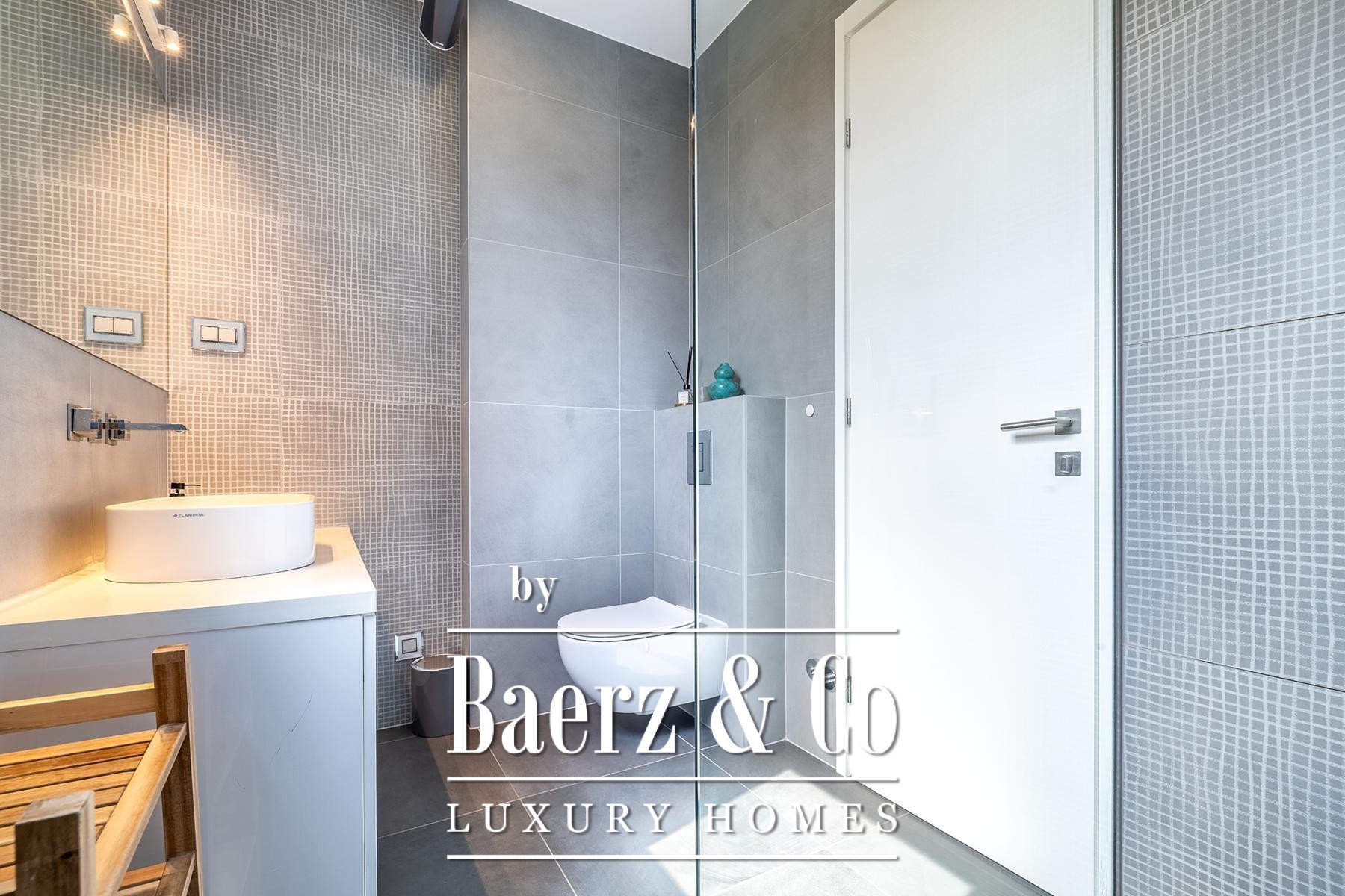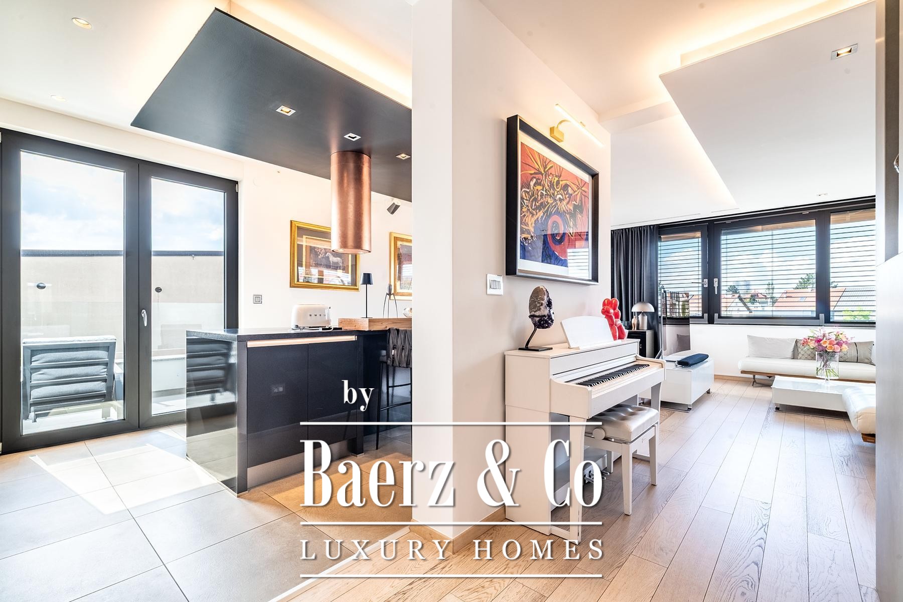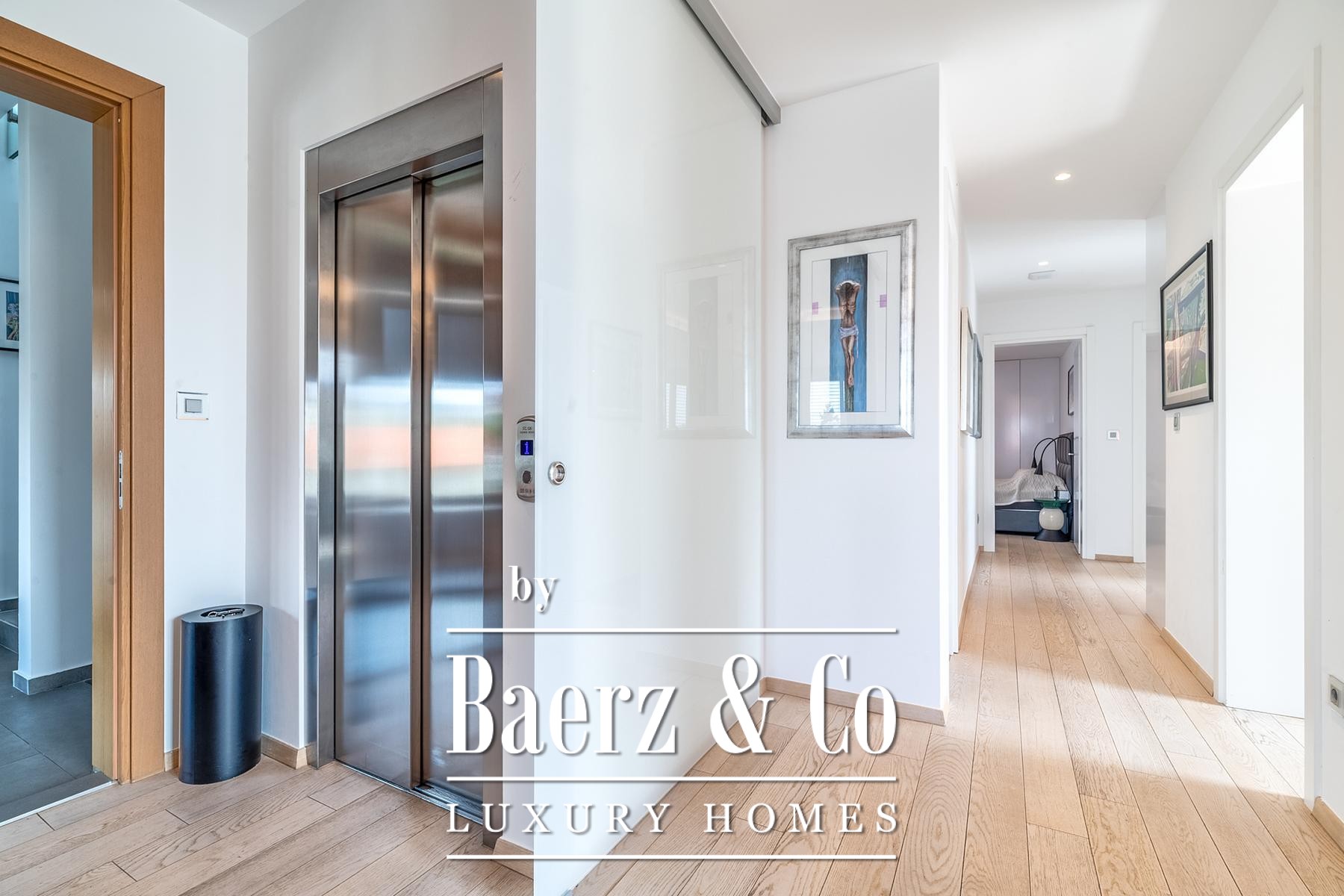 Een privélift brengt u rechtstreeks naar het appartement, wat volledige privacy vanaf het eerste moment garandeert. De hoofdverdieping beschikt over een ruime woonkamer, een moderne keuken en eetruimte met toegang tot het terras, een gang naar de master bedroom met en suite badkamer voorzien van zowel een douche als een bad, twee extra slaapkamers en een gastentoilet. De bovenverdieping opent naar een ingericht terras met jacuzzi, wintertuin, keuken en extra toilet: een zeldzaam stedelijk toevluchtsoord.