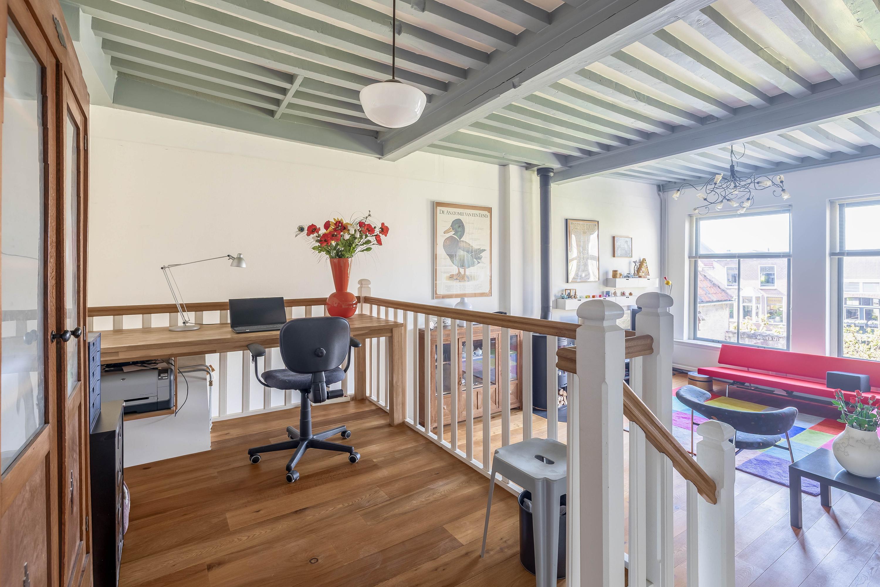 winkelruimte met prachtig houten lijstenplafond, trappartij (geheel vernieuwd), atelier met vlizotrap naar bergvliering, toiletruimte, 2e trappartij (geheel vernieuwd), grote woonkeuken met schitterend uitzicht op de tuin, keukenopstelling met inductiekookplaat, afzuigkap, combi-oven, heteluchtoven, vaatwasser, keukenboiler, marmoleum met vloerverwarming en deur naar het terras op het zuid-westen.