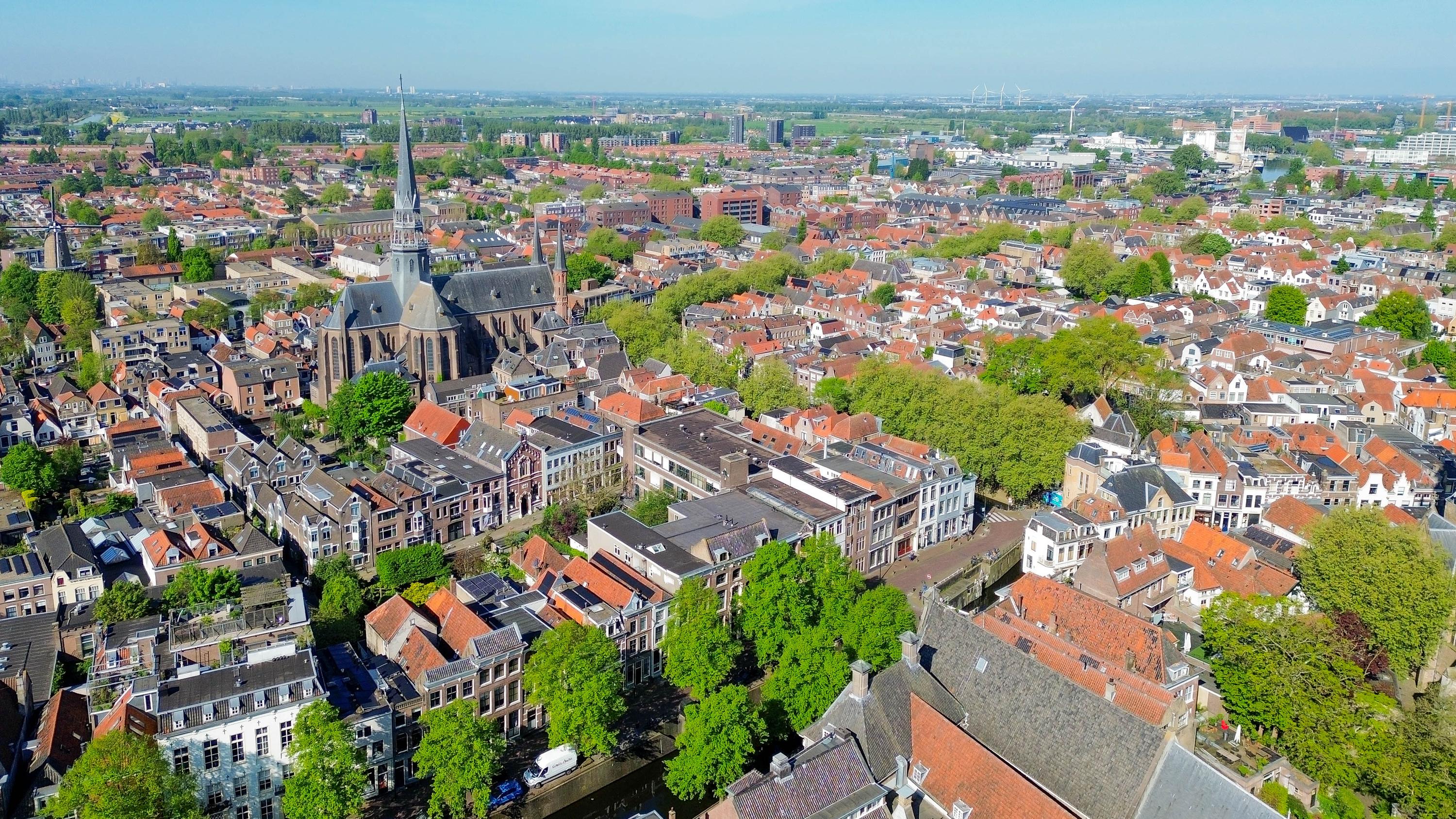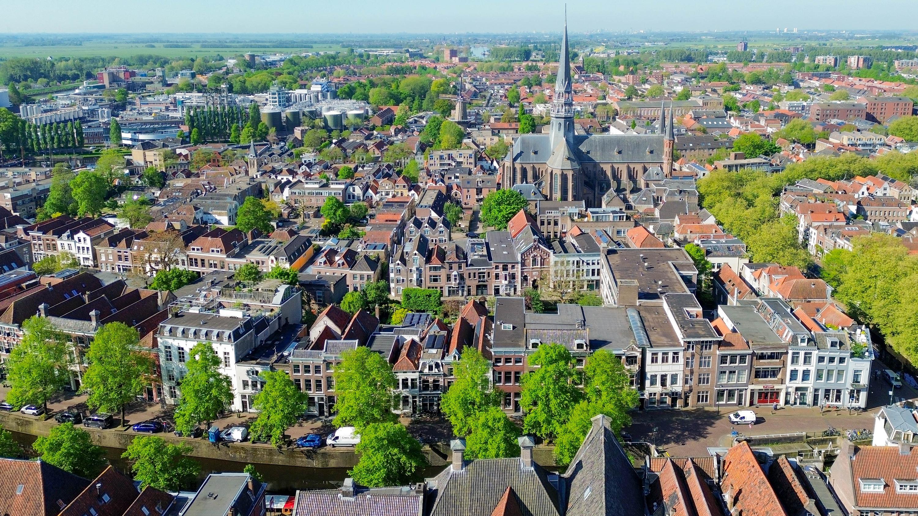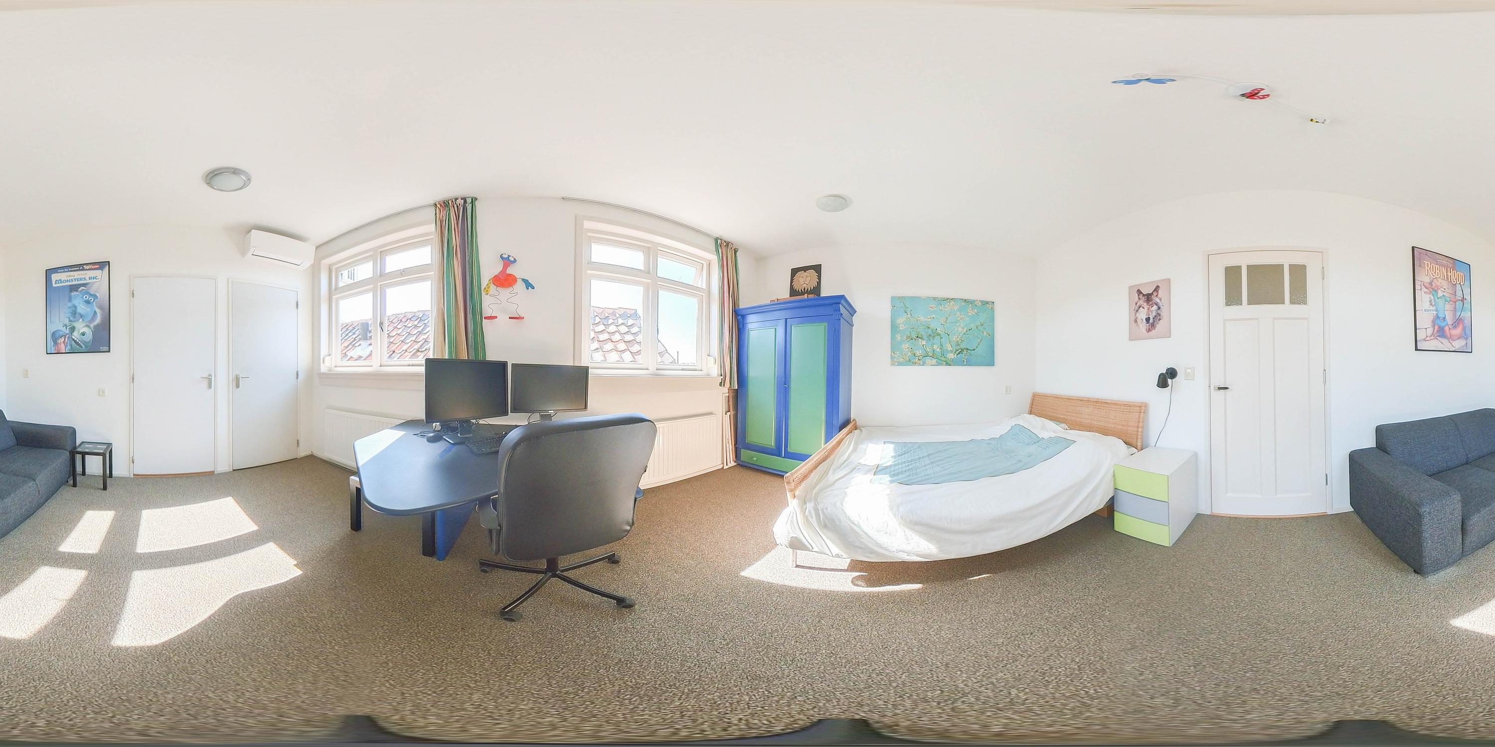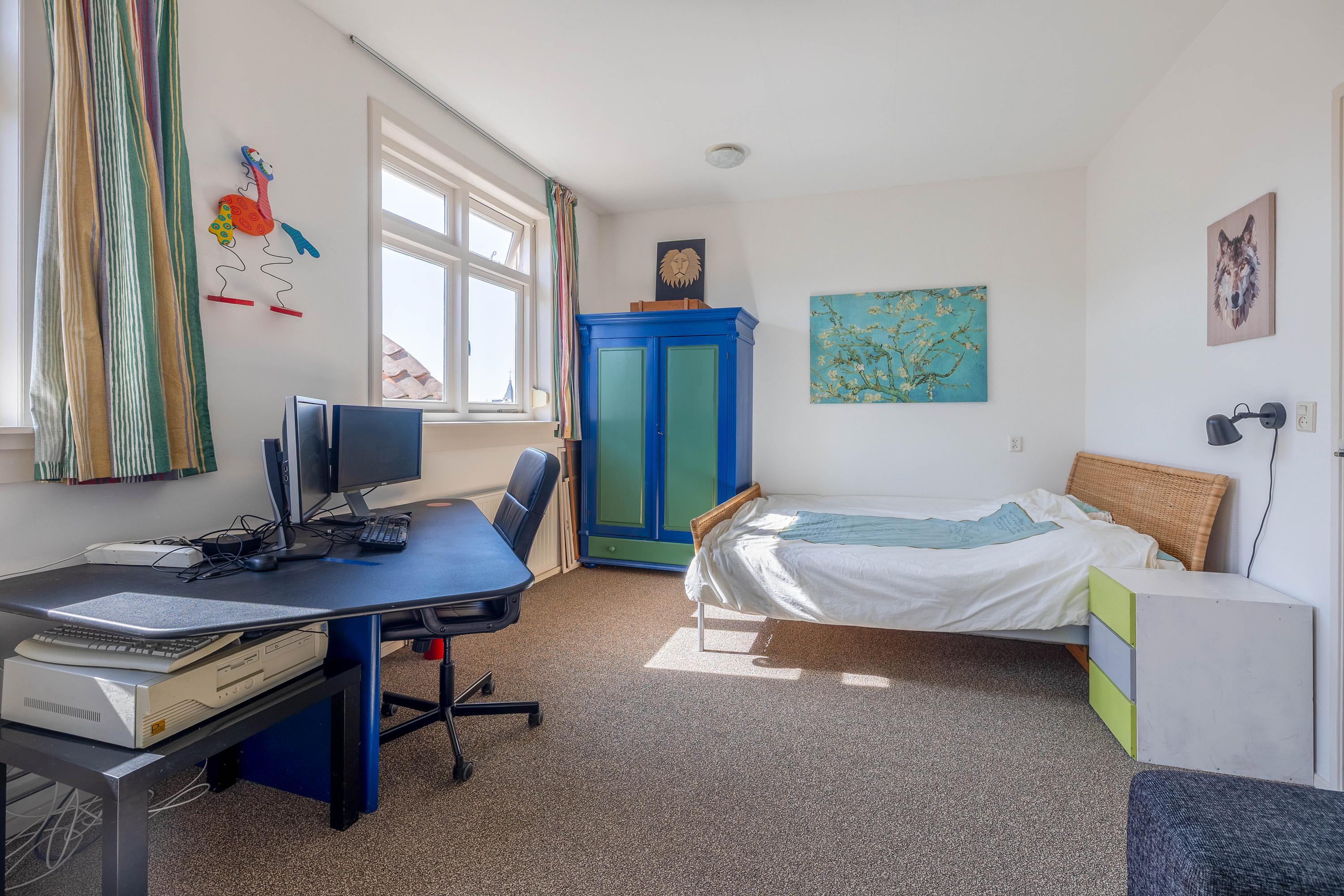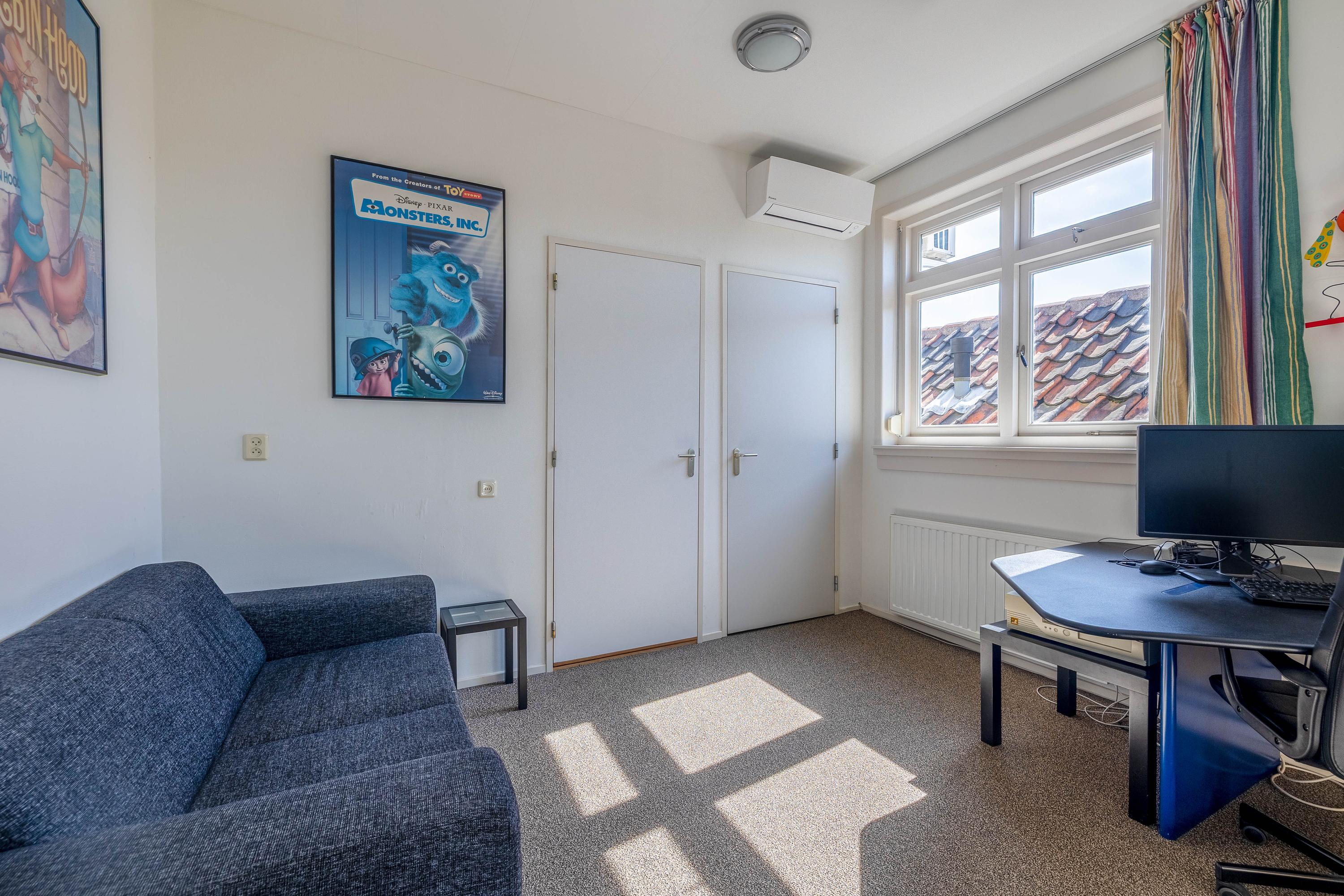 slaapkamer aan achterzijde met nieuwe achterpui met deur met terras en schitterend uitzicht over de historische panden van de Goudse binnenstad, slaapkamer met vaste kastenwand, airco, cv-ruimte en slaapkamer aan voorzijde met zicht op het museum en de St Janskerk