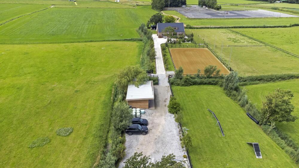 Halverweg de oprijlaan is het stallencomplex gelegen. Er zijn achtereenvolgens twee riante paardenboxen met inpandige poetsplaats voorzien van warm en koud stromend water in het midden, daarnaast een fourage-/zadelkamer met vervolgens nog een kleinere stal waar Jil de stokoude ezel huist. Vanuit de stal is de achtergelegen paardenwei (ruim 1.7ha) bereikbaar en tevens de tegenover gelegen paardenbak (20x40m) met soepele bodem en buitenverlichting. Mocht er geen interesse zijn in het houden van paarden dan is dit complex bijvoorbeeld ook te verbouwen tot gastenverblijf.
