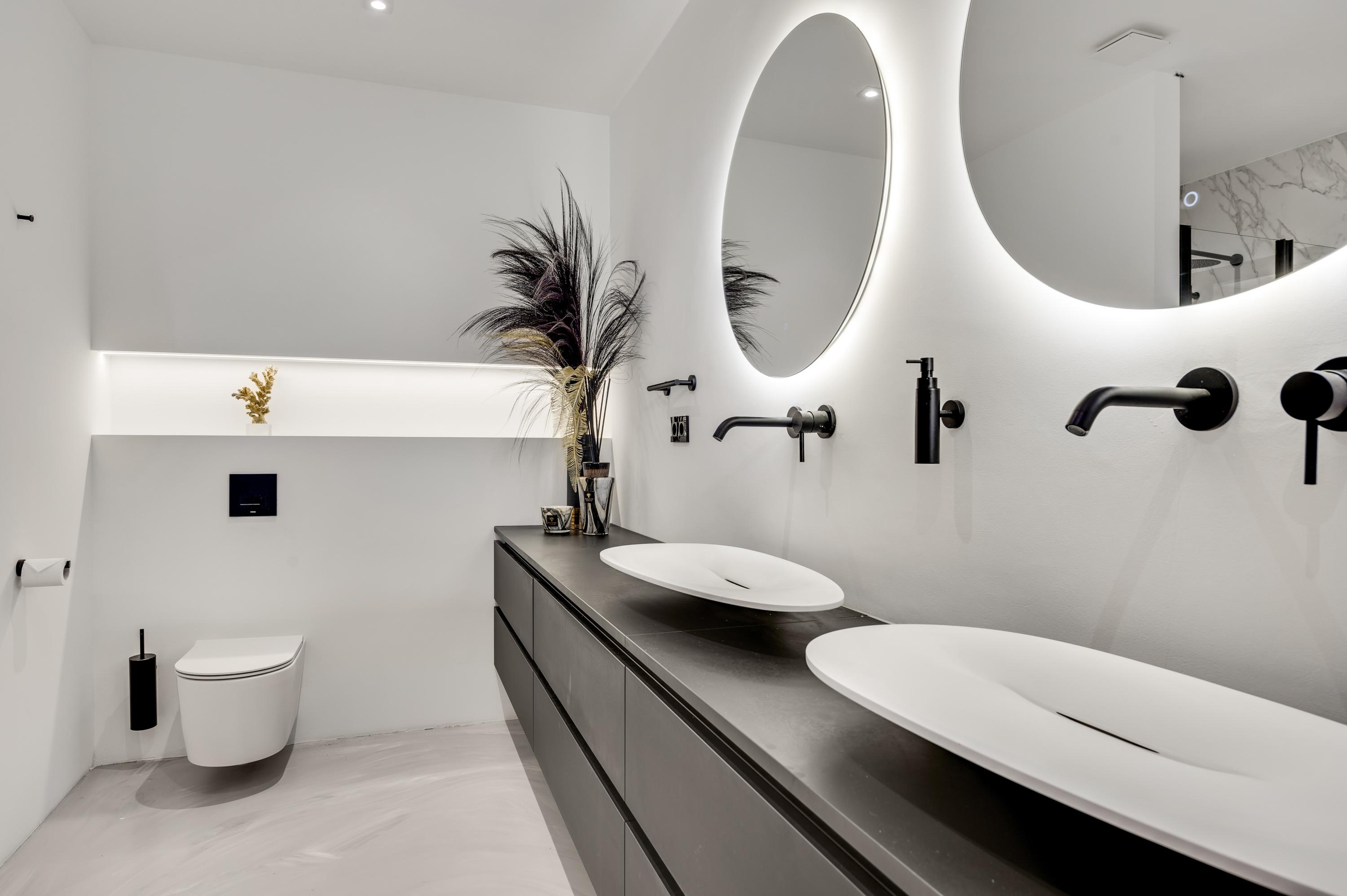 De oostvleugel is volledig ingericht als slaapverblijf. Hier bevinden zich vijf slaapkamers, waaronder een riante master bedroom met eigen kleedkamer, luxe badkamer en directe toegang tot een overdekt terras met zicht op de tuin. De overige vier slaapkamers delen twee stijlvolle badkamers, elk voorzien van een ligbad, inloopdouche, dubbele wastafel en wandcloset.