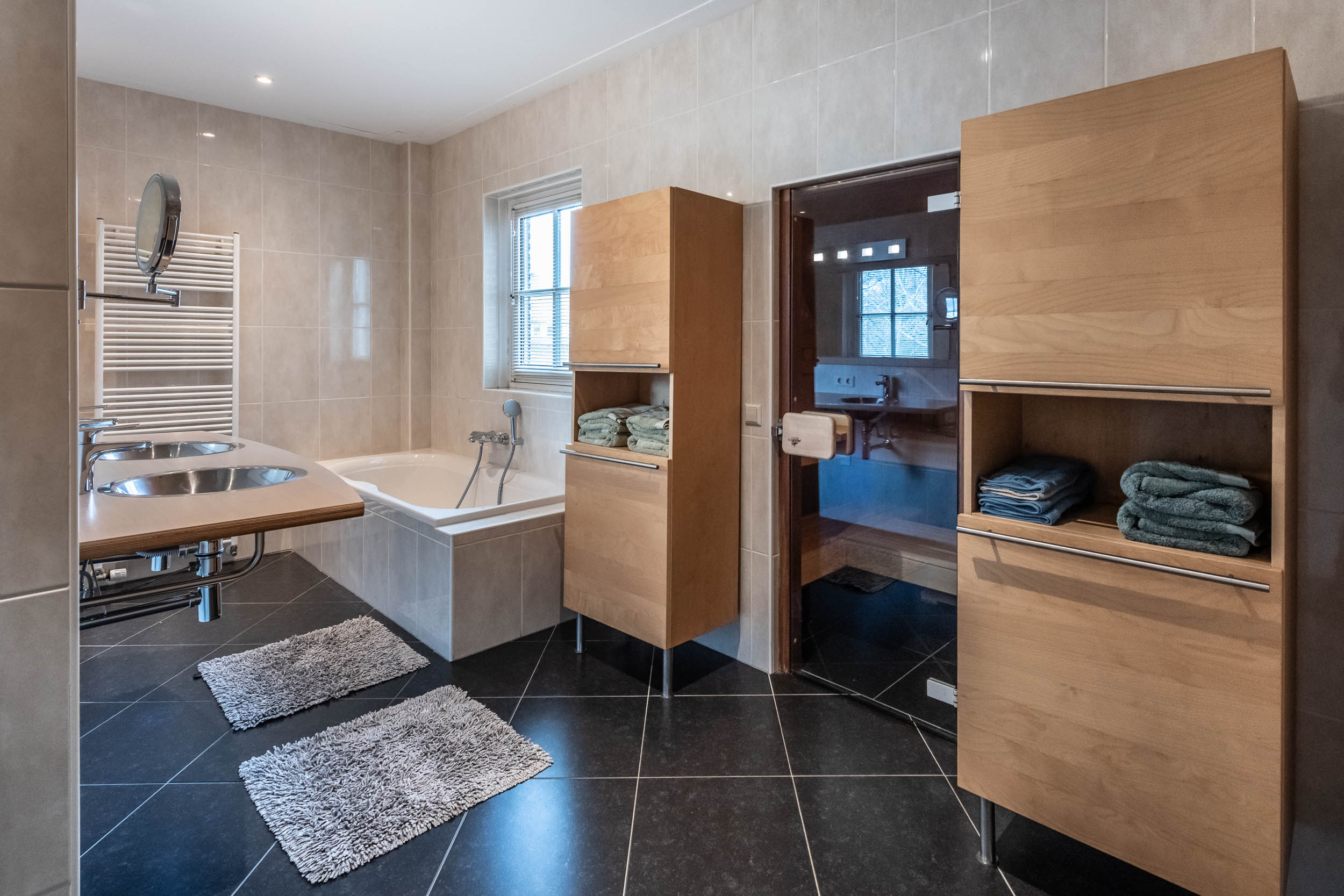 1e Verdieping: Overloop met toegang tot 4 ruime en lichte slaapkamers en twee moderne badkamers. De royale ouderslaapkamer ligt aan de achterzijde en geeft toegang tot de inloopkast en de badkamer met bad, inloopdouche, 2e wc, dubbele wasbak en een sauna. De 2e badkamer is voorzien van een douche, 3e wc en een wastafel. De 2e slaapkamer aan de achterzijde van de woning geeft via openslaande deuren toegang tot het dakterras.