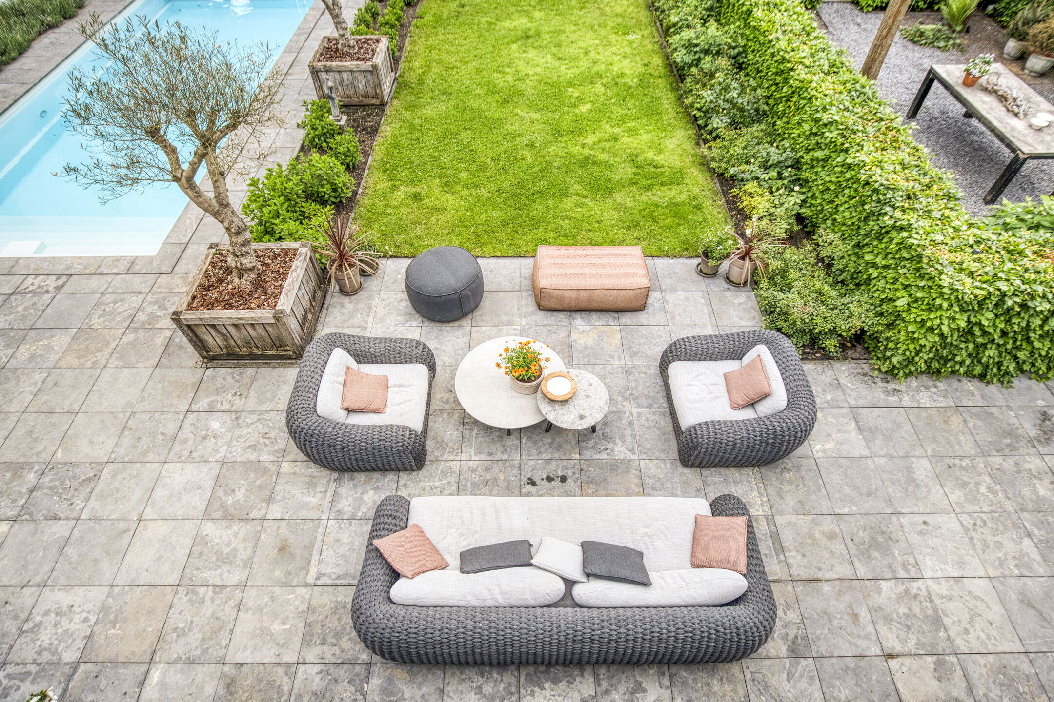 Aangelegde tuin rondom, zonnige gesitueerd op het zuiden, terras bestraat met natuurstenen sierbestrating en voorzien van borders, gazon, grindterras, elektra, tuinverlichting, buitenkraan, zwembad met elektrisch dek, buitendouche, een zonnescherm t.p.v. woonkamer en een poolhouse (vv. vloerverwarming) met aansluitend een veranda vv. buitenkeuken, lichtspots en zonne-screens;