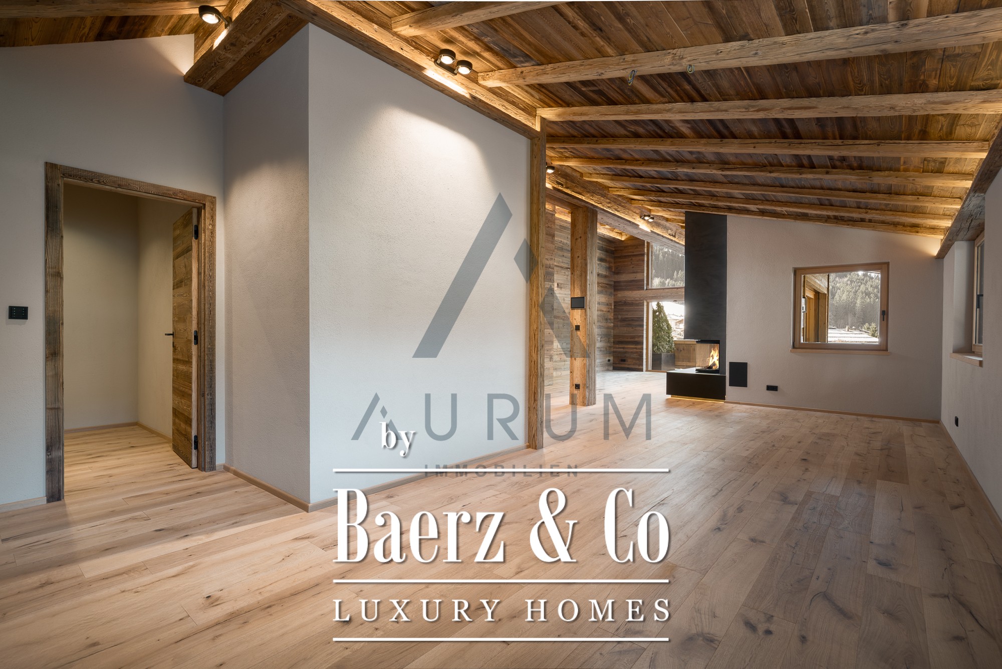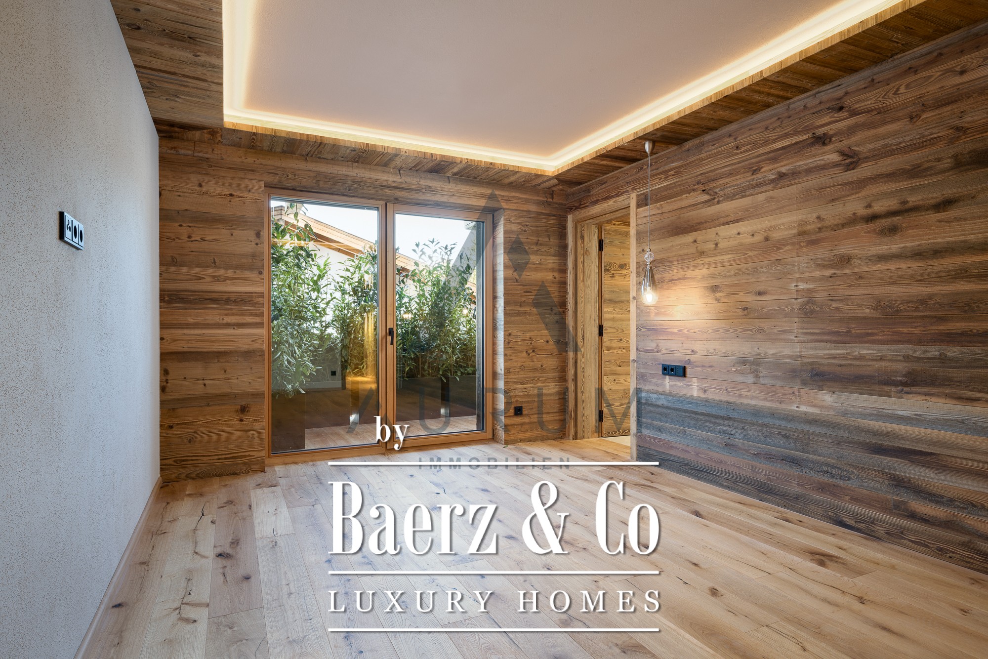Op de bovenste etage vloeien de woon- en eetkamer samen onder een open zichtbare houten kap, waar berglicht door de vloerhoge ramen naar binnen stroomt. De geïntegreerde keuken is uitgerust met Gaggenau en Bora Professional apparatuur en ontworpen voor culinaire inspiratie en stijlvolle ontmoetingen. Een open haard vormt het warme hart van het interieur, terwijl het aangrenzende terras uitnodigt tot ontspannen buitenleven.