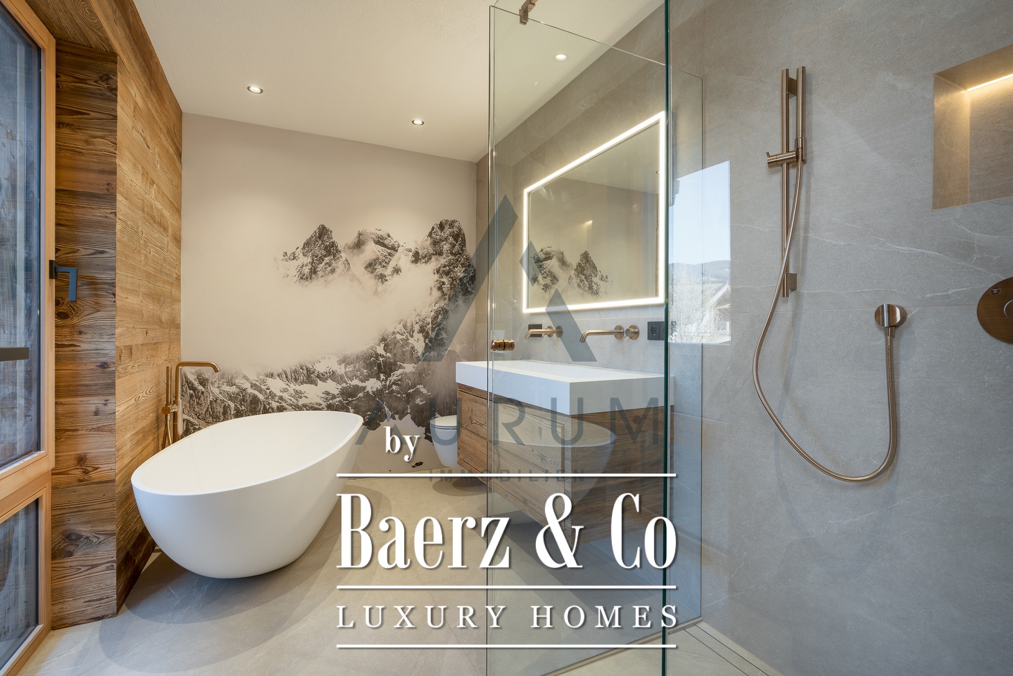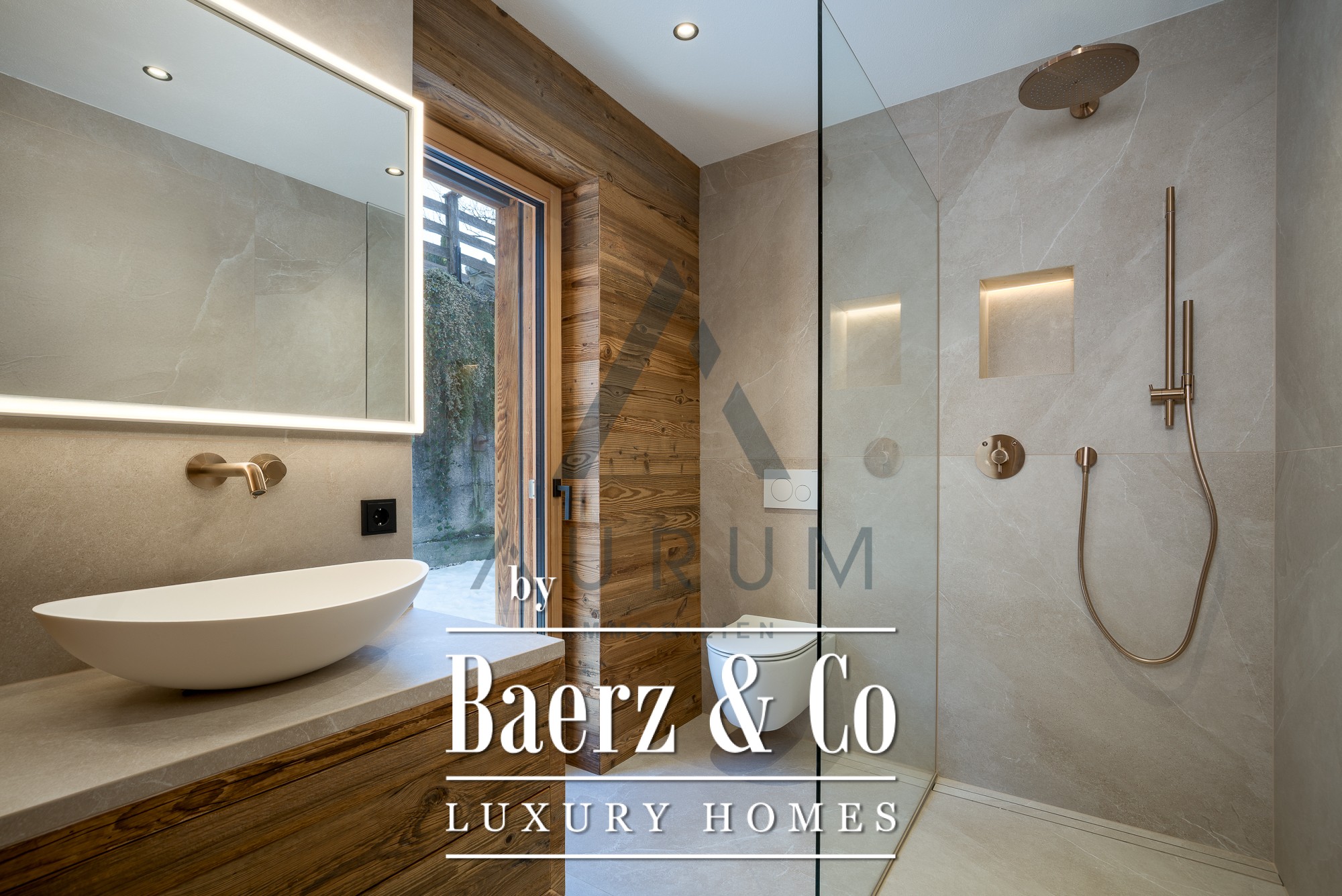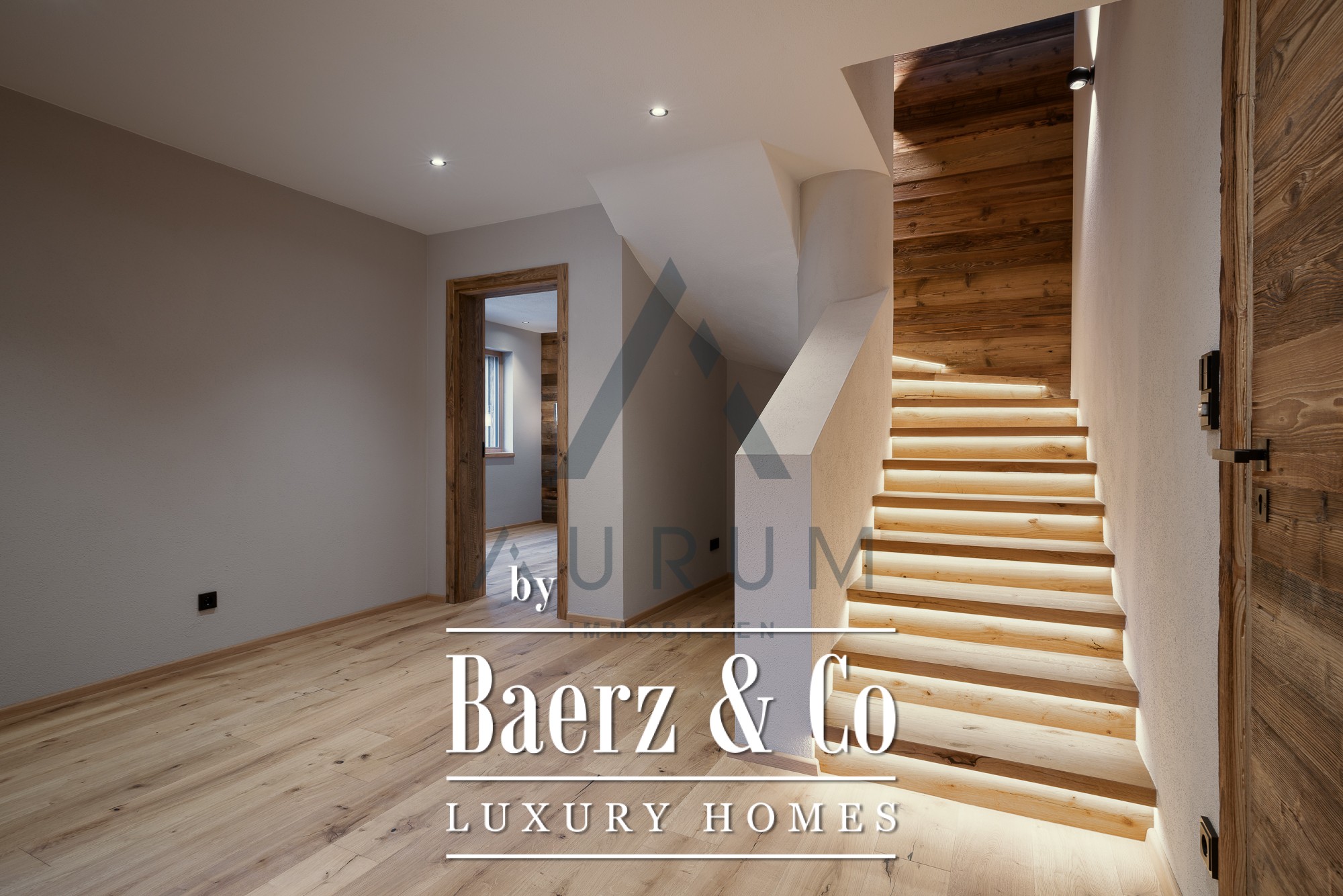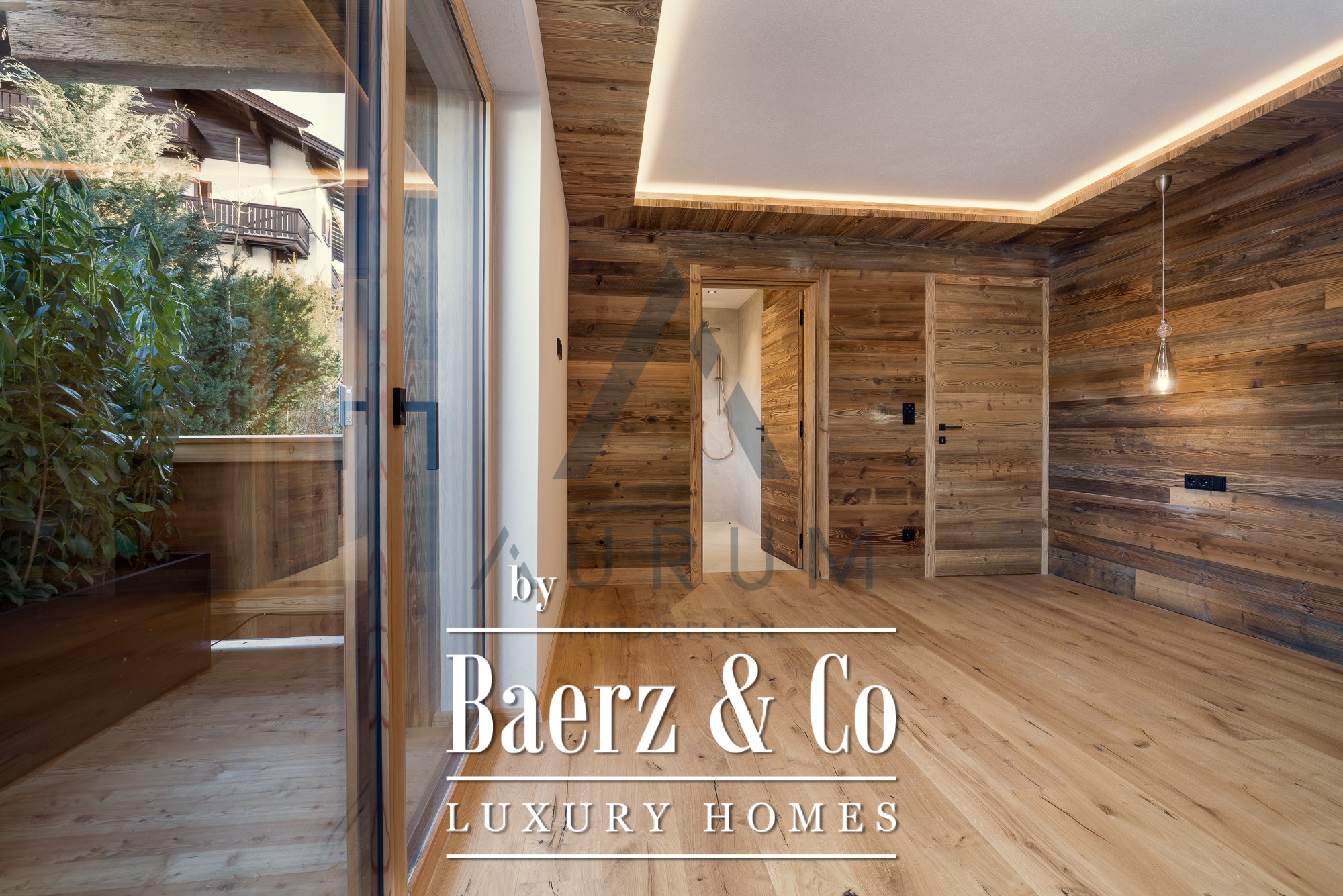 Via een imposante trap of privé-lift betreedt u 200 m² aan leefruimte, waar hergebruikt hout, natuursteen en glas een gevel vormen die aansluit bij de eigentijdse architectuur van Kitzbühel. Op de eerste verdieping bevinden zich drie volledig ingerichte slaapkamers, elk voorzien van maatwerk timmerwerk, inbouwkasten en en-suite badkamers, verbonden door een ruim en doordacht vormgegeven gang. De master bedroom opent direct naar een zonovergoten balkon, waardoor een exclusief gevoel van privacy ontstaat.