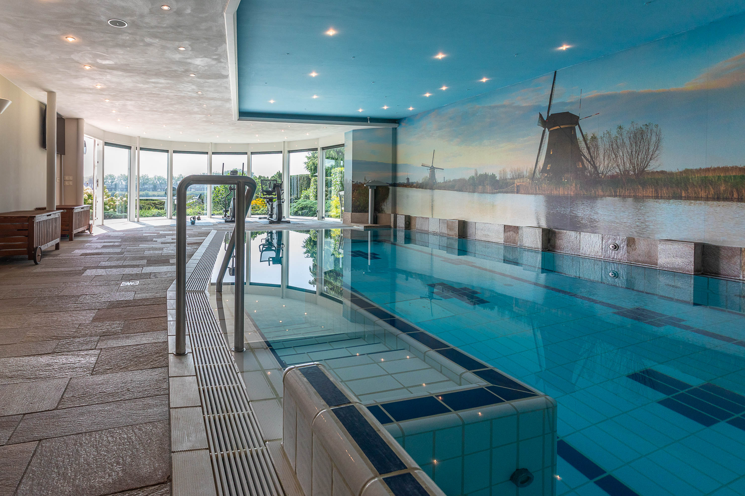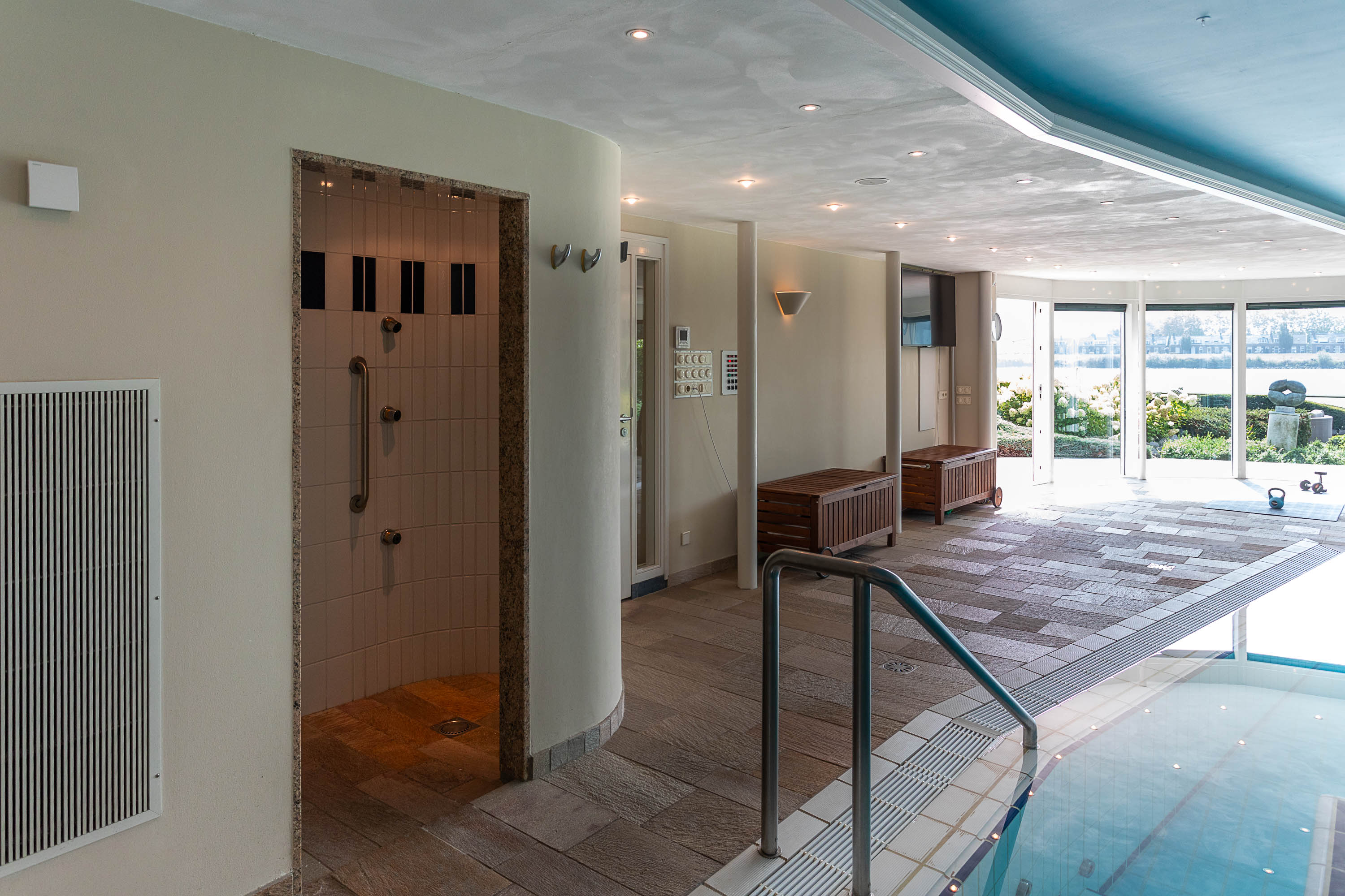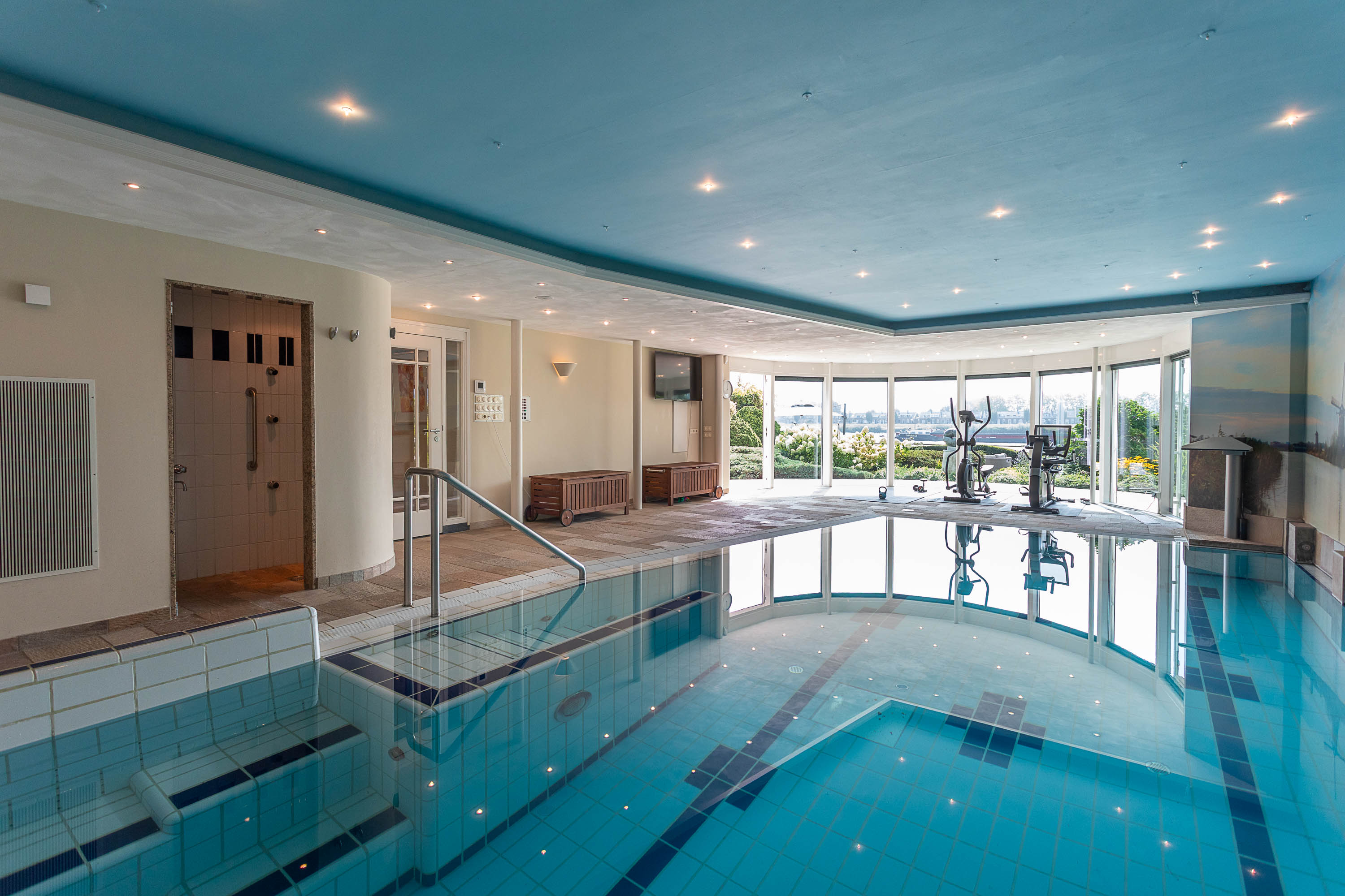 Het souterrain herbergt een complete wellness afdeling die van deze villa een privéresort maakt. Ontspan in het zwembad met jet stream, laat u meevoeren door de waterval, geniet van de bruisplaat, de wandbruiser of kom tot rust op de whirlpoolbank. Een oase van ontspanning, gewoon in uw eigen huis.