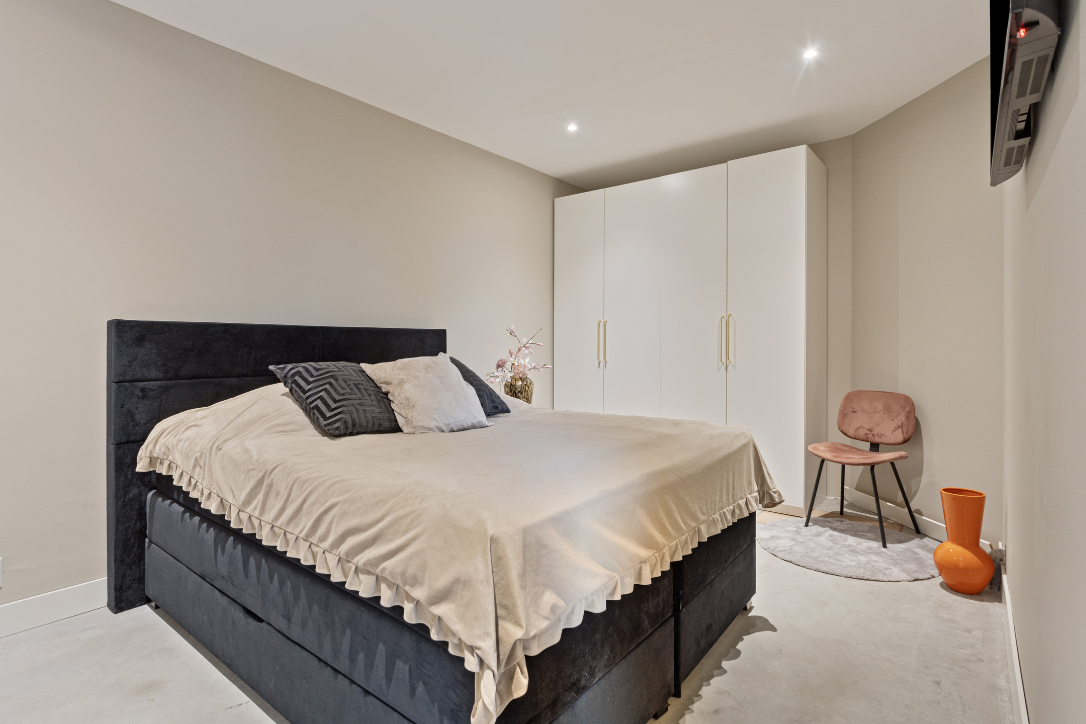 Here you’ll find two spacious bedrooms and a modern bathroom. The master bedroom, located at the rear, comes with air conditioning, double doors, and a magnificent panoramic view. The luxurious bathroom includes a freestanding bathtub, a large walk-in shower, double sinks, and Hotbath Cobber faucets.