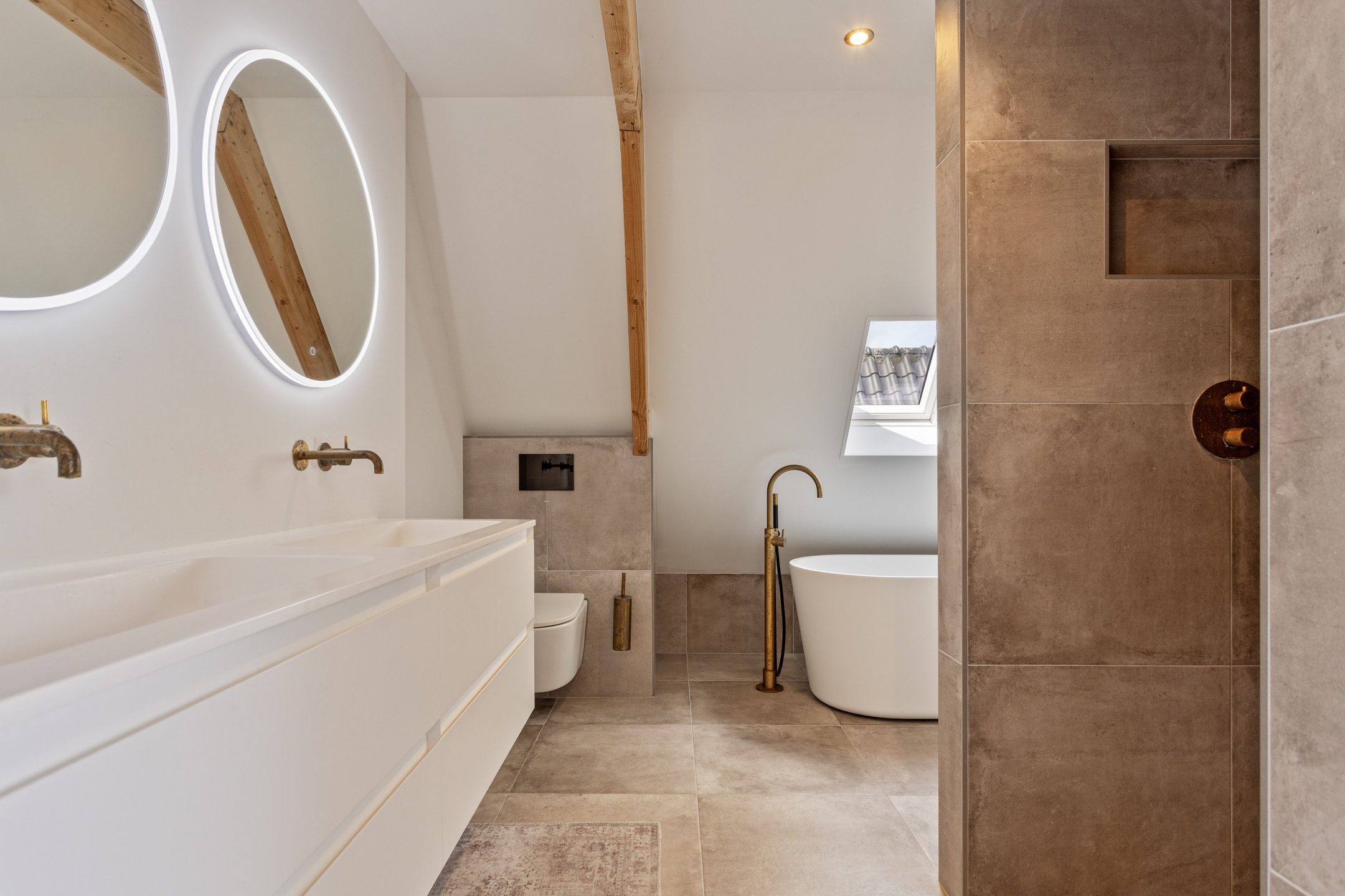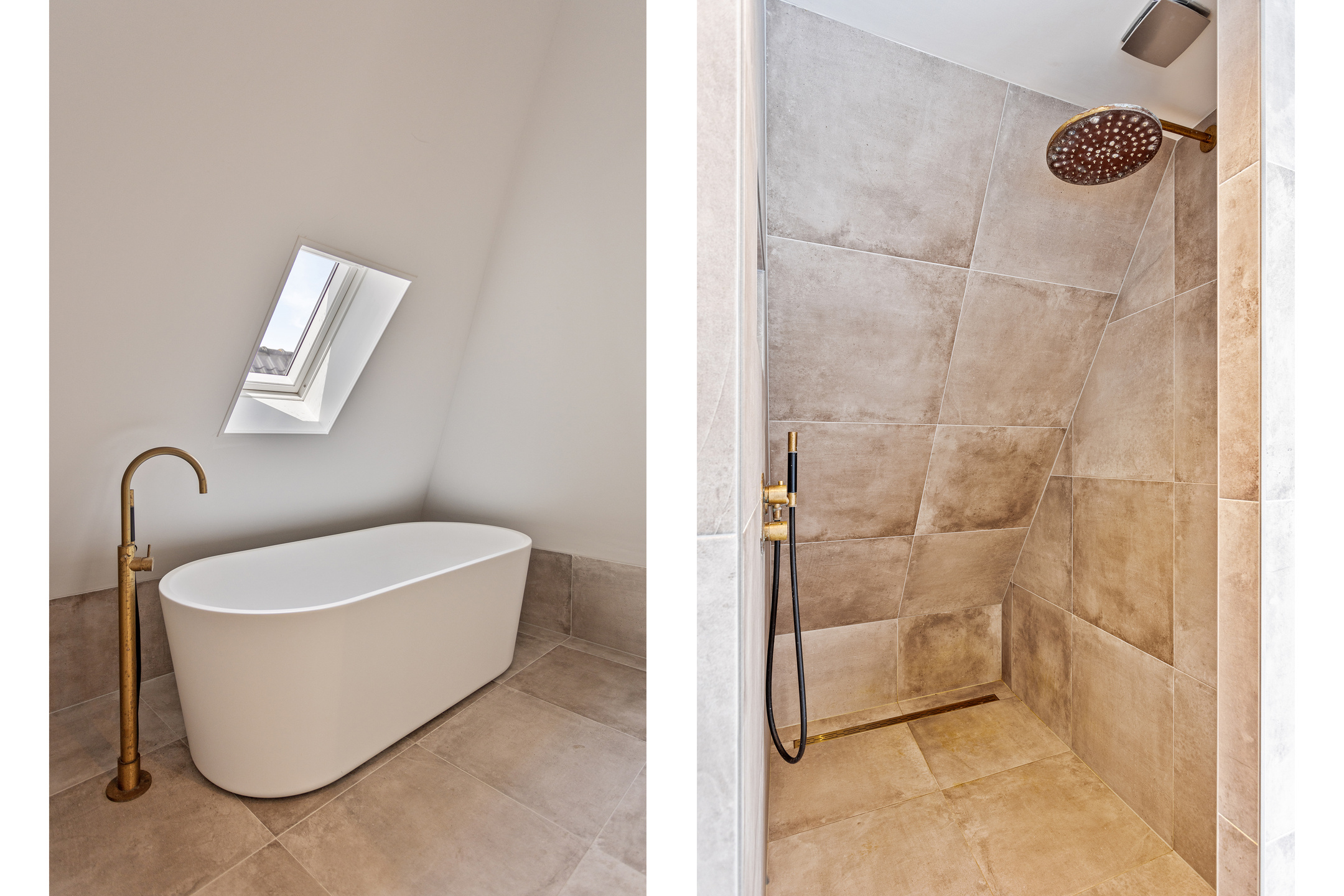 De luxe badkamer heeft een vrijstaand bad, een grote inloopdouche, een dubbele wastafel en Hotbath Cobber kranen.