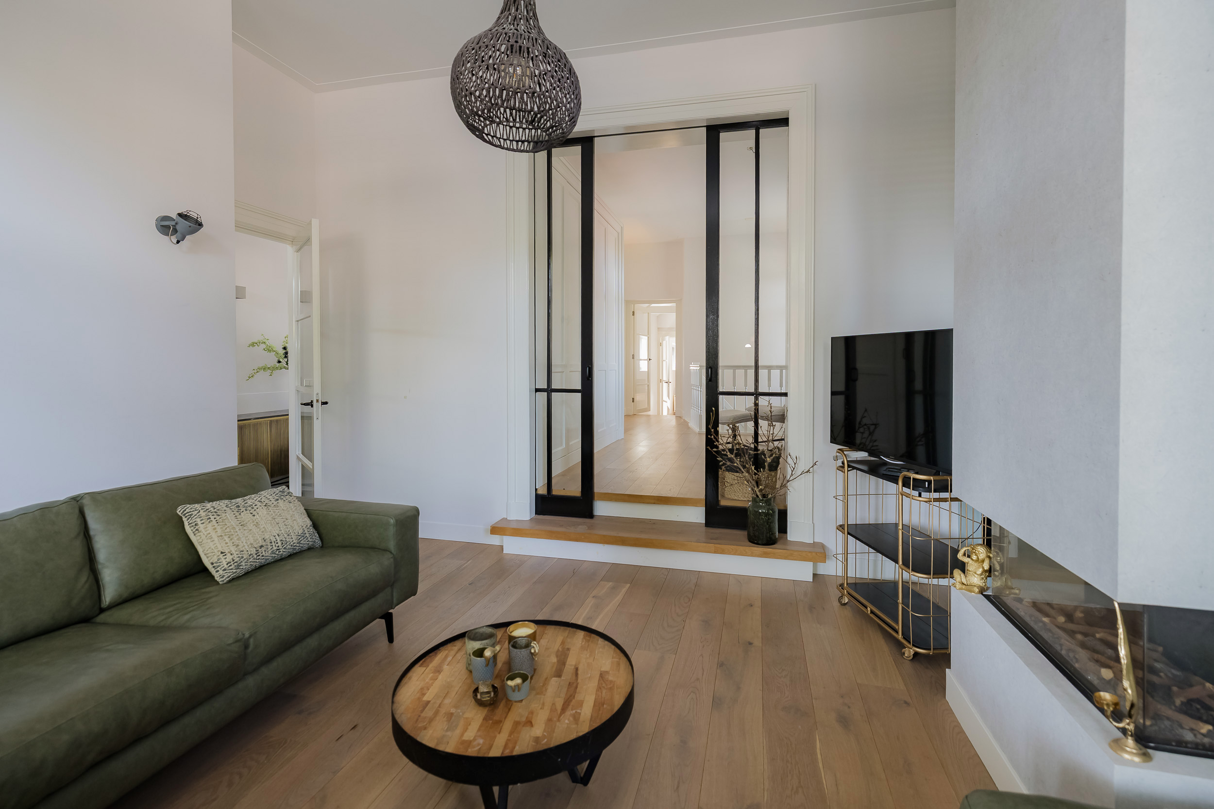Fraai portaal waarin de markant hoge voordeur, imposant lange hal met de gerestaureerde authentieke granitovloer, garderobe en toiletruimte en een deur naar de tuin. Links van de hal een zeer royale woon-/leefkeuken met luxe keukeninrichting in mat wit uitgevoerd, prachtig kook-/ en spoeleiland met houten eetbar en alle inbouwapparatuur o.a. een fraaie wijnkoeling. Ook een gezellige gashaard en de grote achterpui met veel glas en openslaande deuren naar de tuin ontbreken niet. Rechts van de hal is er een tv-/zitkamer met een gashaard en dubbele deuren die toegang geven tot de opkamer. Deze opkamer met een grote op maat gemaakte kastenwand is zeer geschikt als speel-/of werkkamer en heeft een trap naar de grote droge kelder met stahoogte. In het voormalige cellencomplex is een prachtige werkkamer gecreëerd, een bergkamer, een technische ruimte en is er één cel in originele staat behouden gebleven. De inpandig bereikbare garage is groot en o.a. voorzien van een elektrische segment deur met loopdeur en een vaste trap naar ruime bergzolder.