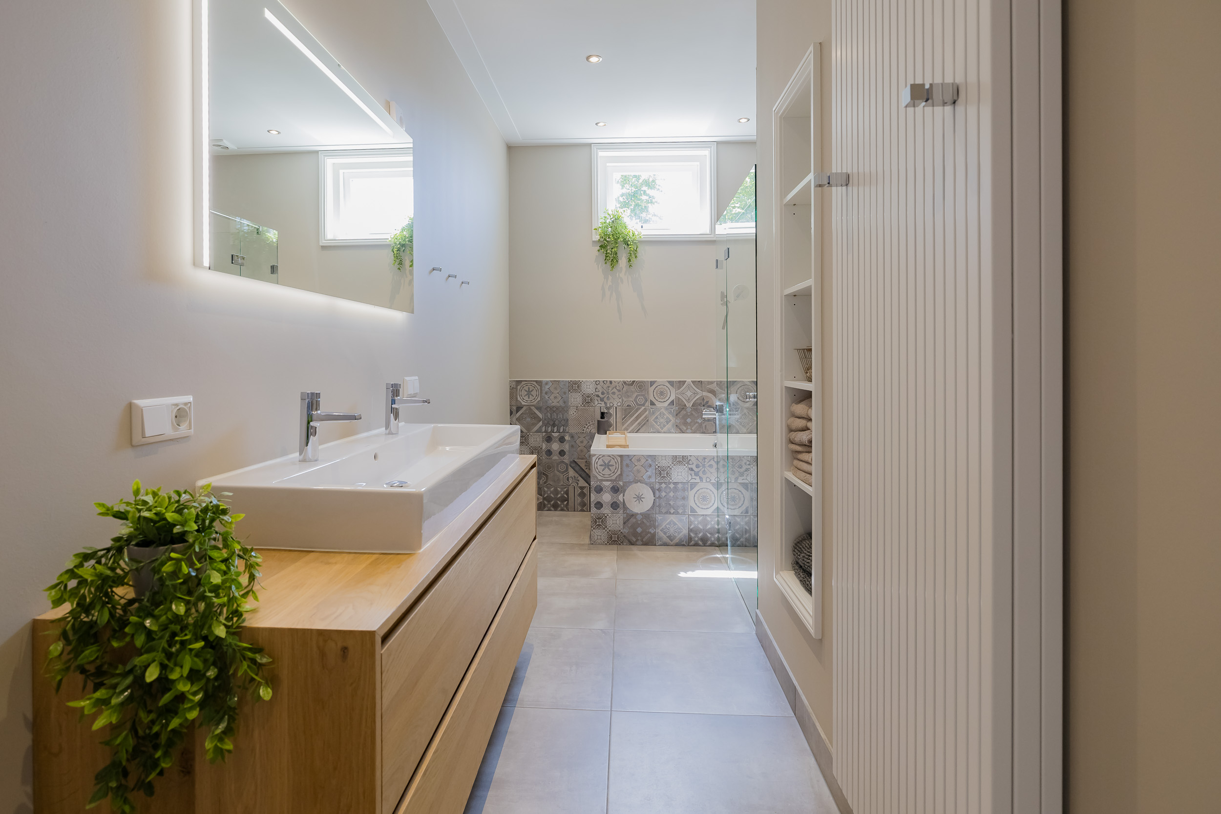 Ook hier een imposant lange hal met deur naar balkon, 3 fantastisch grote slaapkamers met mooie raampartijen, luxe badkamer met inloopdouche, ligbad en brede wastafel met 2 kranen op houten meubel, apart 2e luxe toiletruimte en 4e zeer royale was-/werkkamer.
