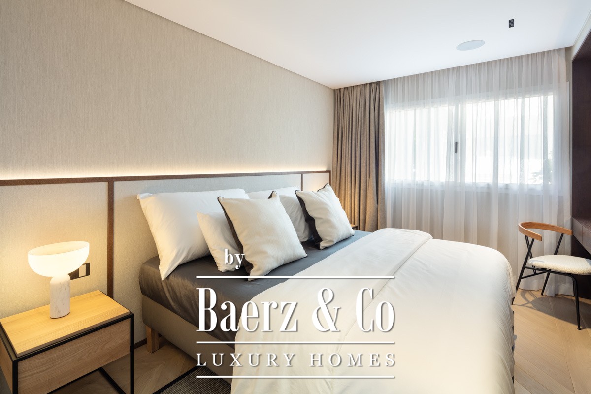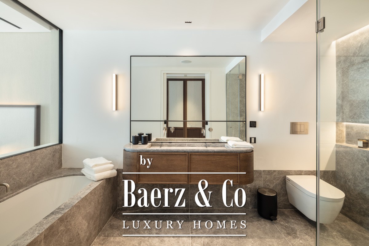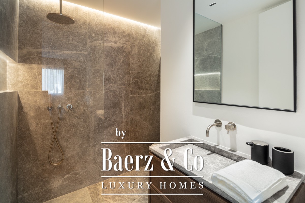 De keuken is afgewerkt met marmer en voorzien van verborgen inbouwapparatuur, ideaal voor zowel stijlvol entertainment als moeiteloos dagelijks wonen. Het overdekte, royale terras verlengt de leefruimte naar buiten voor diners en ontspanning in de frisse lucht, met directe toegang vanaf de master suite en de woonkamer. Elk van de drie slaapkamers beschikt over een eigen en-suite badkamer, afgewerkt met de mooiste materialen. De master suite, voorzien van een privacy glaswand en dubbele wastafel van grijs steen, biedt een discrete plek om te ontspannen.