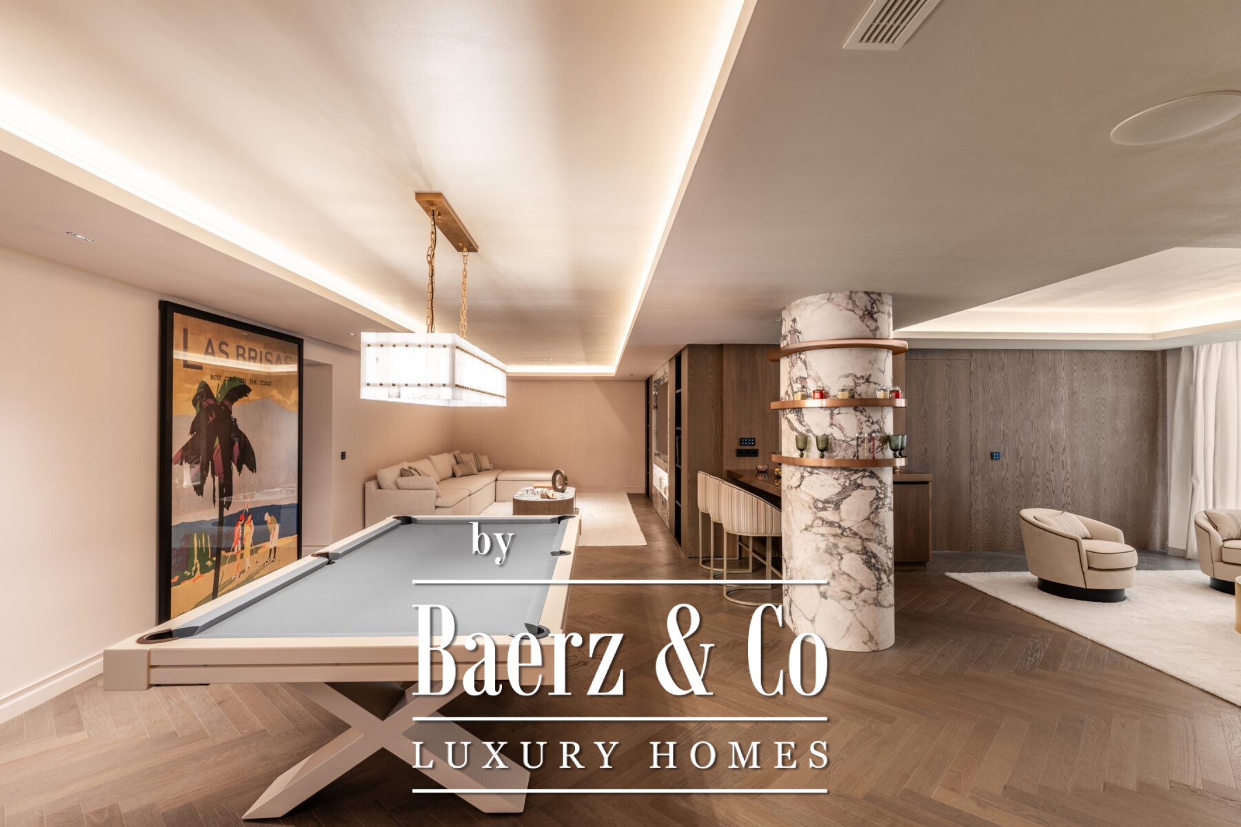 In het souterrain van 250 m² zorgen hoge plafonds voor een gevoel van ruimte, waar ontspanning en recreatie samenkomen. Dit niveau biedt een privébioscoop, een spa met sauna en stoombad, een volledig uitgeruste fitnessruimte en een wijnbodega. De royale en zorgvuldig ingerichte garage is voorzien van een draaitafel voor auto’s, wat zorgt voor een moeiteloze overgang tussen interieur en de rustige, aangelegde tuin.