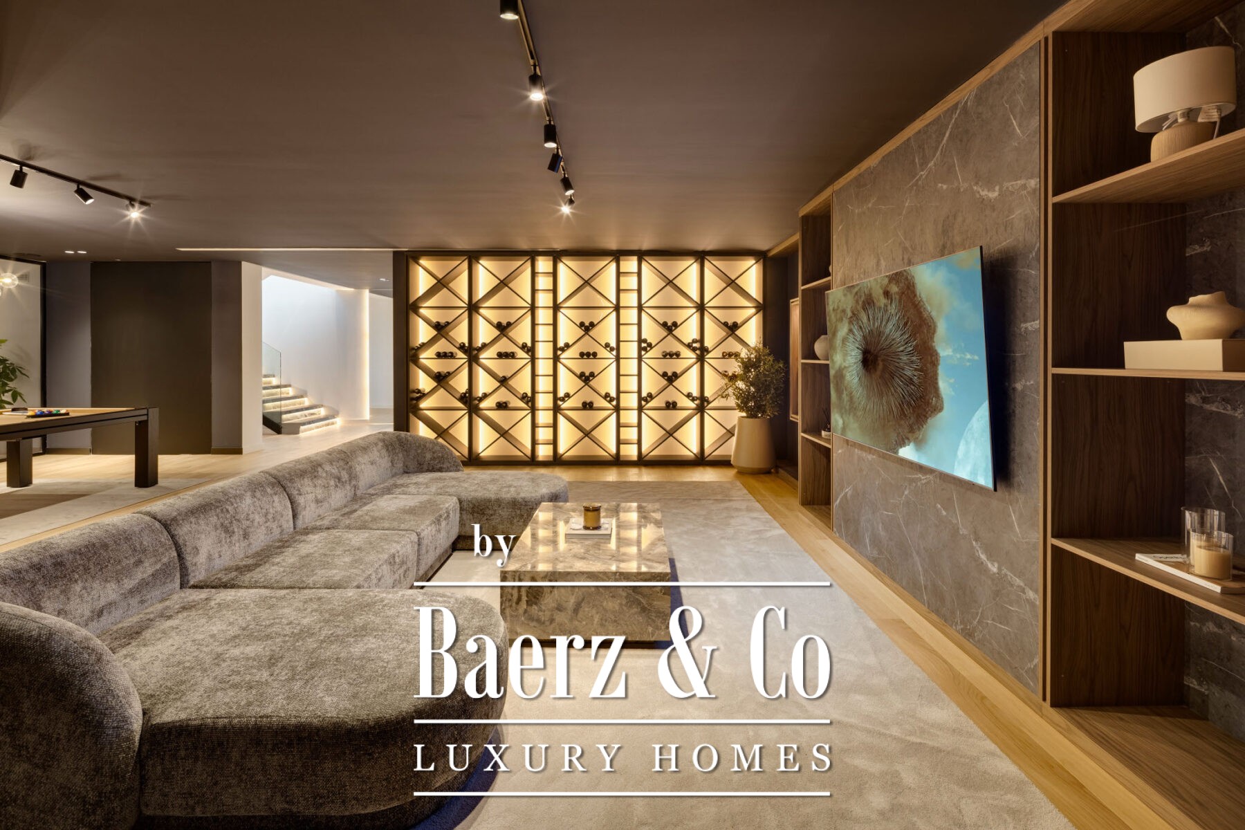 Het interieur onderscheidt zich door hoogwaardige eiken vloeren, grootformaat porseleinen tegels en de nieuwste apparatuur van Gaggenau en Siemens. Voor ontspanning is er een privé verwarmd zwembad, een eigen bioscoop en een gym. De garage voldoet aan de moderne eisen. De villa wordt volledig gemeubileerd in een hedendaagse stijl aangeboden, met de mogelijkheid het meubilair apart aan te schaffen voor €250.000.